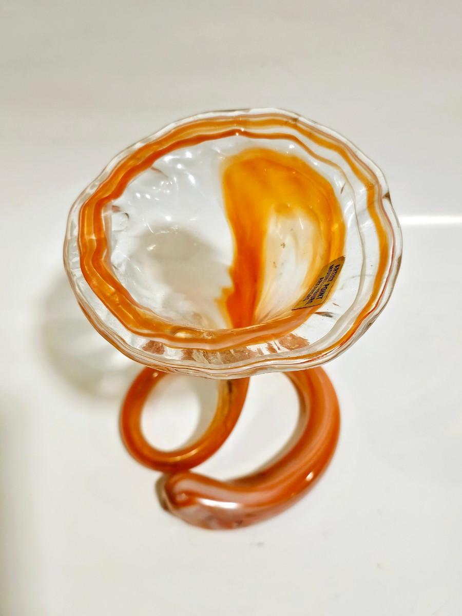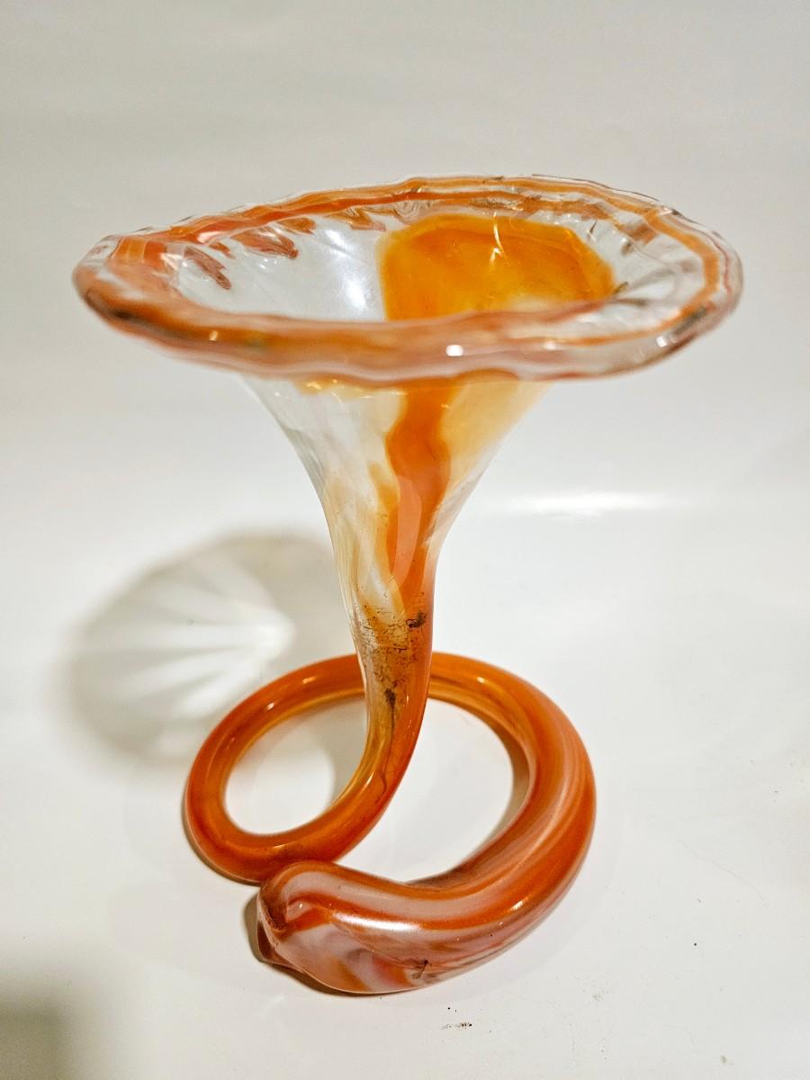 Blown glass vase curved into a spiral with a beautiful orange stripe running through the glass with white, the details on this piece are stunning