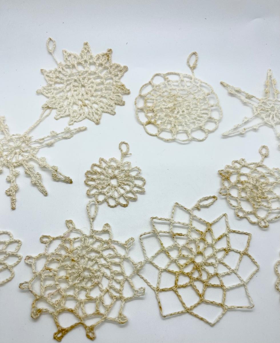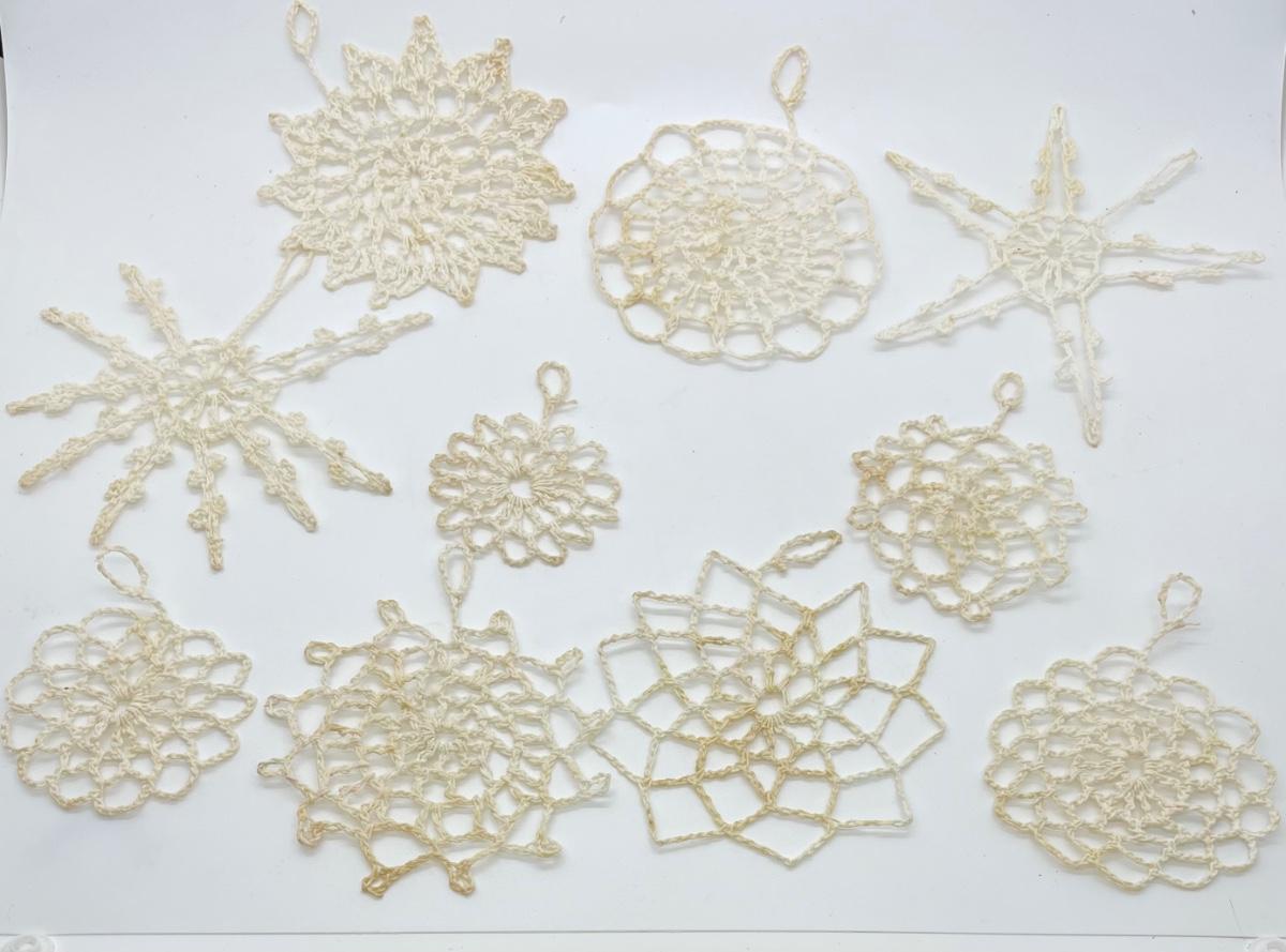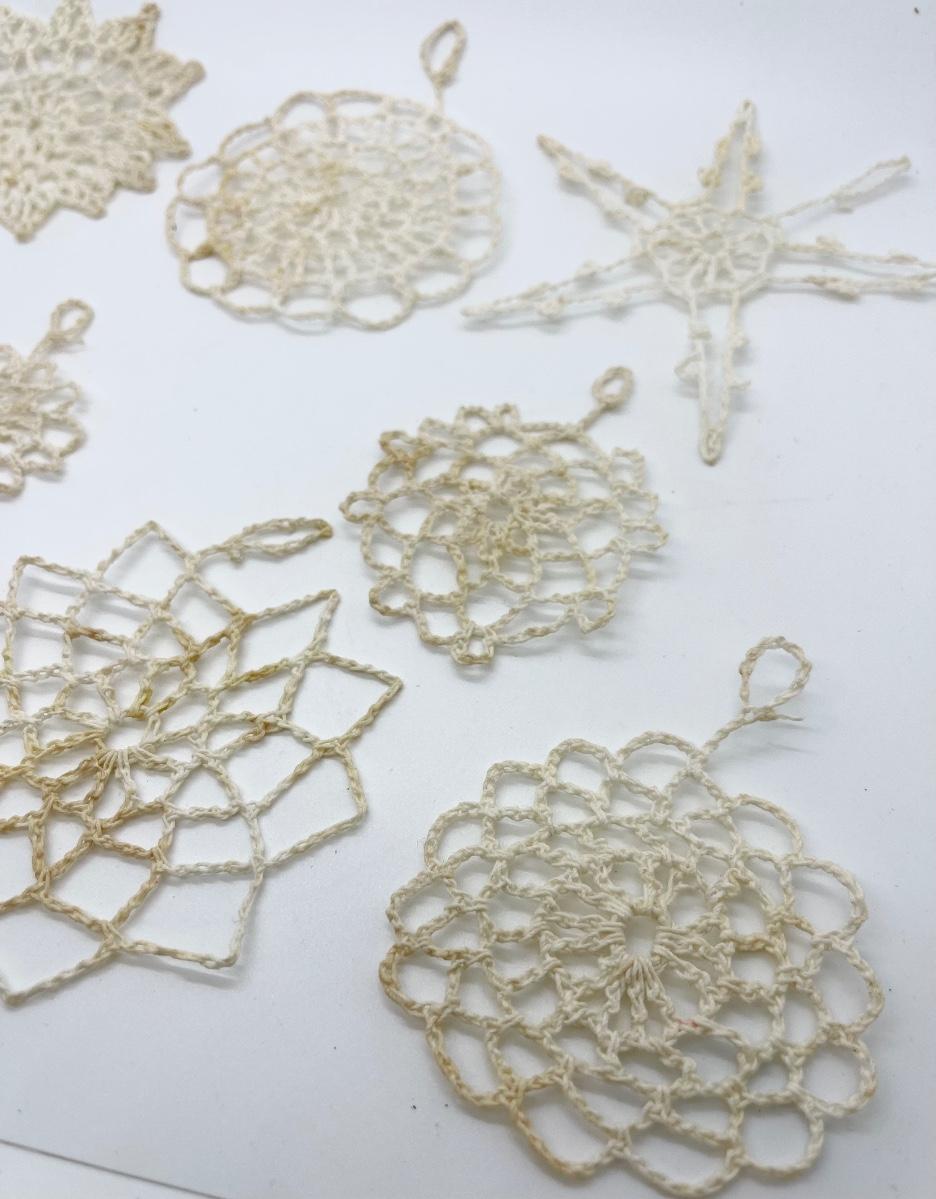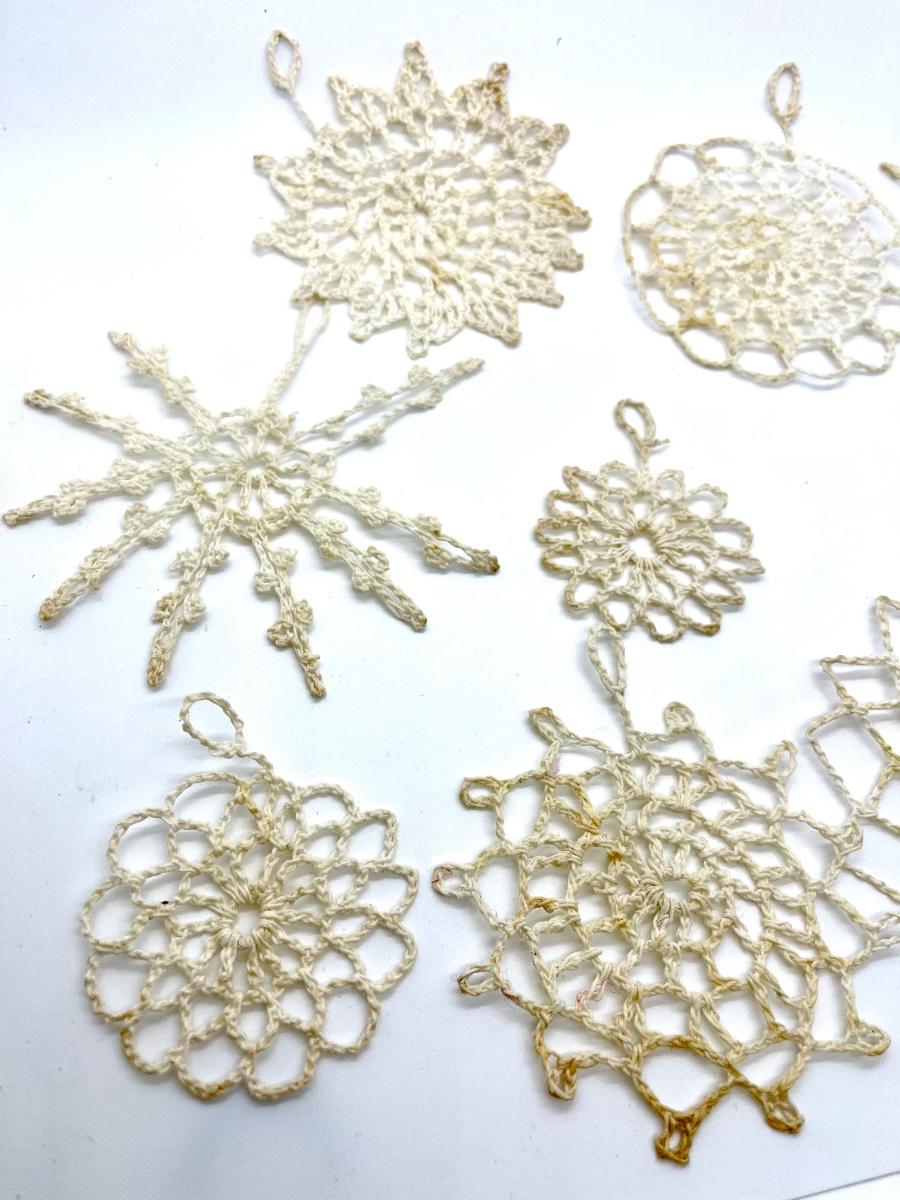 Look at these sweet handmade ornaments. What a beautiful addition to any tree during the Christmas season. These have yellowed over time but I’m