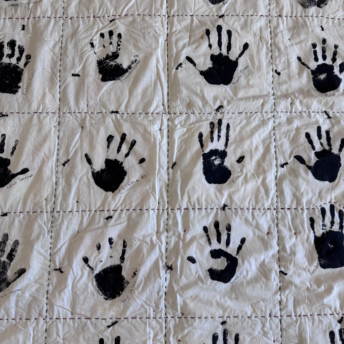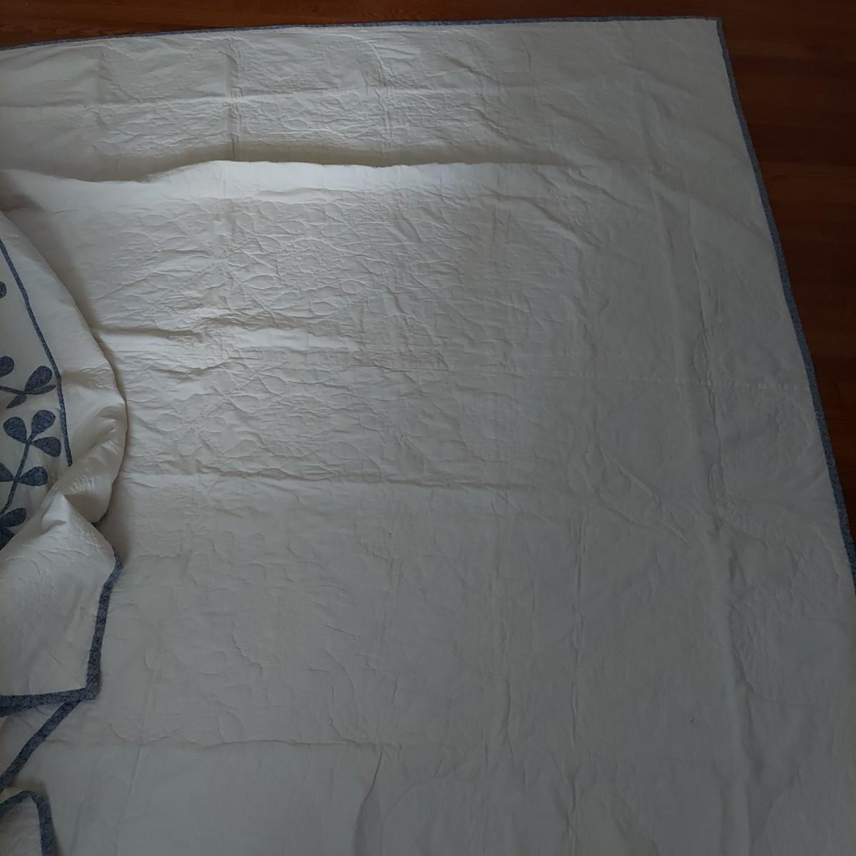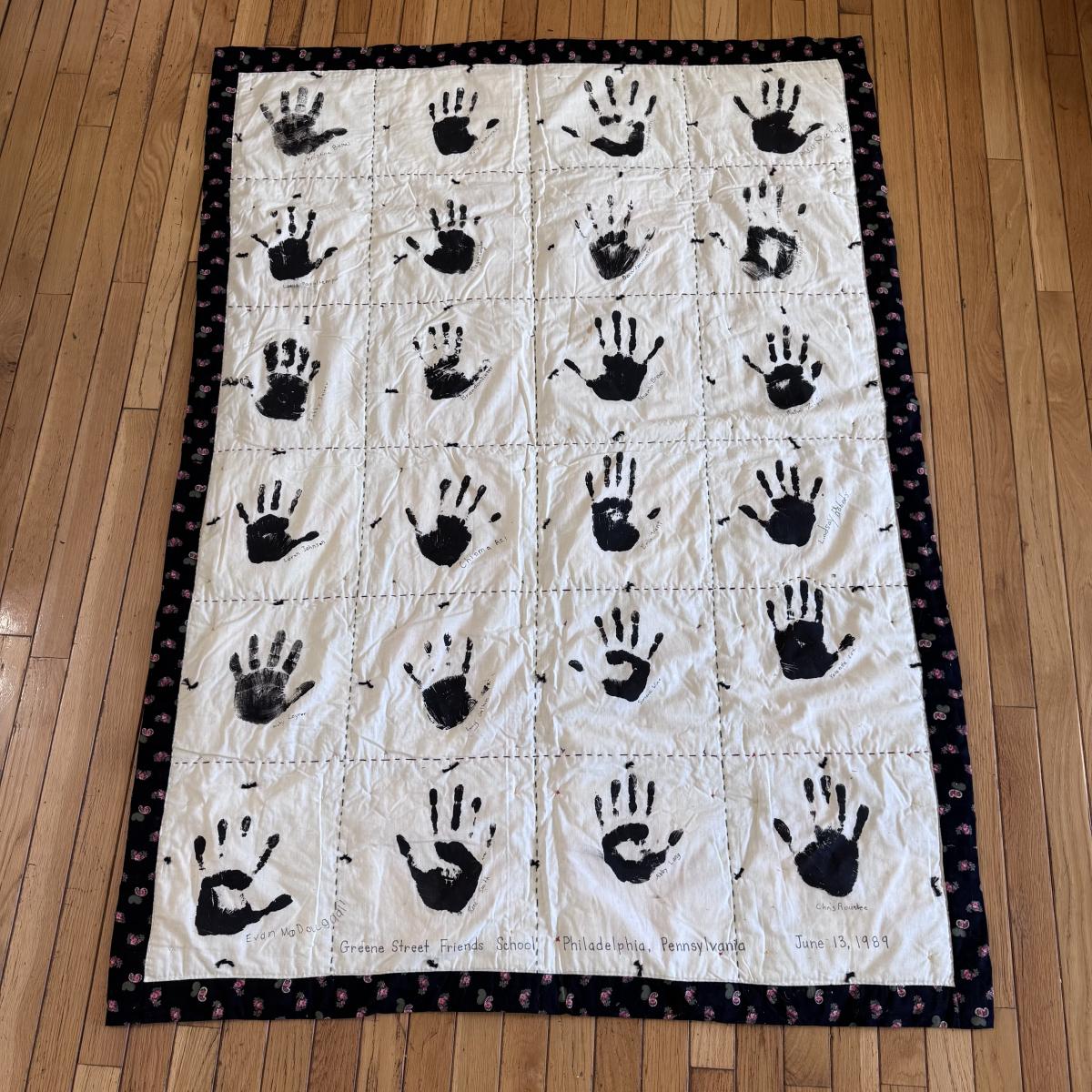 This lot includes one very sweet, handmade patchwork quilt from 1989. The quilt is multi-colored on the front, while the back has painted handprints and names from Greene Street Friends School. The quilt measures 43” x 59”H. Plus a second handmade quilt that's blue and white with a white backing. It appears to be a size full. Shipping available.