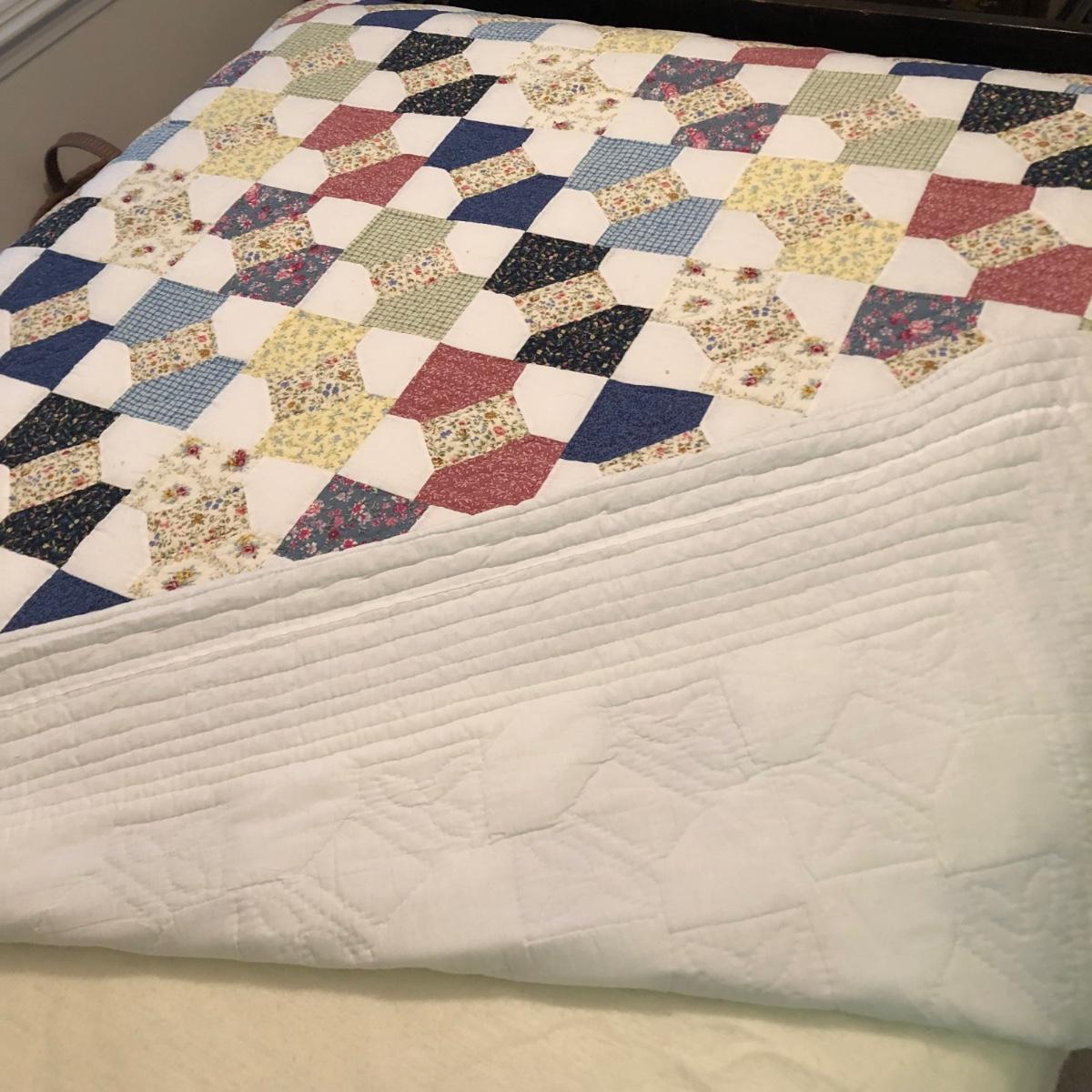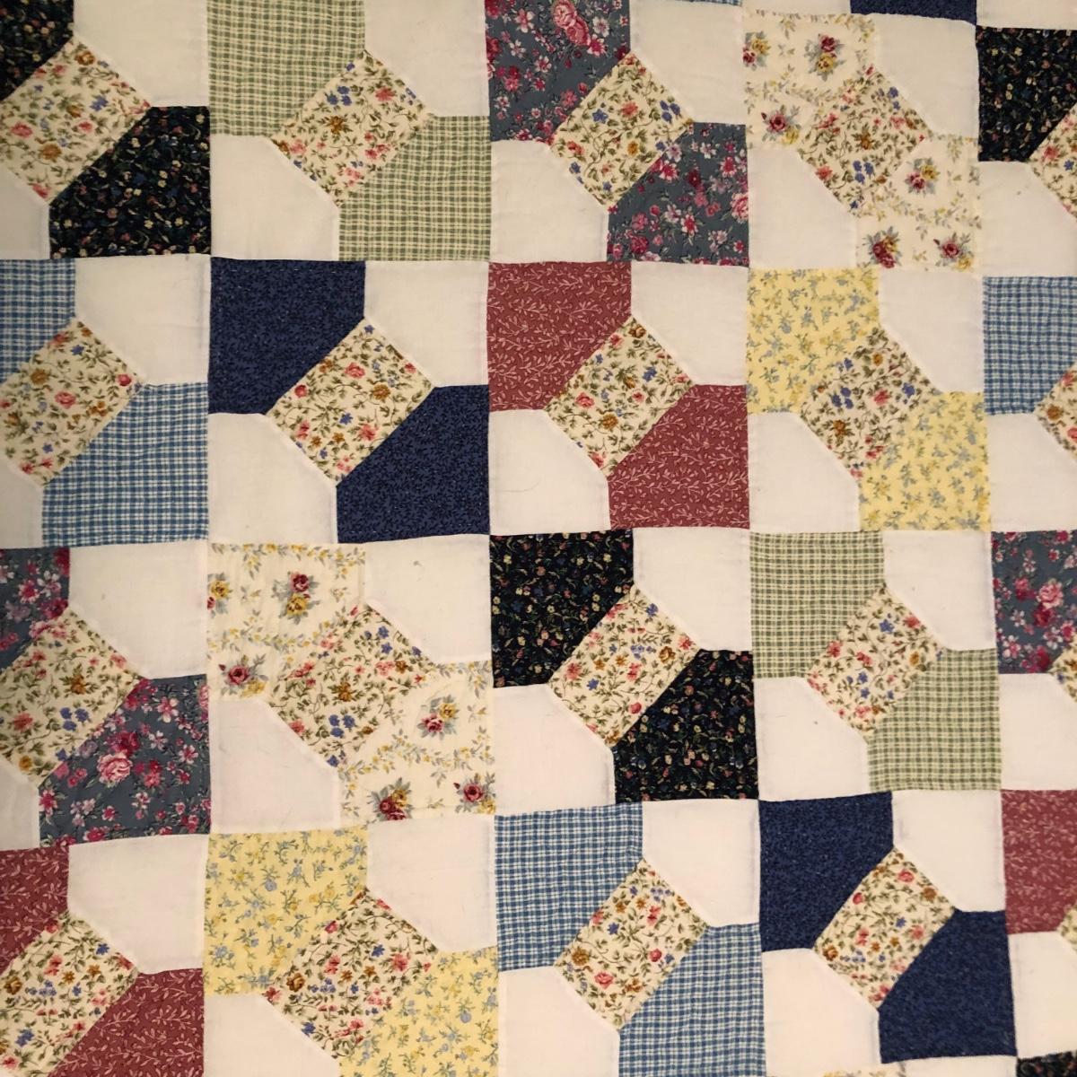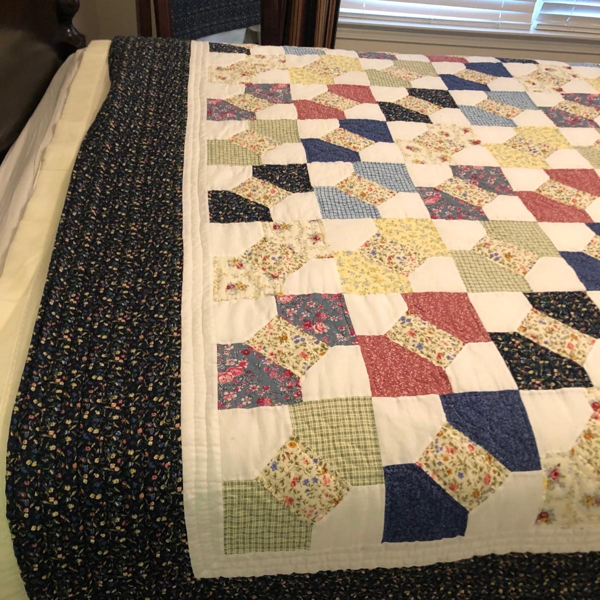 Photos taken on queen mattress, summer weight quilt. Floral print patches as well as plaid print patches. Back side has very unique stitch work. It is in good condition. Quilt measures 82” x 84”.