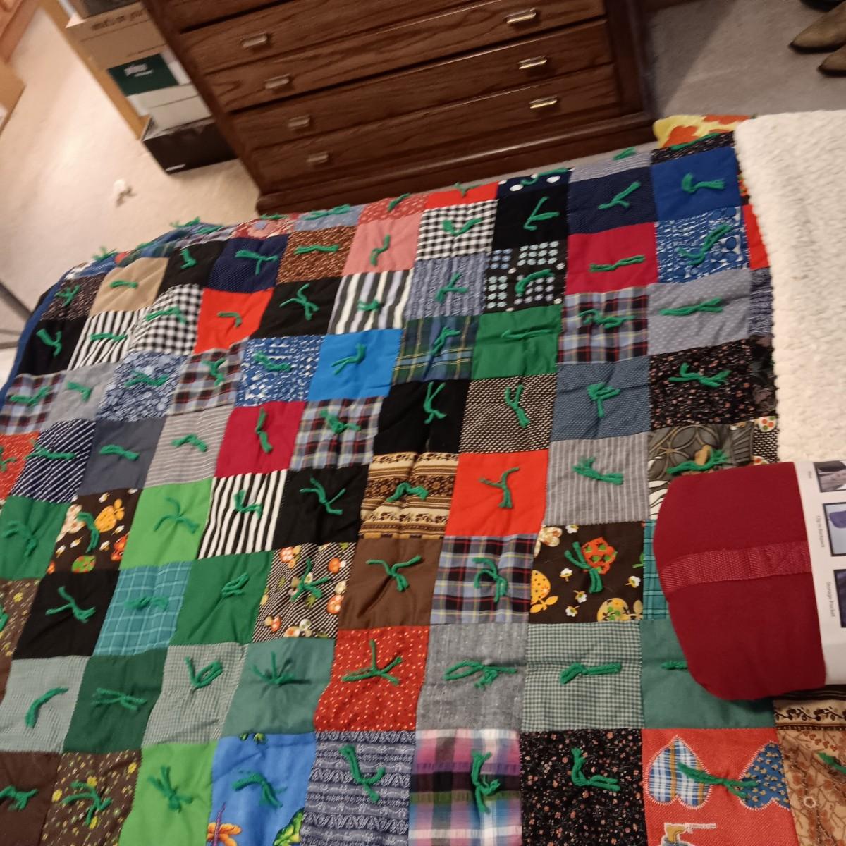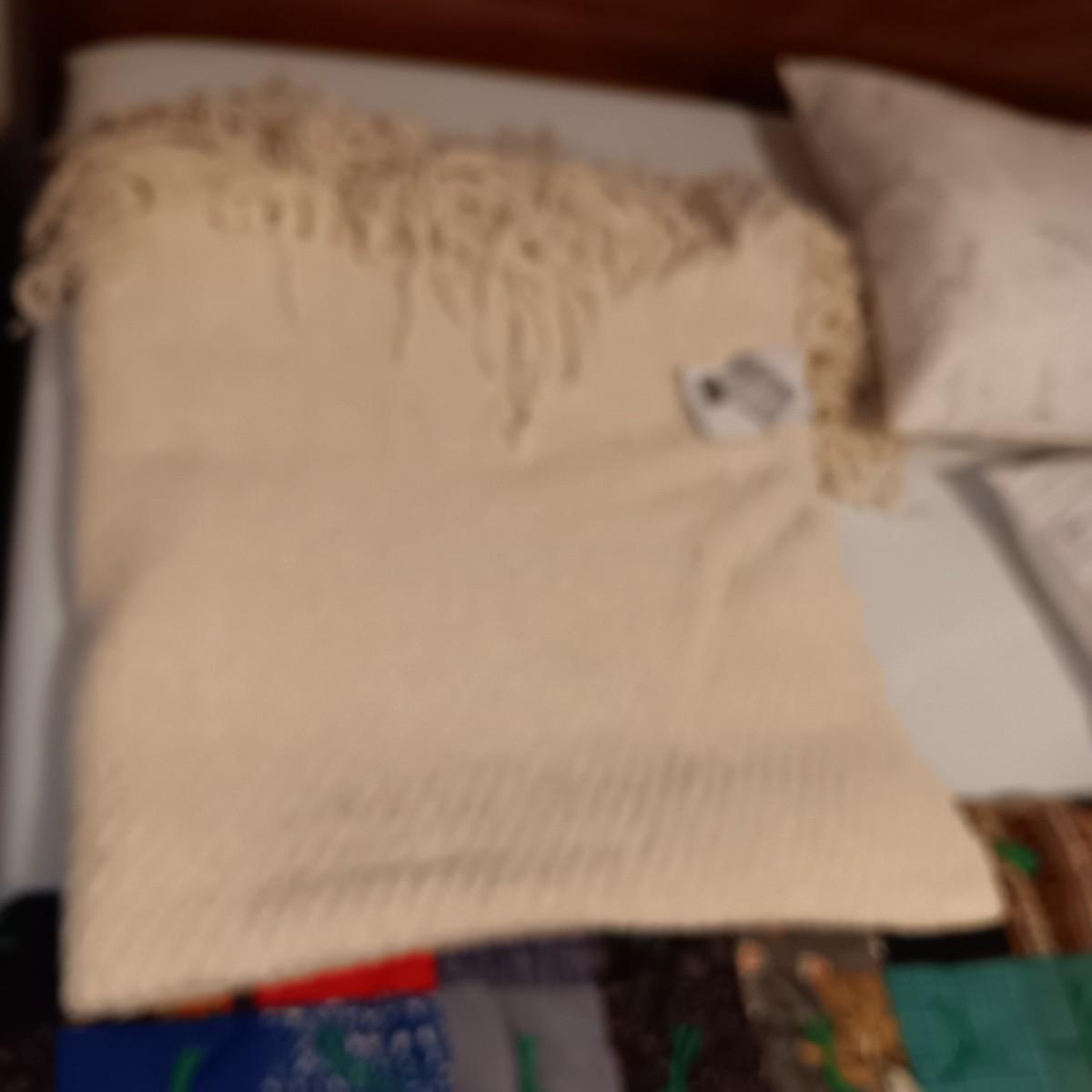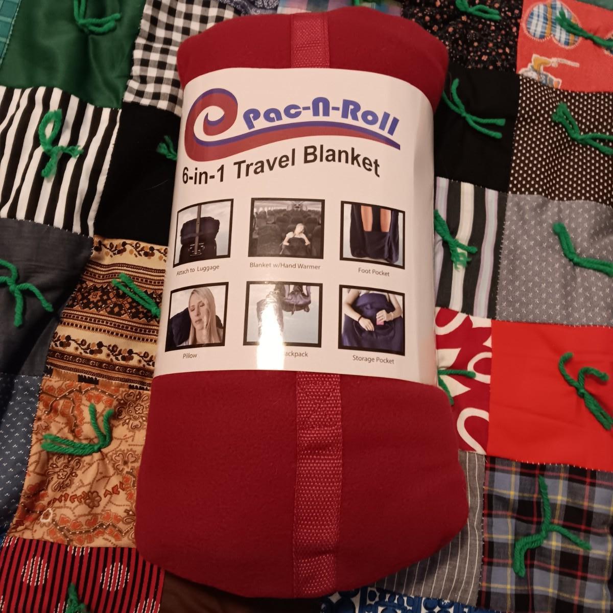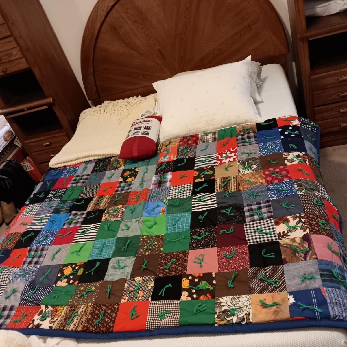 HANDMADE PATCHWORK QUILT QUEEN SIZE, 2 GOOSE DOWN PILLOWS, KNIT THROW AND A NEW 6 IN 1 TRAVEL BLANKET