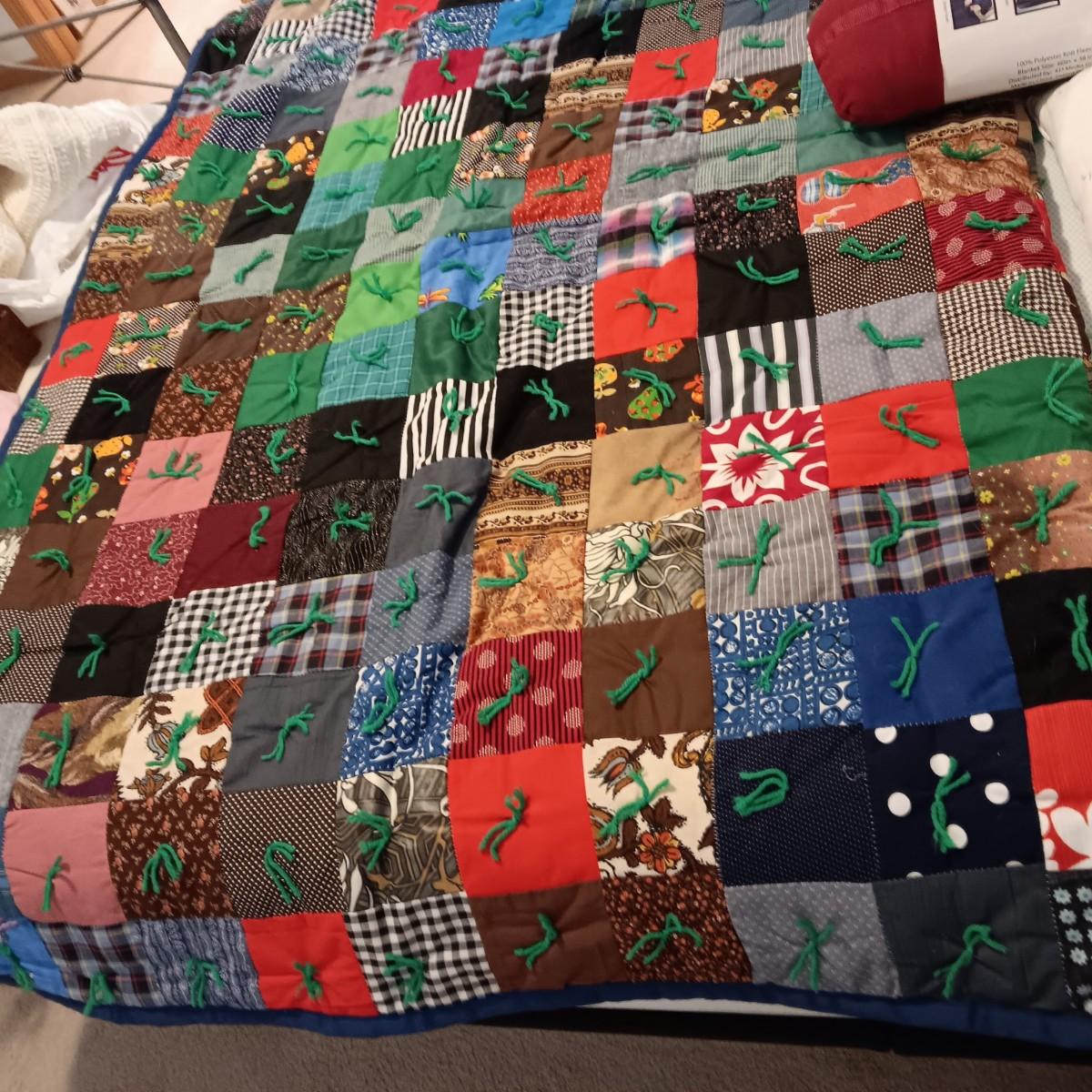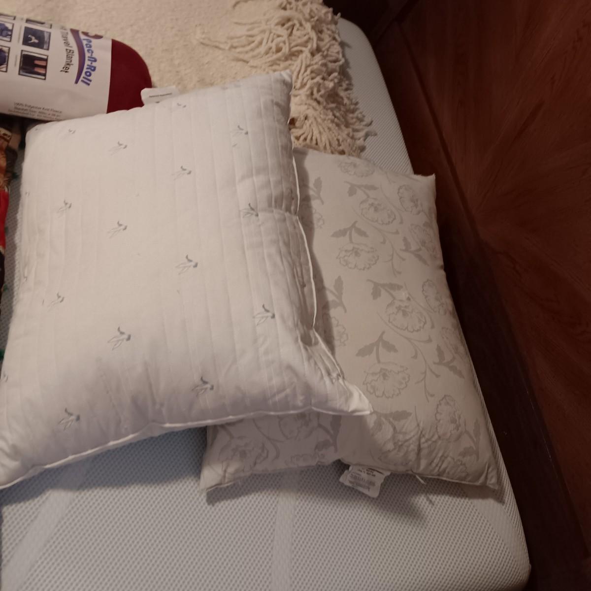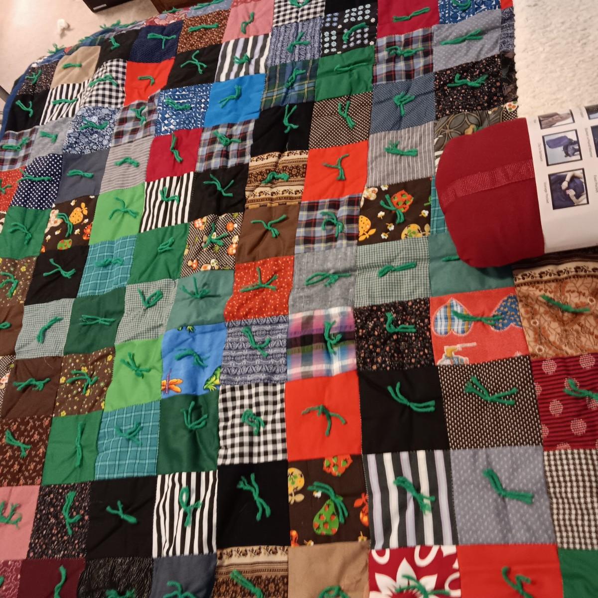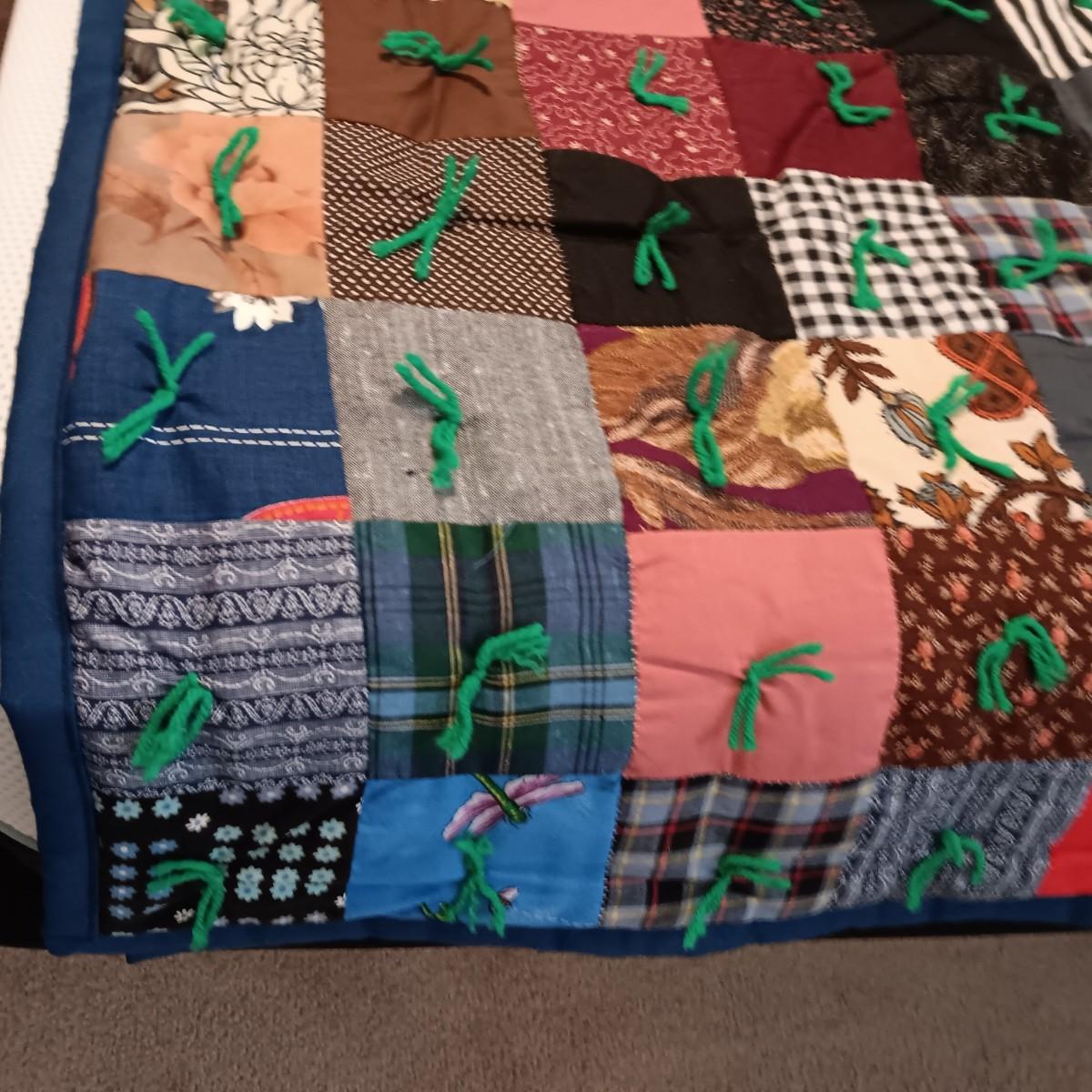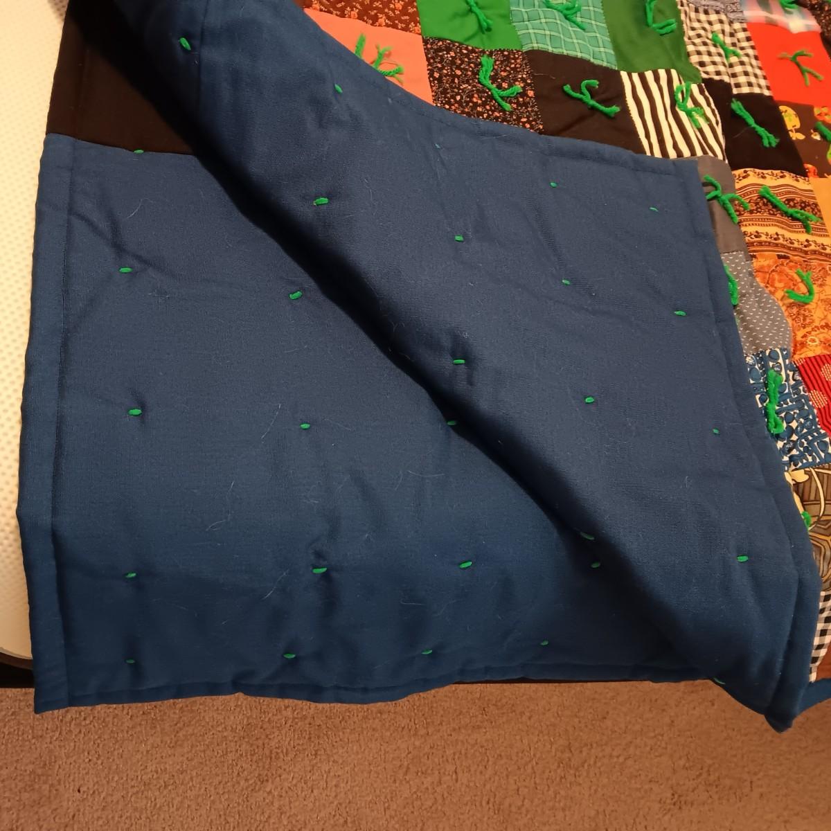 HANDMADE PATCHWORK QUILT QUEEN SIZE, 2 GOOSE DOWN PILLOWS, KNIT THROW AND A NEW 6 IN 1 TRAVEL BLANKET