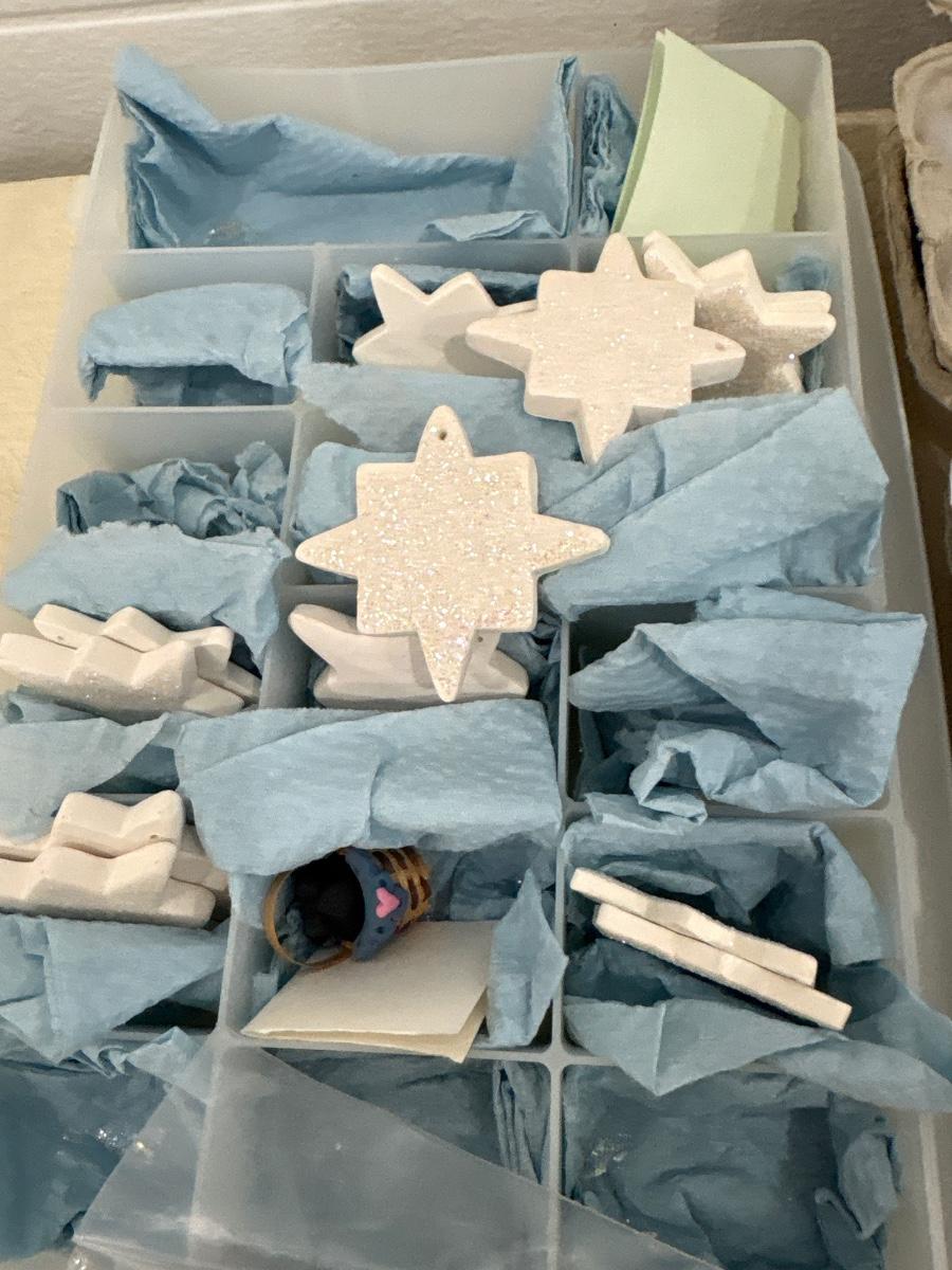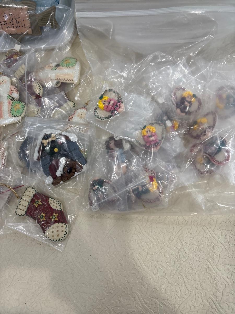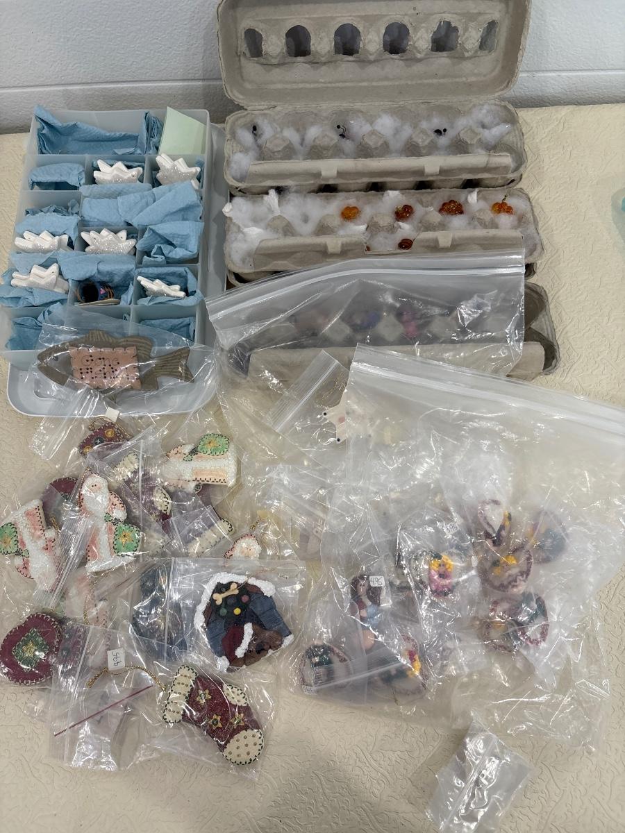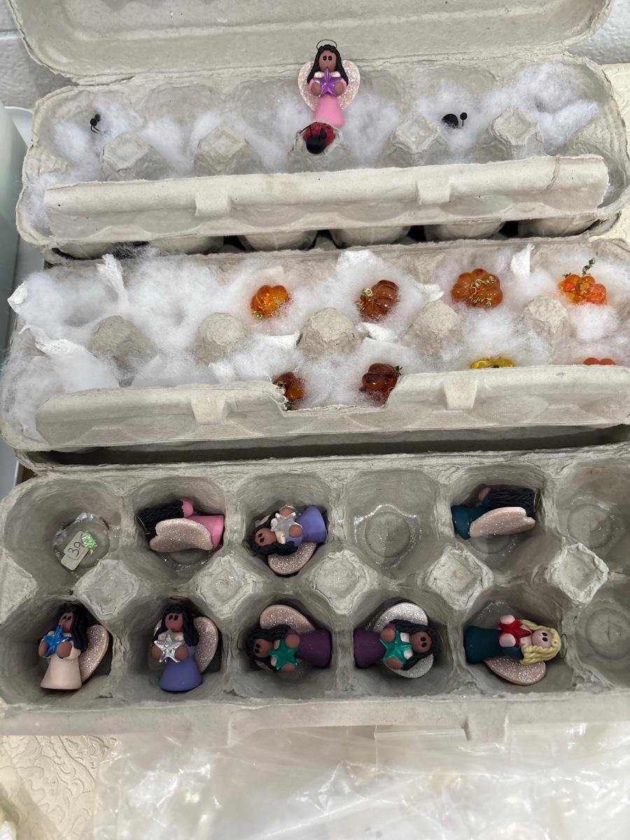 Assortment of handmade, polymer, clay, figurines, and ornaments and pins.