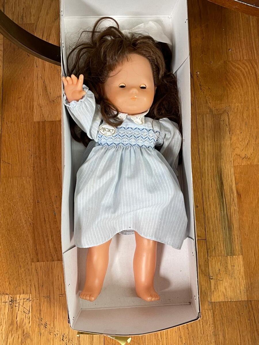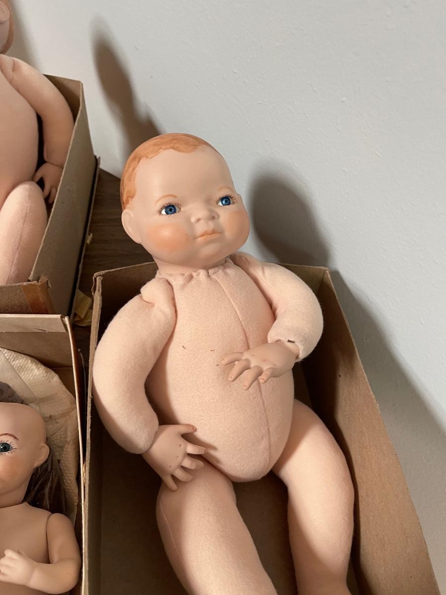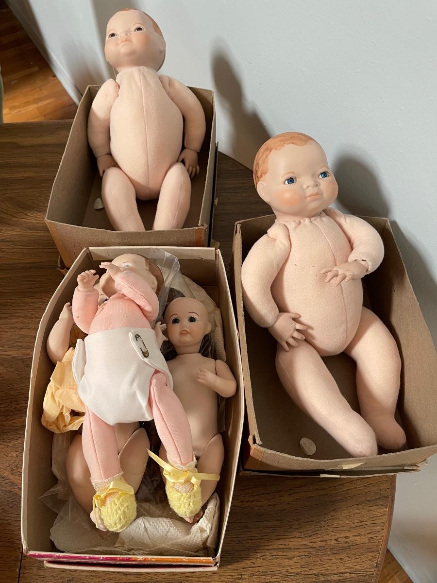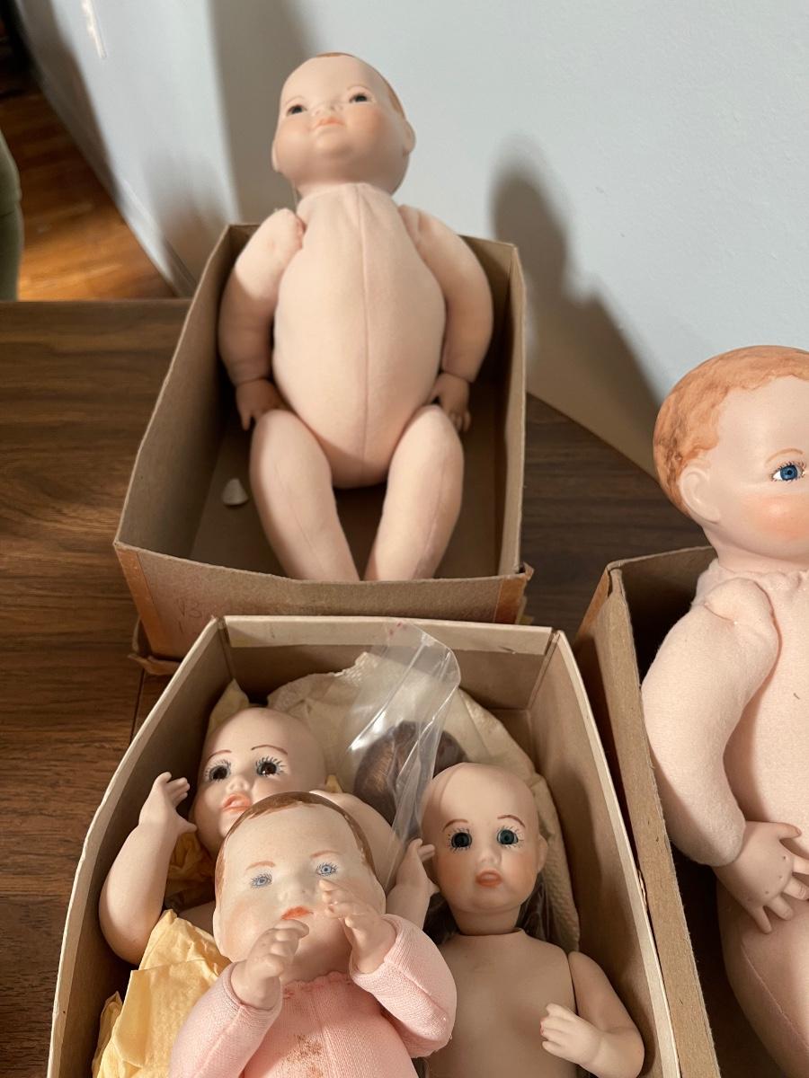 Porcelain dolls were handmade and painted by a local grandmother. The Corelle doll is in original box