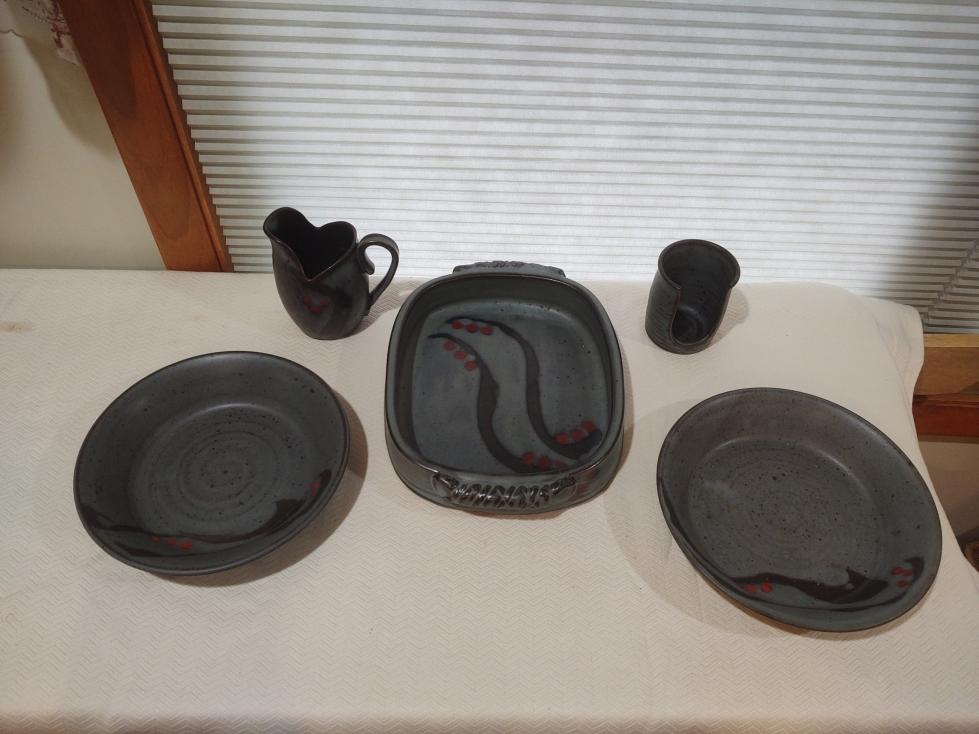 Made at Velda's Pottery. Casserole dish in the center is 12"x9"x2". Spoon rest is 4" tall. Gravy bowl is 5.5" tall. The two bowls are 9"x2".