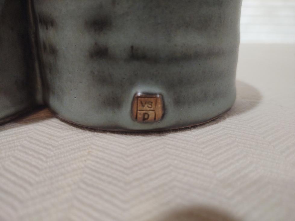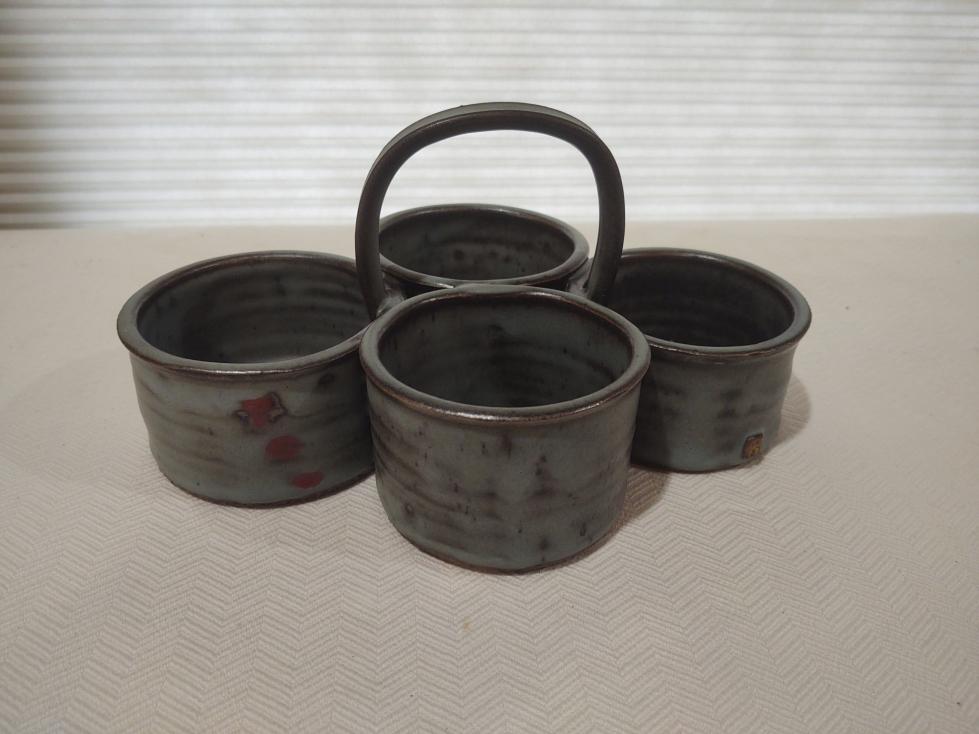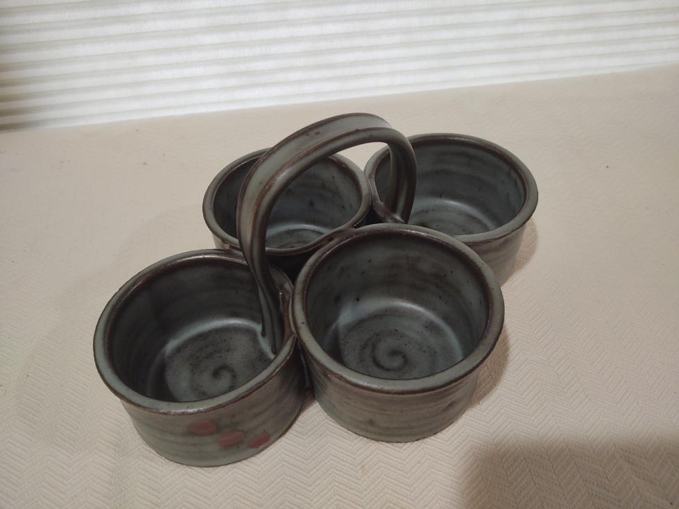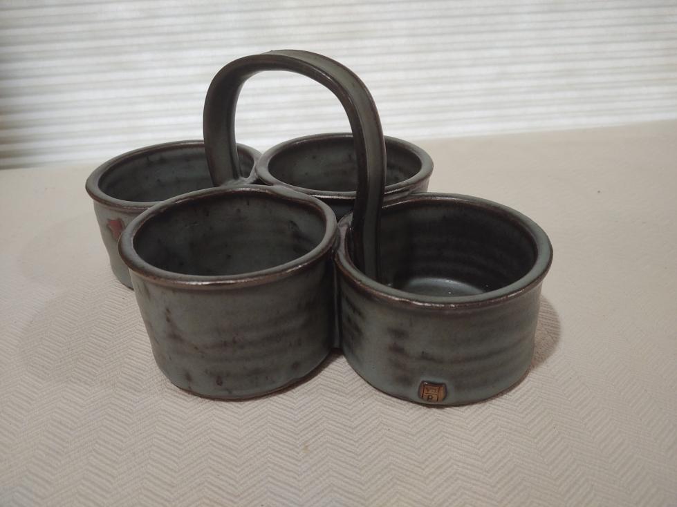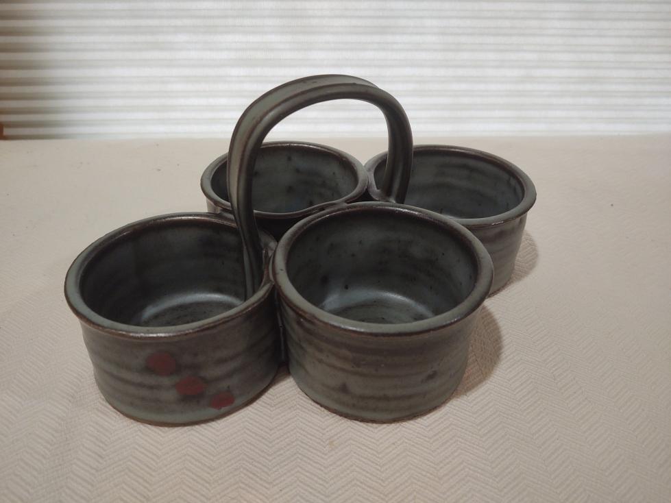 Made at Velda's pottery. We think this is a 4 cup condiment holder for a dining room table.