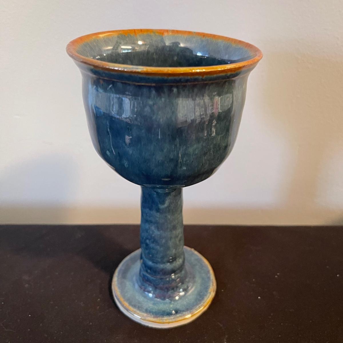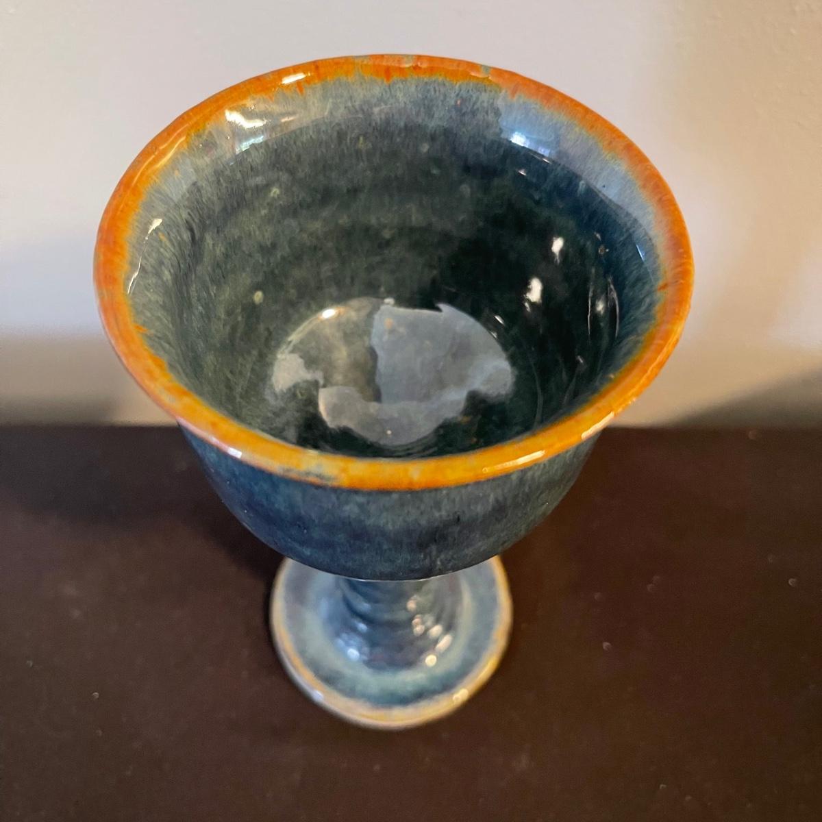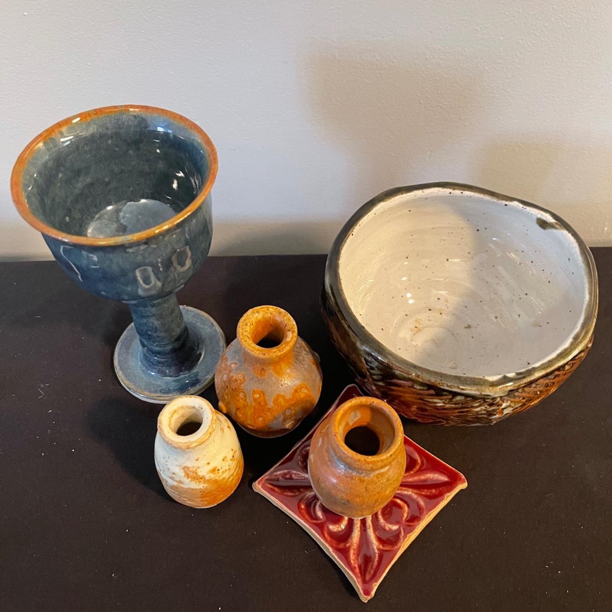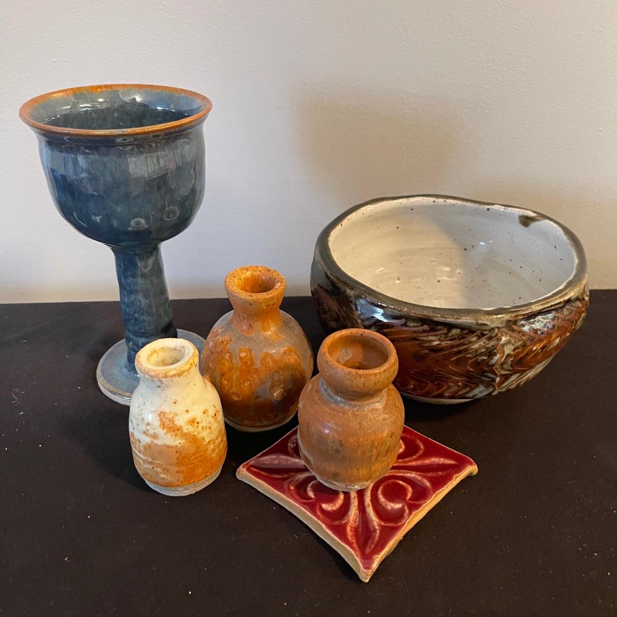 Collection of handmade pottery including a chalice, a soup bowl, three small jars, and a small tile. Each item has a signature. The chalice measures 3.5” (cup diameter) and 6.5” tall.