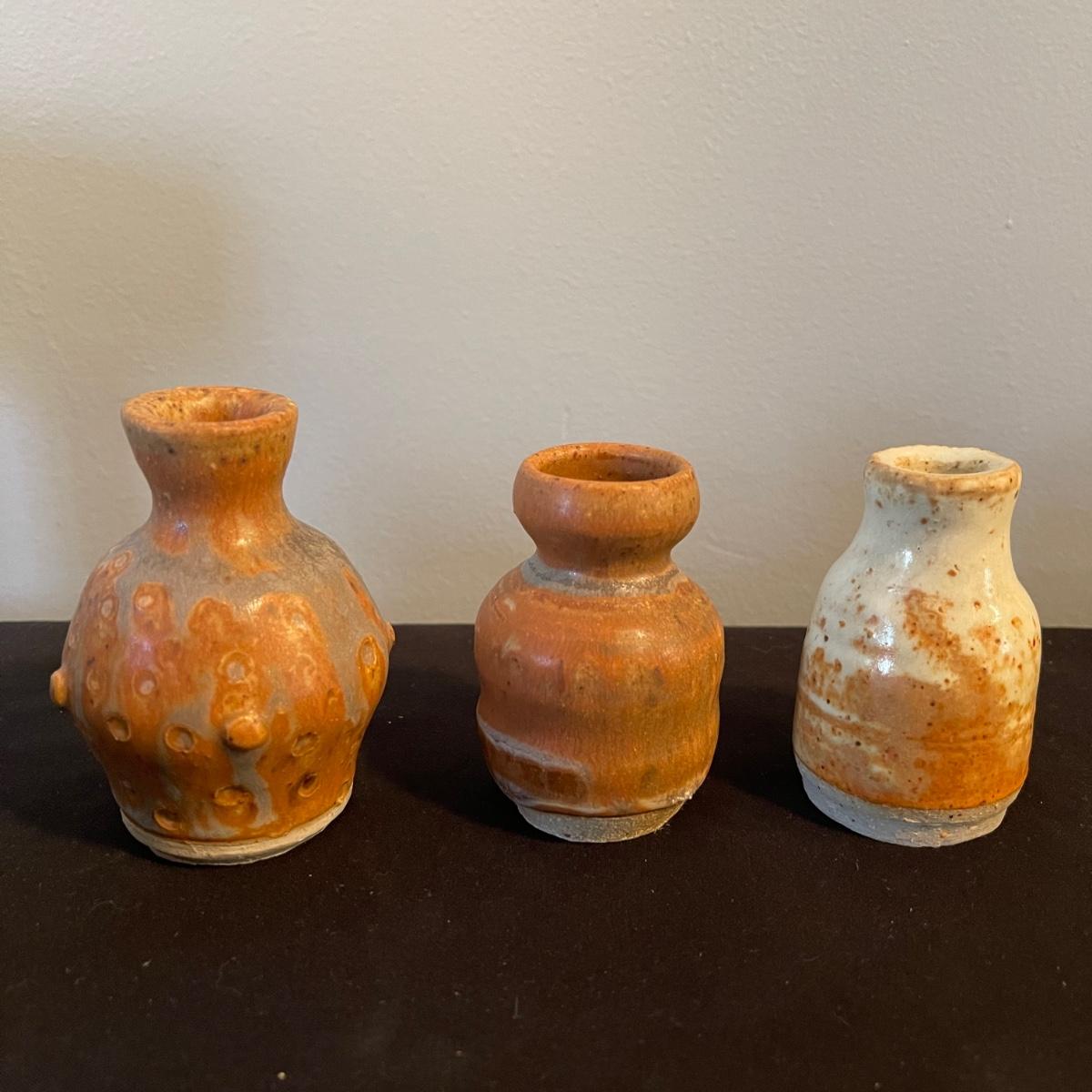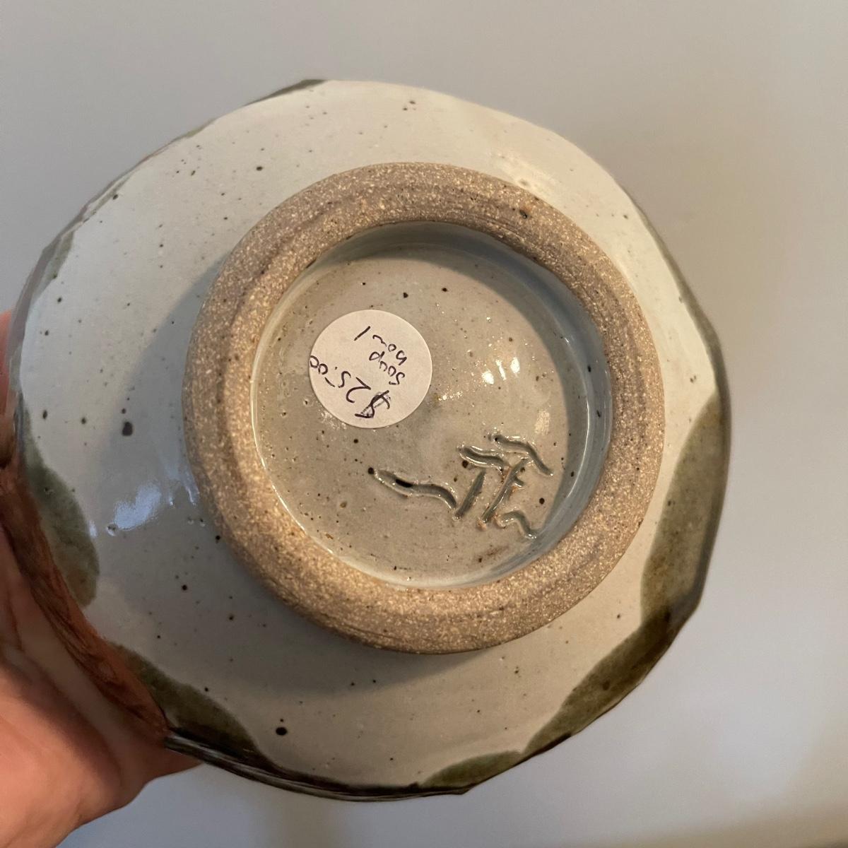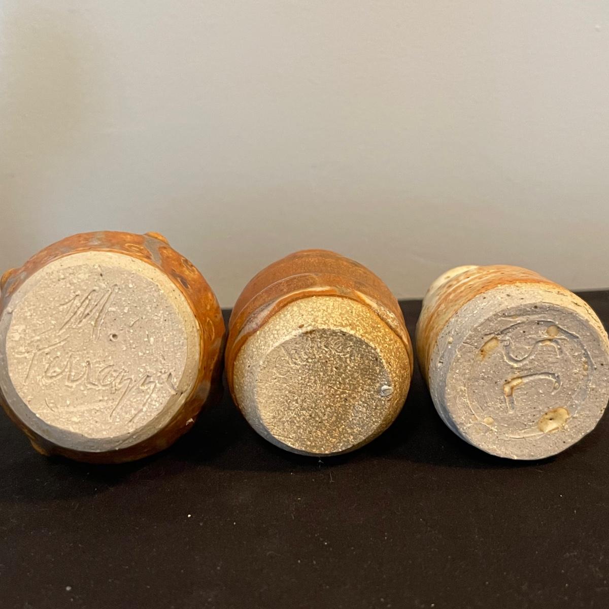 Collection of handmade pottery including a chalice, a soup bowl, three small jars, and a small tile. Each item has a signature. The chalice measures 3.5” (cup diameter) and 6.5” tall.