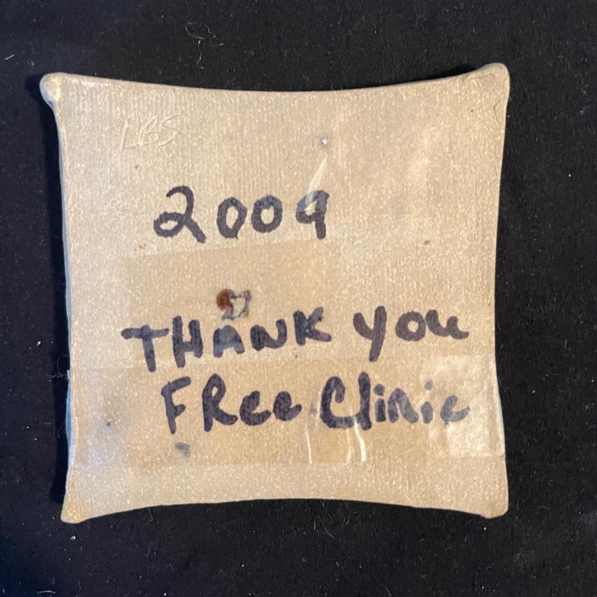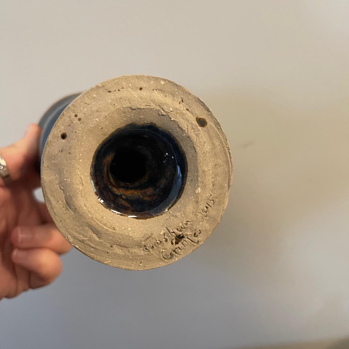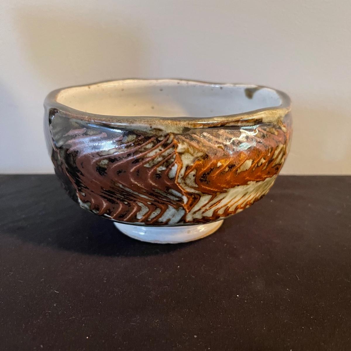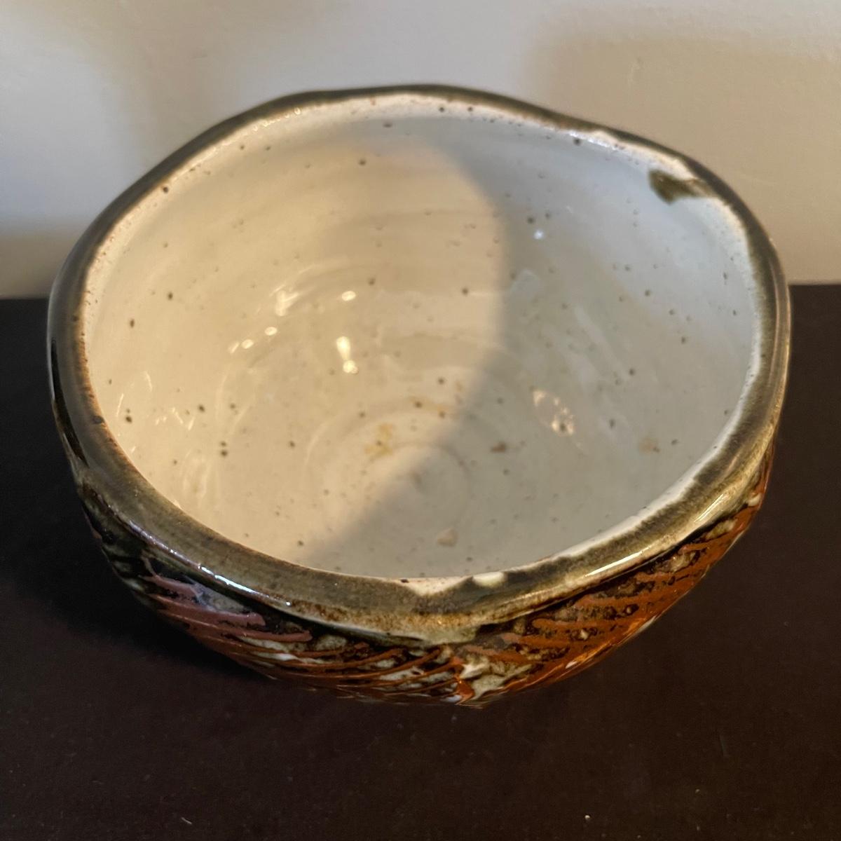 Collection of handmade pottery including a chalice, a soup bowl, three small jars, and a small tile. Each item has a signature. The chalice measures 3.5” (cup diameter) and 6.5” tall.