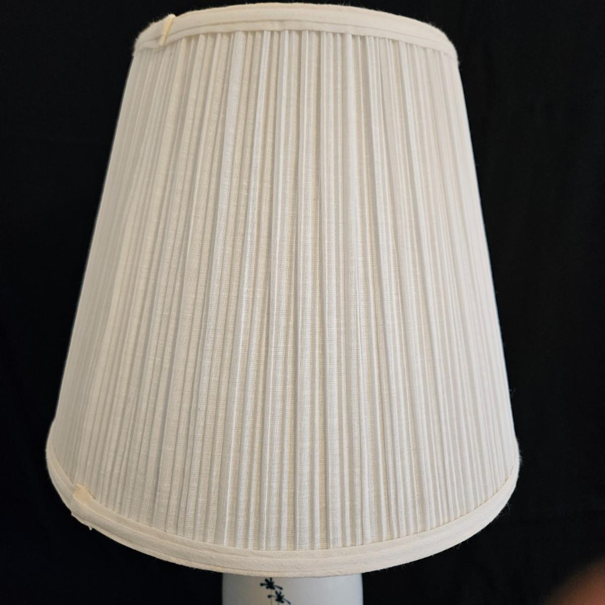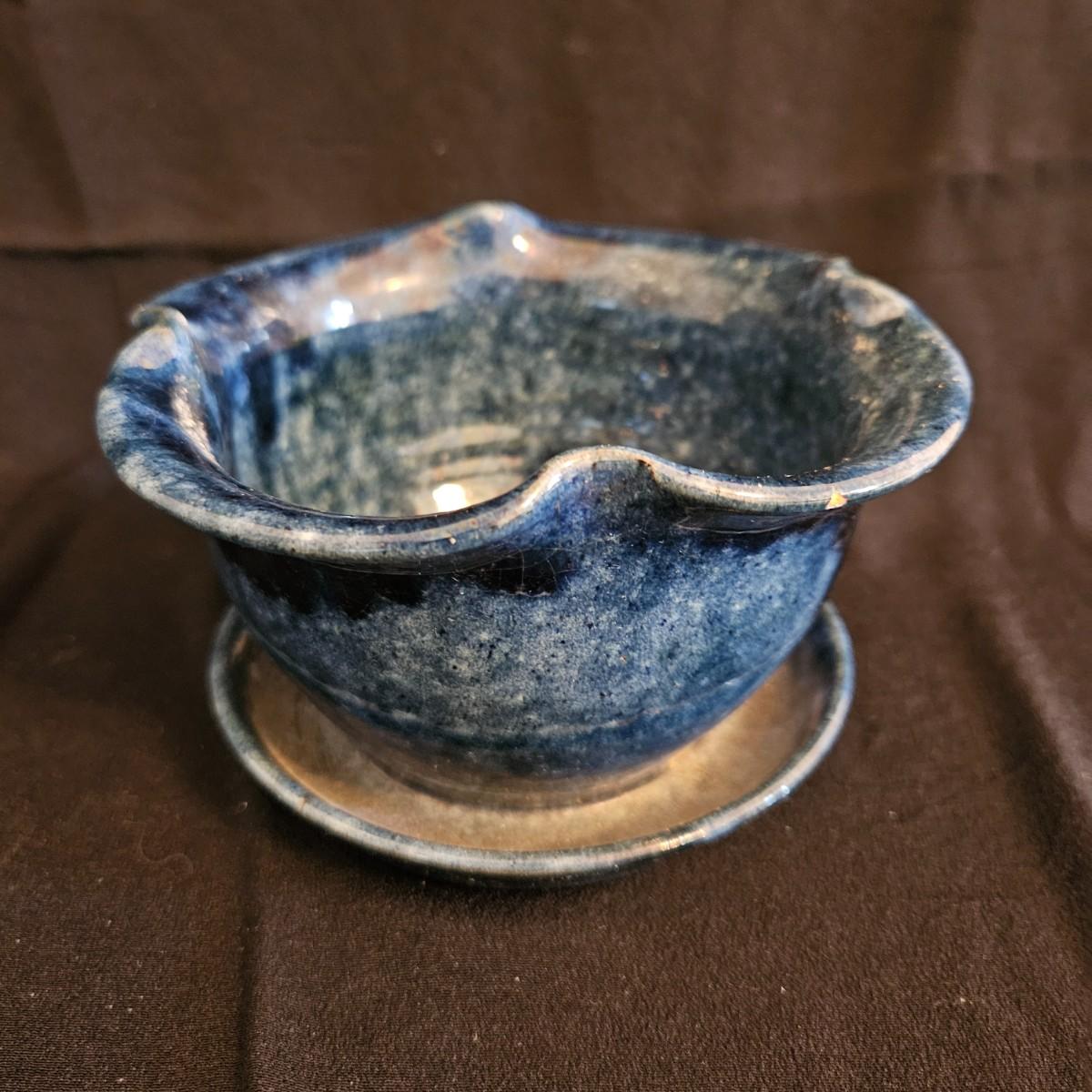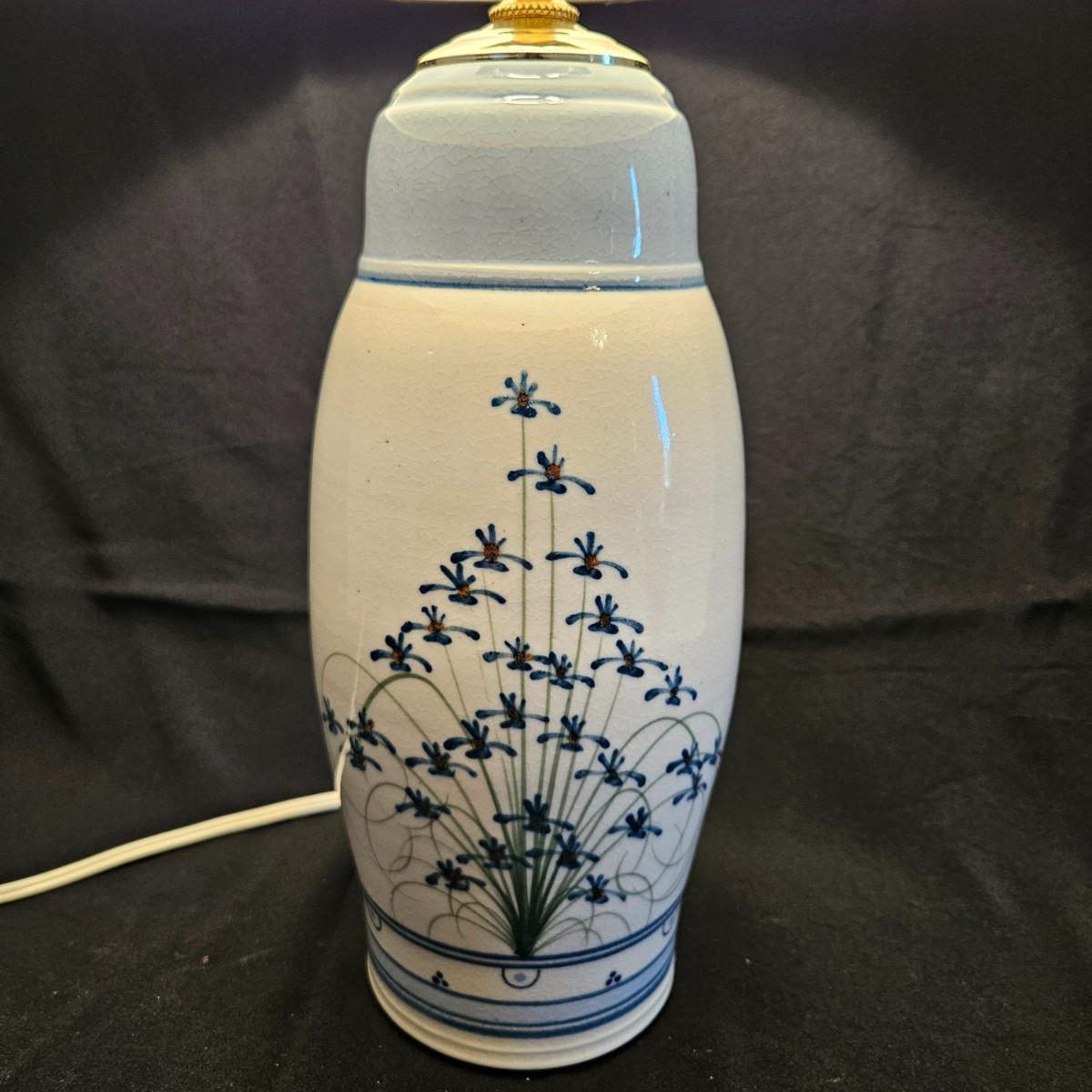 A trio of handmade pottery pieces. Included is a lamp with a floral design that is signed and powered on when plugged in. It measures approximately 12"D x 21"H including the shade and has a two way on/off switch. Also included is a small bowl from Blue Moon Pottery and a small planter that is signed. Shipping available