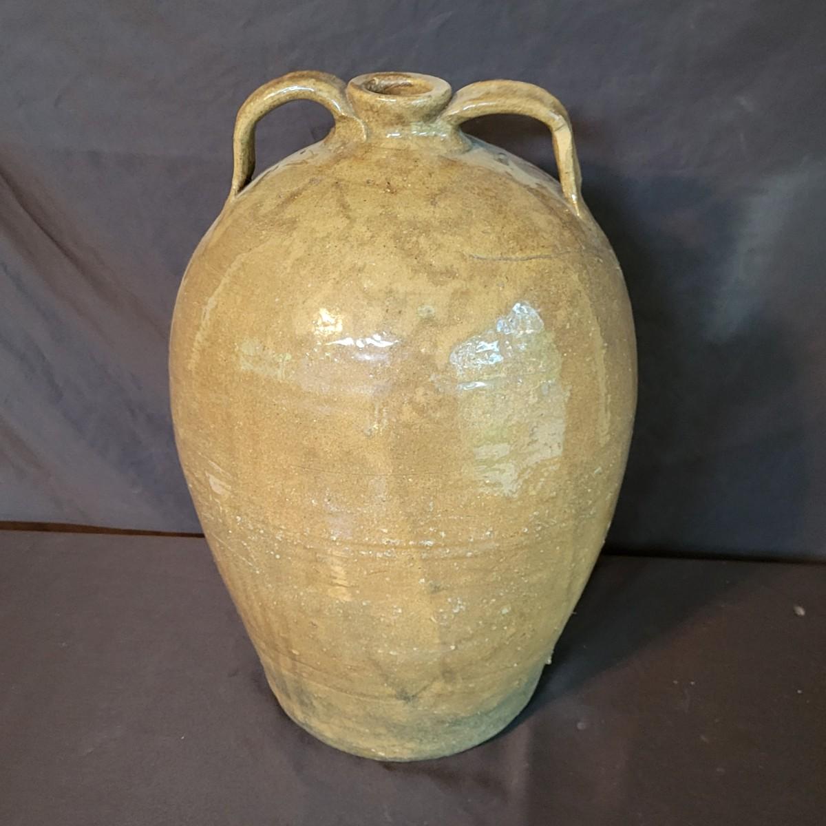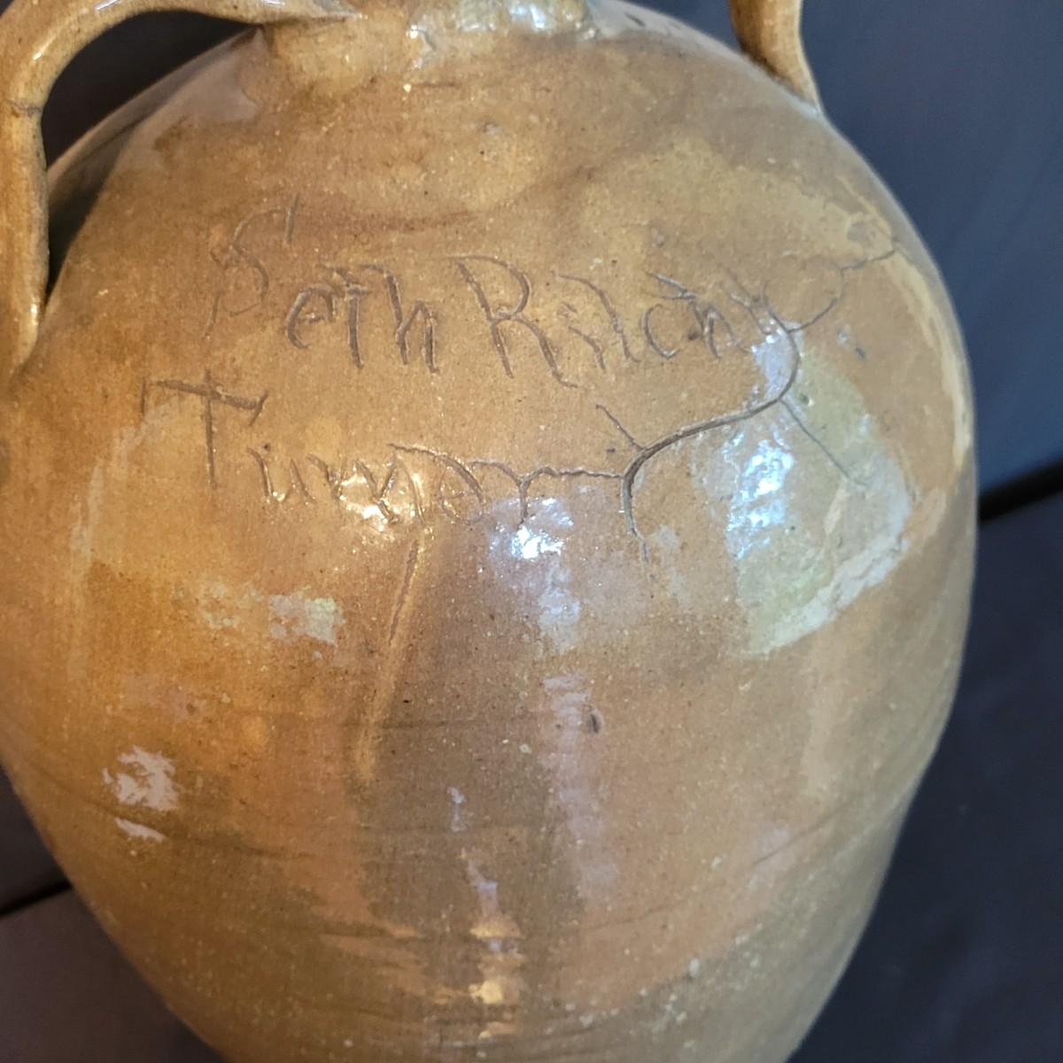 A handmade pottery vase with an earth tone glaze. It has the words "Seth Ritch Tumor" in it and what appears to be intentional cracking on its exterior. Measures 9” x 18.5”H. Shipping available