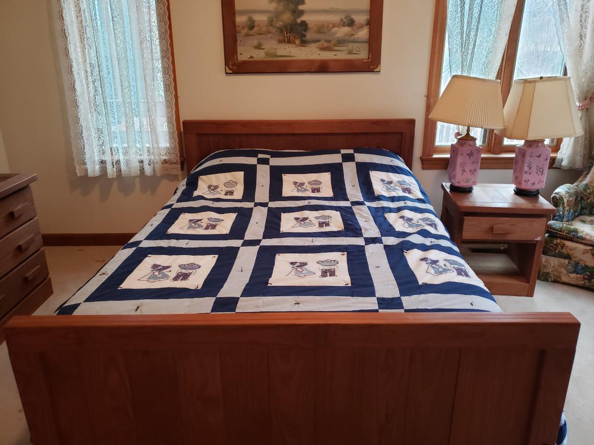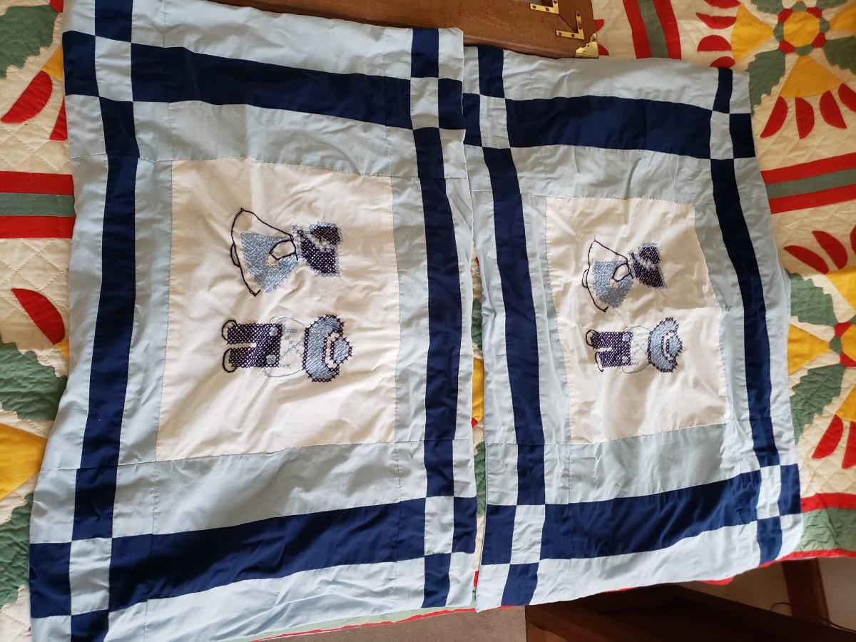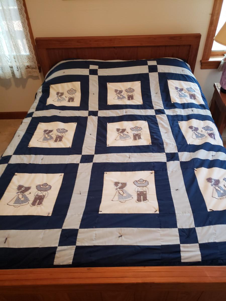 This quilt is laying on a queen size bed. The characters resemble the Holly Hobbie children, but there are some differences. The quilt is very clean and not worn. A pair of matching pillow cases included. Measures 94x96.