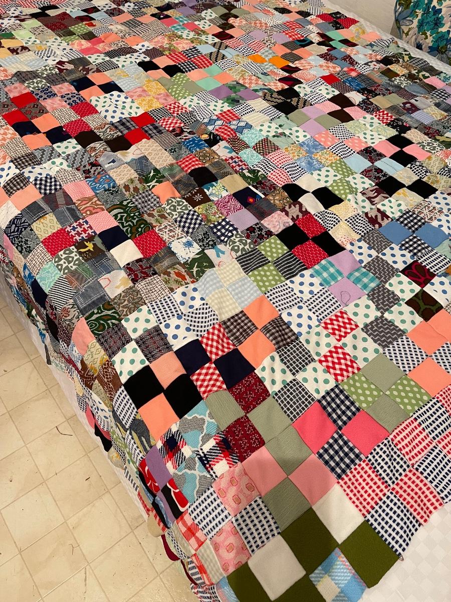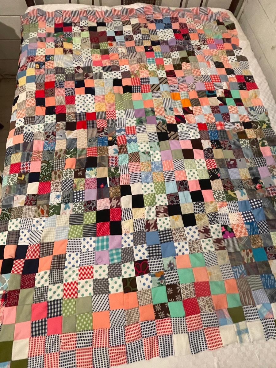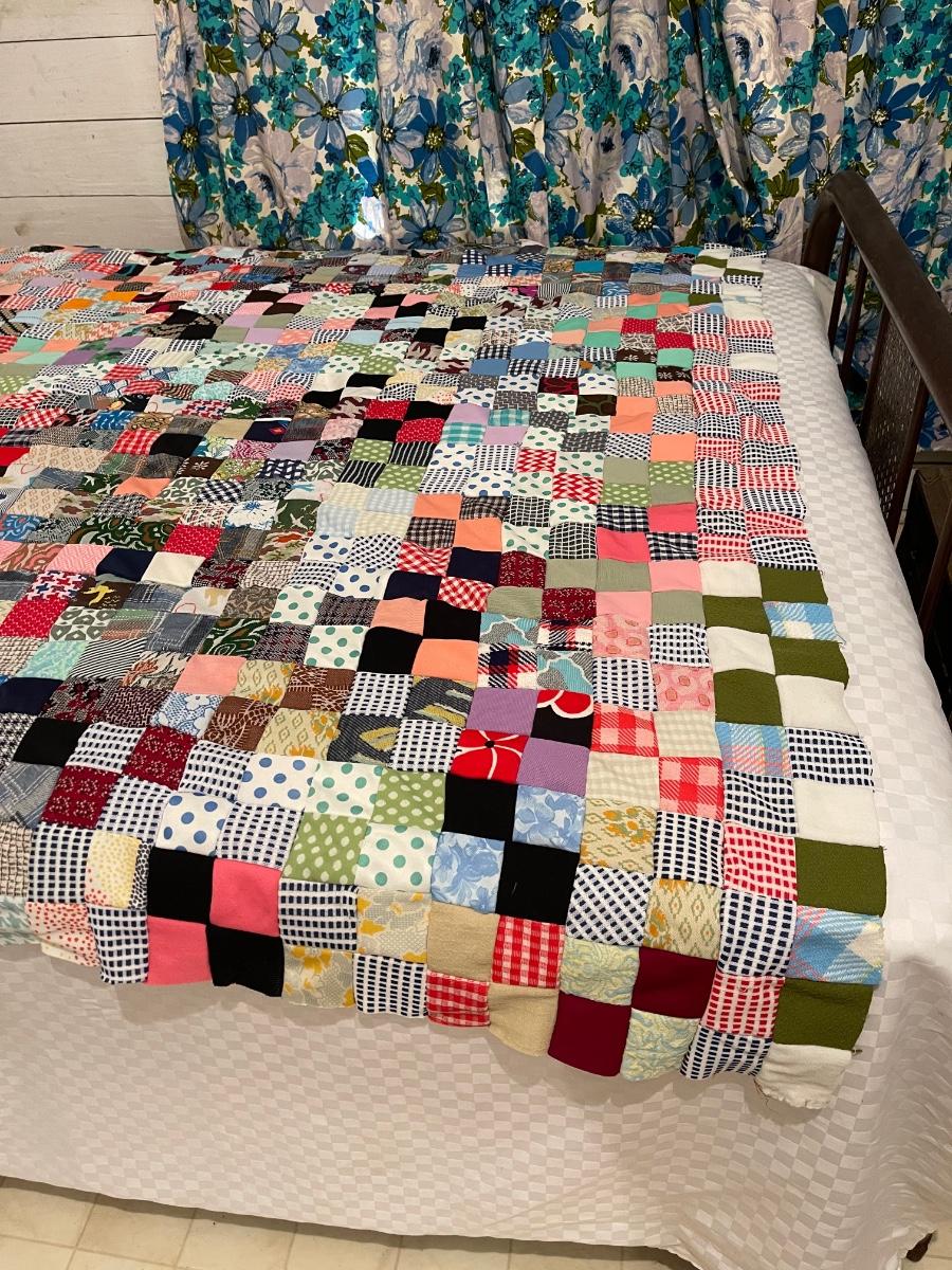 This is a beautiful quilt. Size can be seen on bed that it is a smaller quilt as it doesn’t quite cover the full bed. There is no backing on this quilt. Use as is for a pretty covering to a bed to add color or back it. Perfect weight for summer.