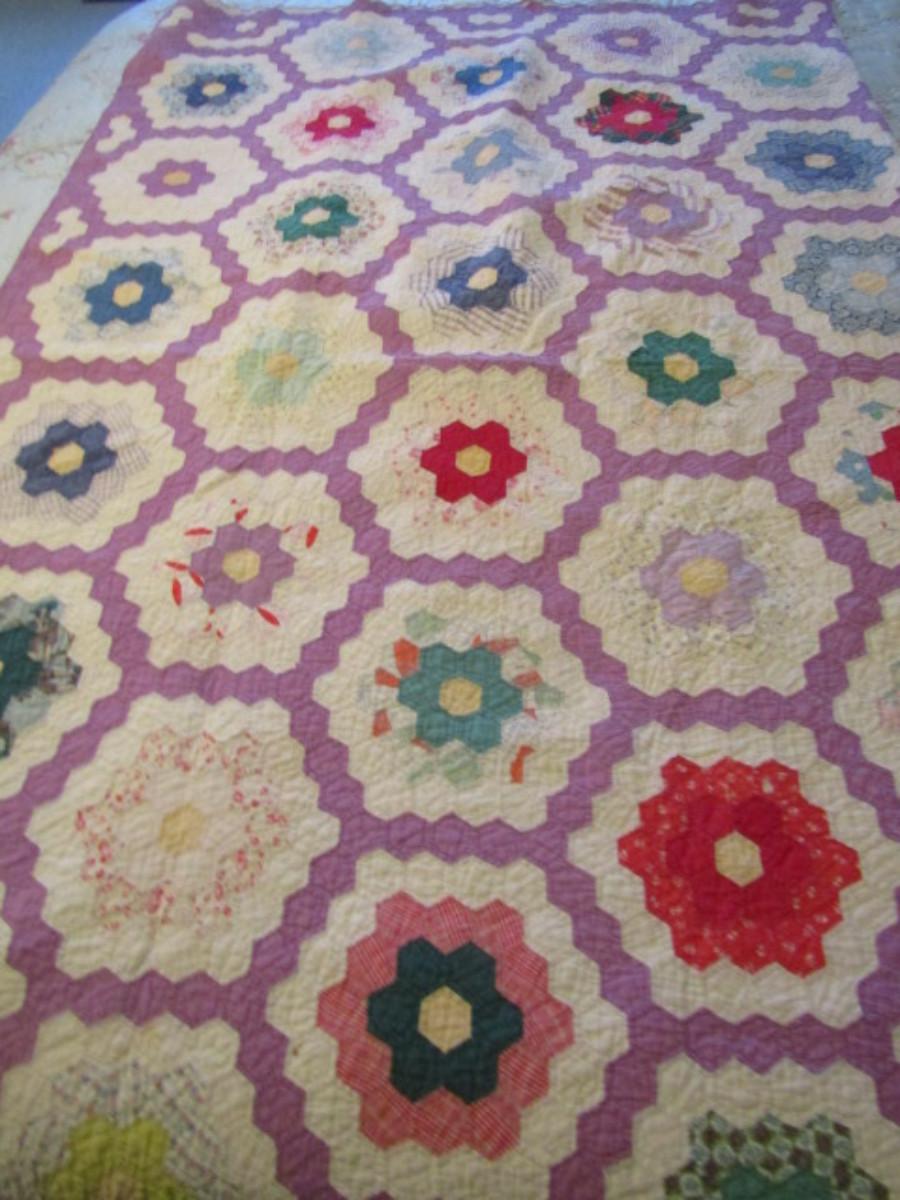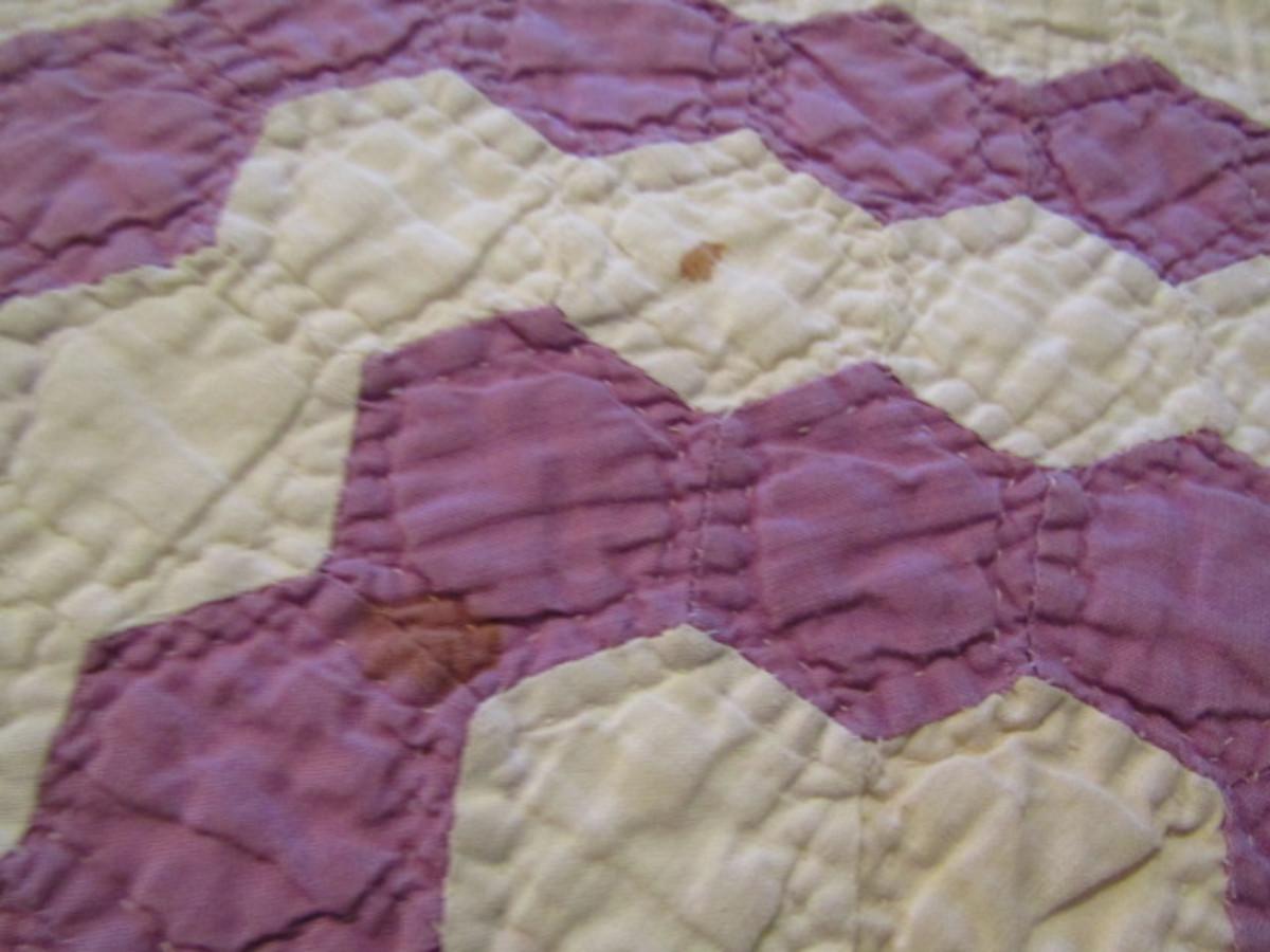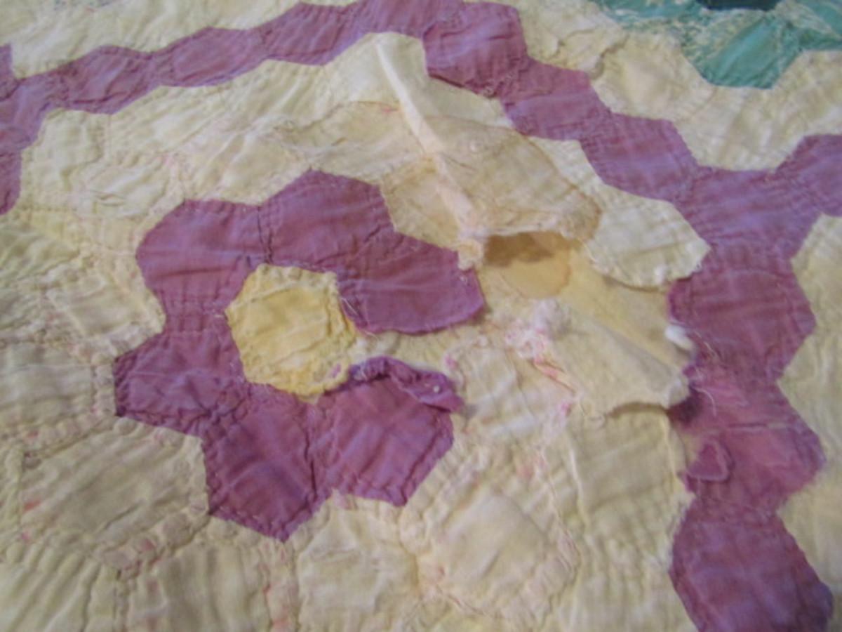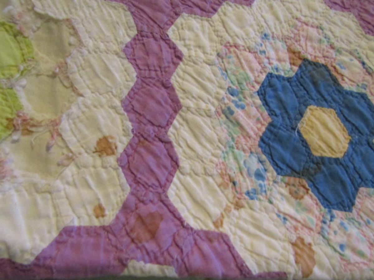 Handmade Quilt- Honeycomb Pattern. Some areas need repair and cleaning to remove staining. Please see pictures. Measures approx 87 3/4" x 70".