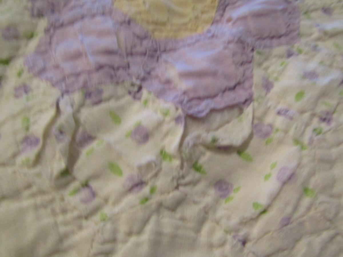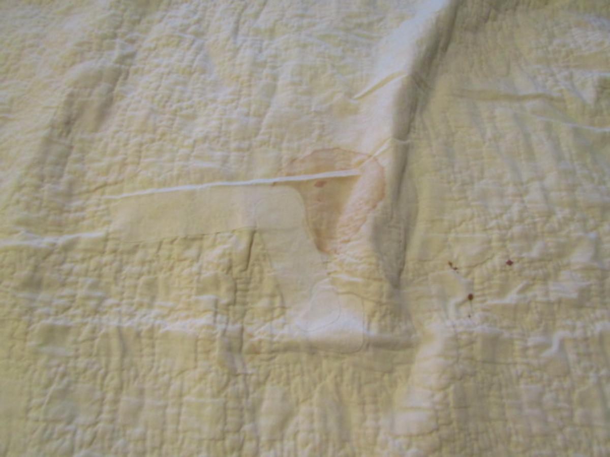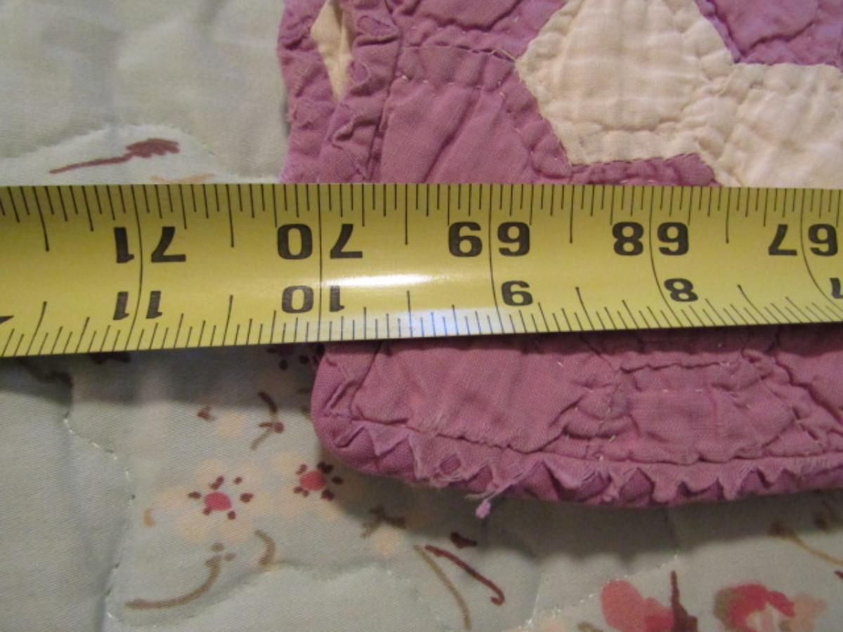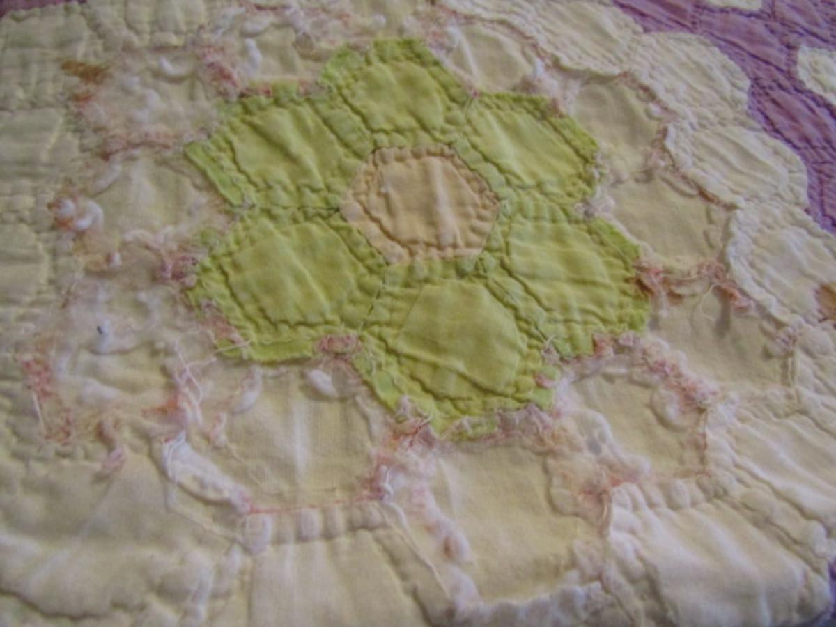 Handmade Quilt- Honeycomb Pattern. Some areas need repair and cleaning to remove staining. Please see pictures. Measures approx 87 3/4" x 70".