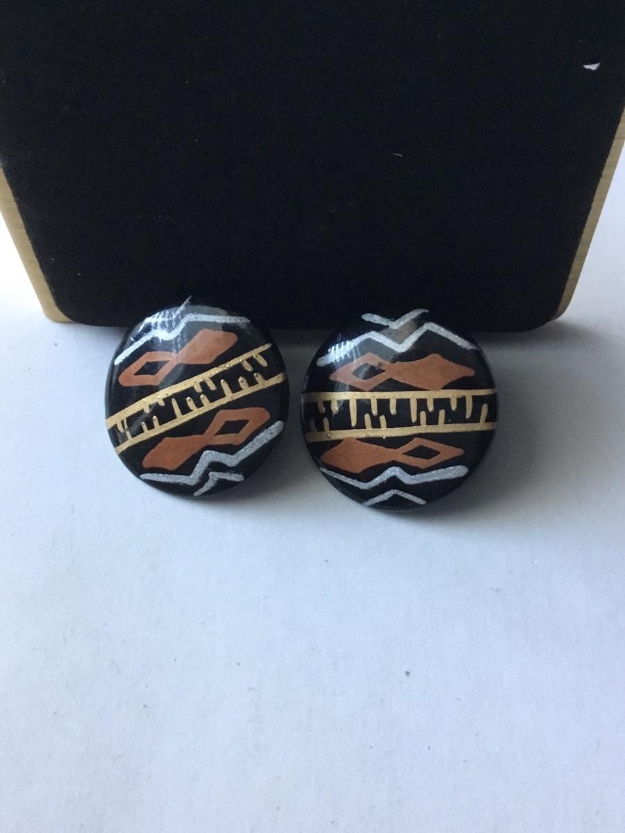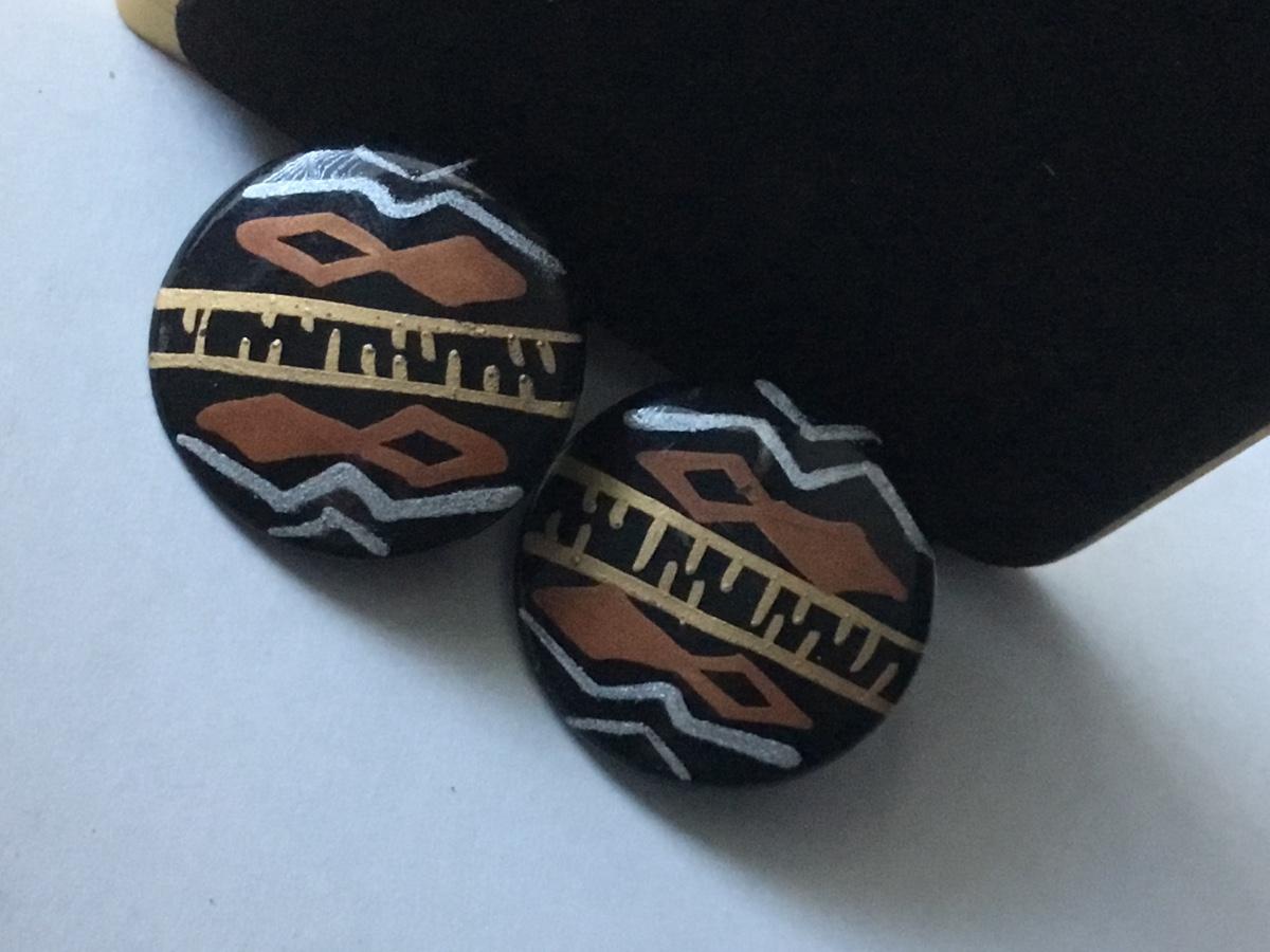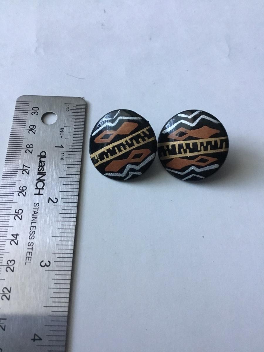 Handmade round black button stud earrings with an ethnic or tribal inspired geometric pattern in white brown/orange