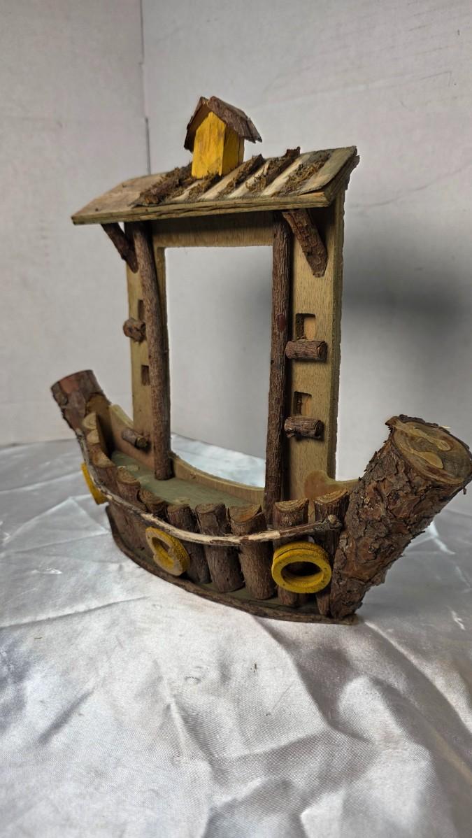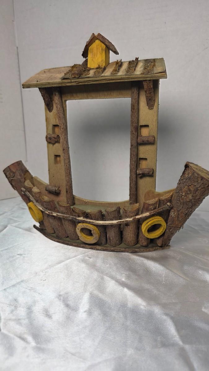 This handmade rustic wooden boat décor piece is a charming folk art creation crafted from real wood, bark, and natural branch segments. The design features a curved hull built from cut twig sections, round porthole details painted in yellow, and a small cabin structure mounted on the upper deck. The craftsmanship gives it a whimsical, cabin-by-the-lake character that works beautifully as shelf décor, mantel display, or in a rustic lodge or nautical-themed space. Measurements shown in photos place it at approximately 12–13 inches wide and around 10 inches tall.