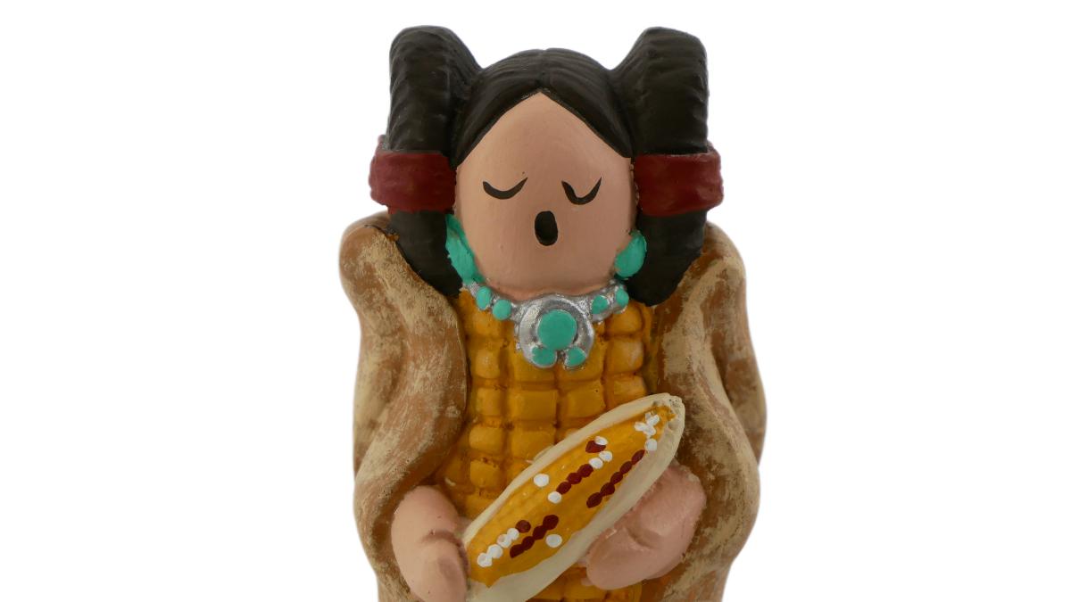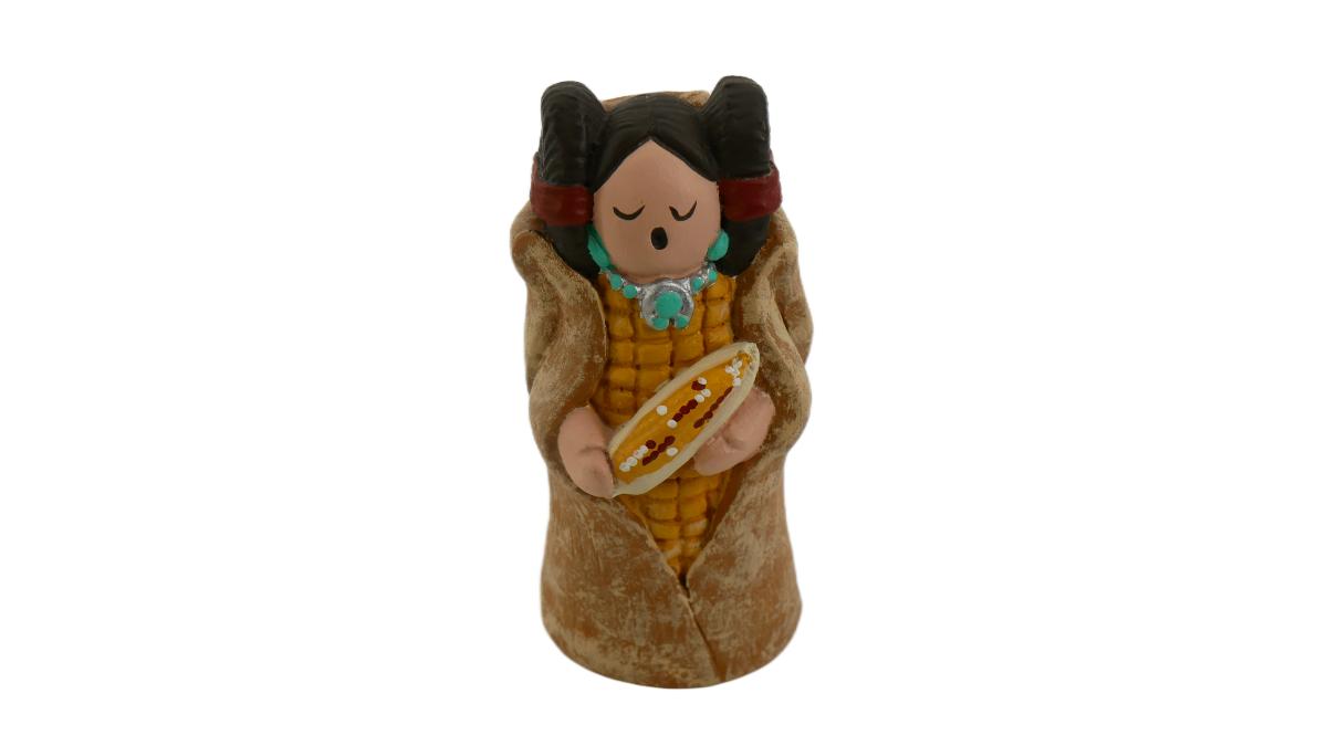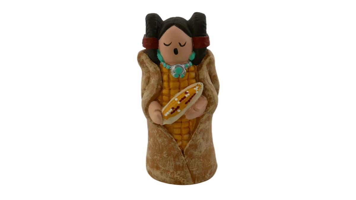 Vintage handmade Native American corn maiden figurine with artist signature "SWF (heart) 95". Measures L 2" x H 4.5" x W 2". Weighs 6.5 oz. (C4)