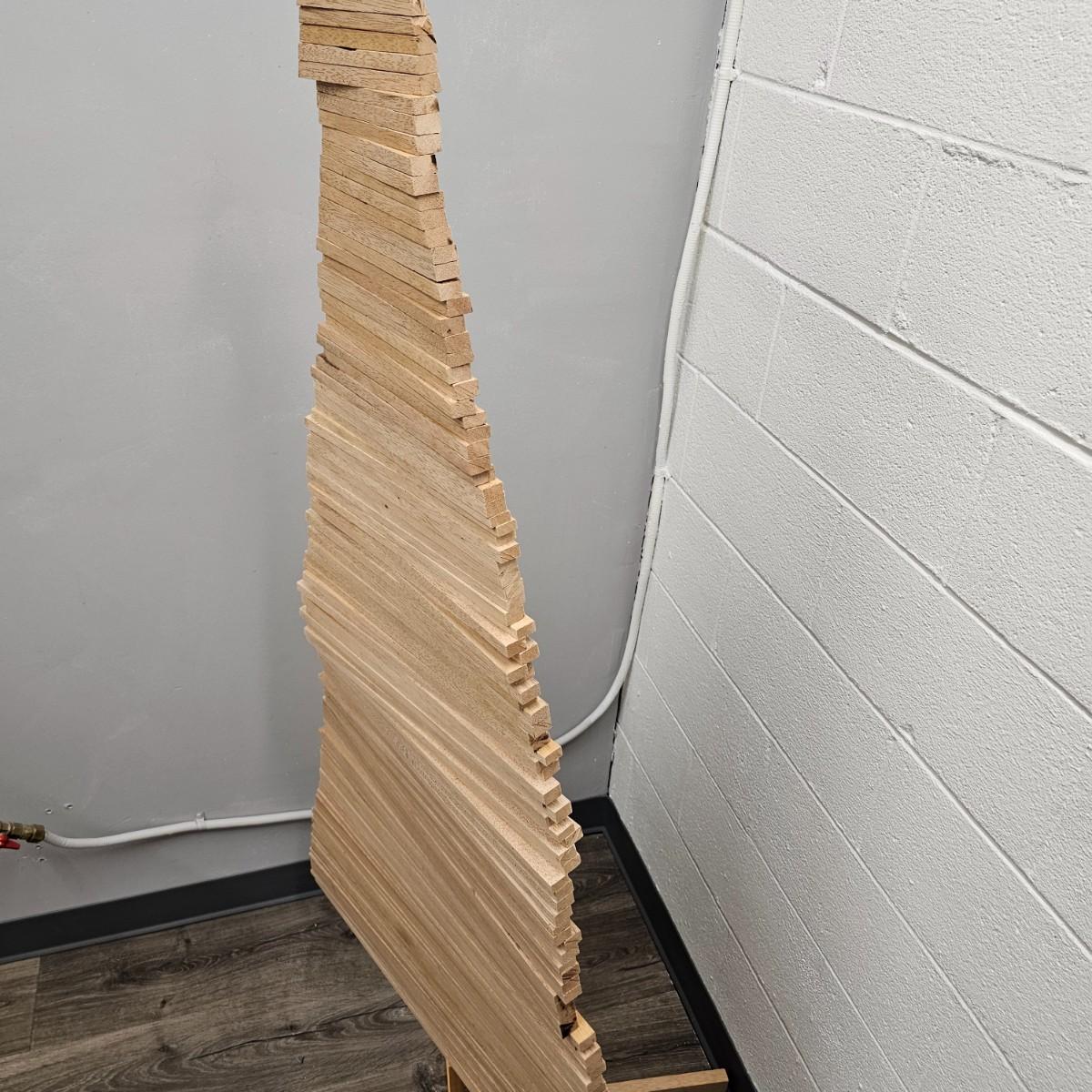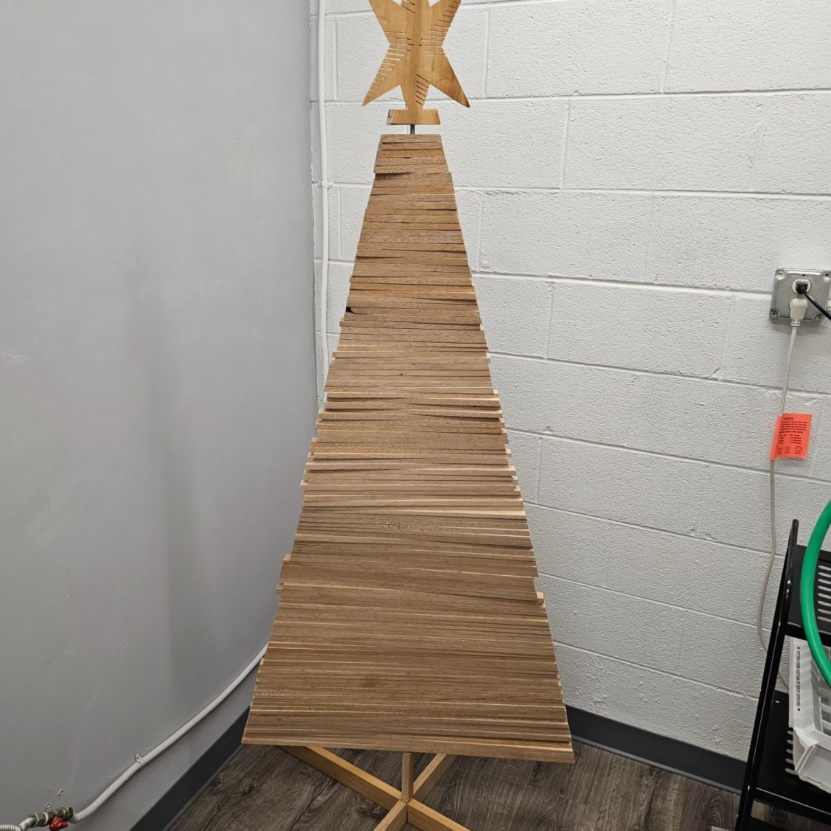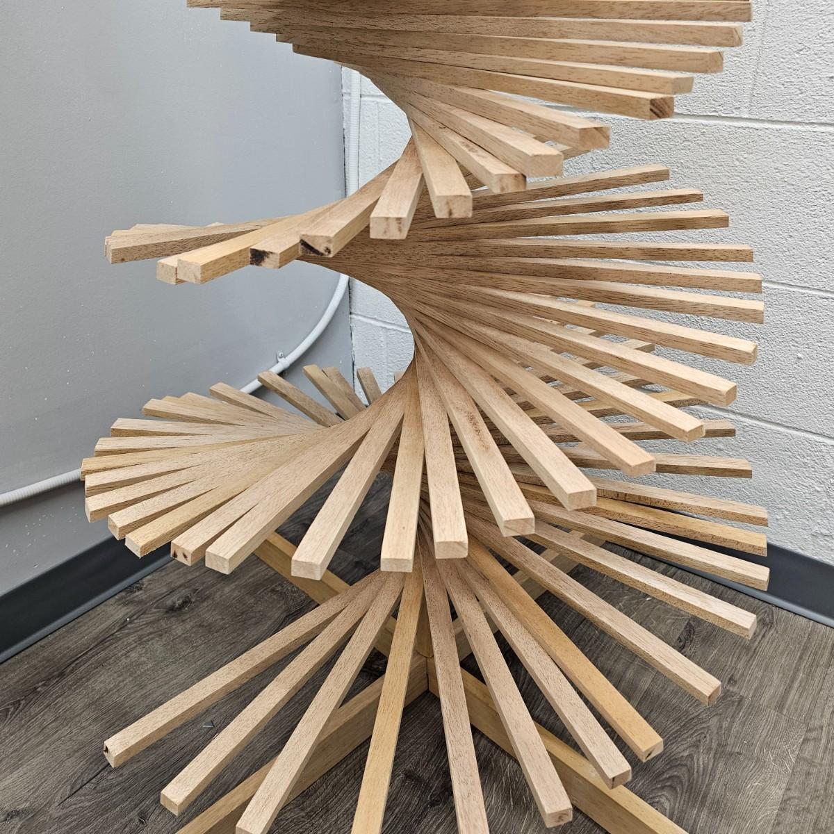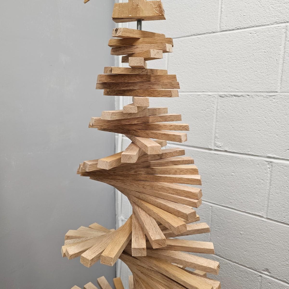 A beautiful hand pieced spiral wood tree. Individual pieces rotate around a central post and can be arranged as you desire. 36"D x 75"H, the tree folds flat for storage. See photos for details. Local pickup only.