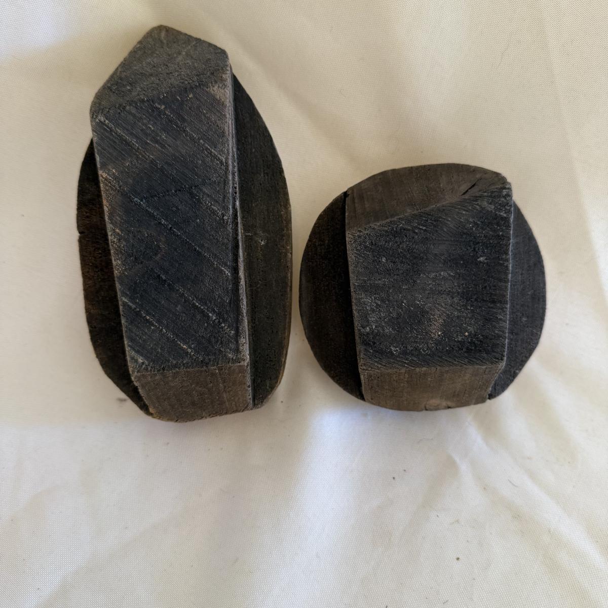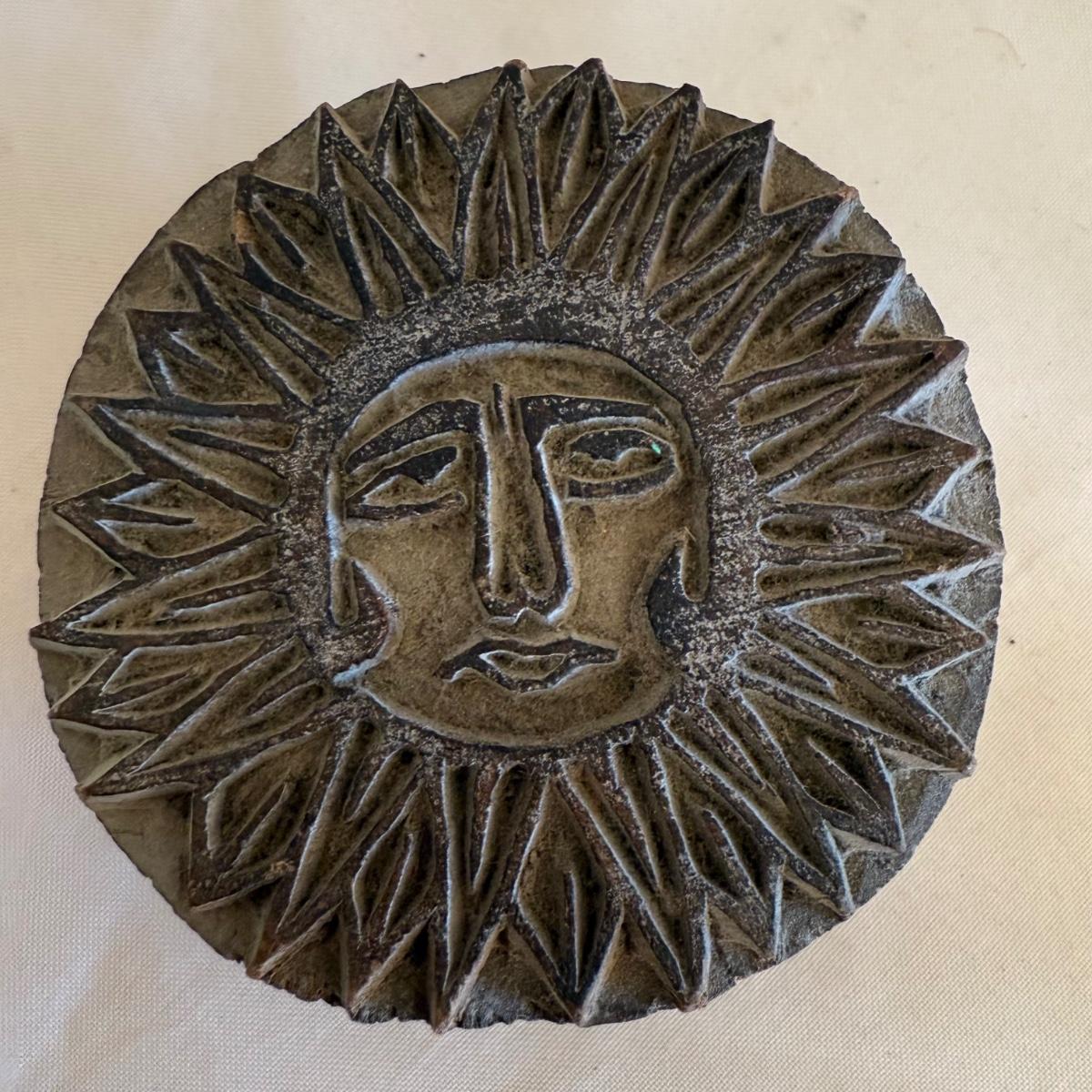 This lot contains two what appears to be hand carved stamps made out of wood. The first is the biggest and has a lovely leaf design on it. It measures 3.75” x 6”. The second is sun with a face, this one is round and has a 3.75”D. Shipping available.
