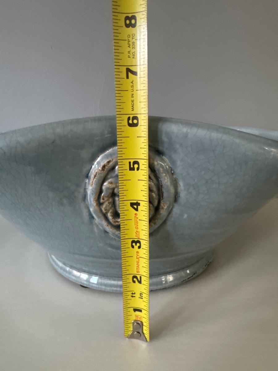 Handmade Studio Pottery Crackle Glaze Bowl with Handles – Artisan Wheel-Thrown – Medusa / Lion Relief – Light Blue Gray”