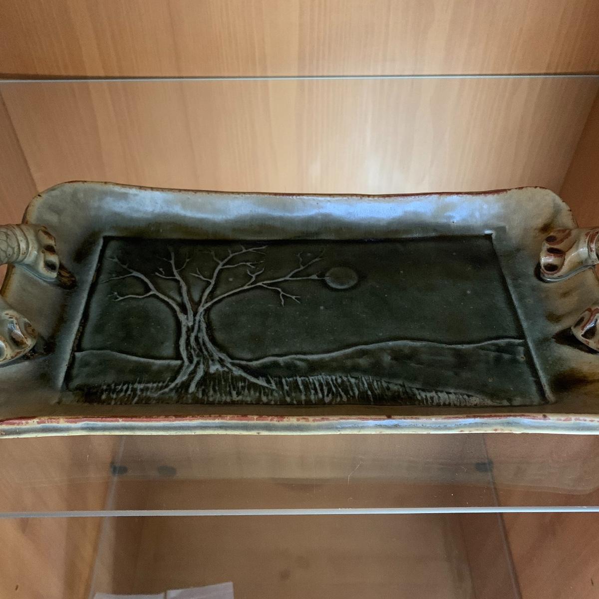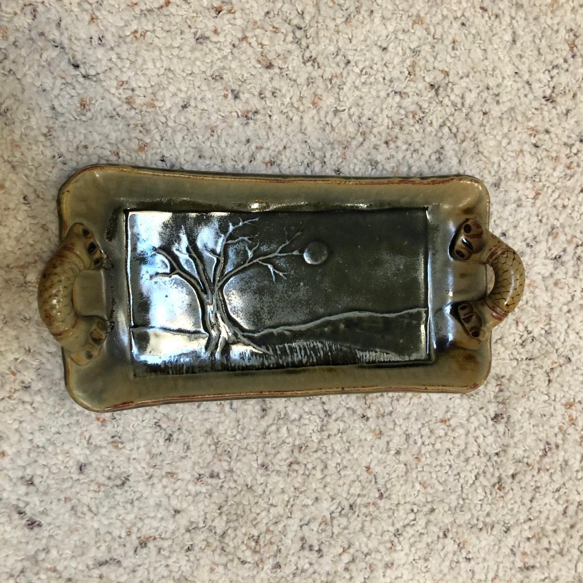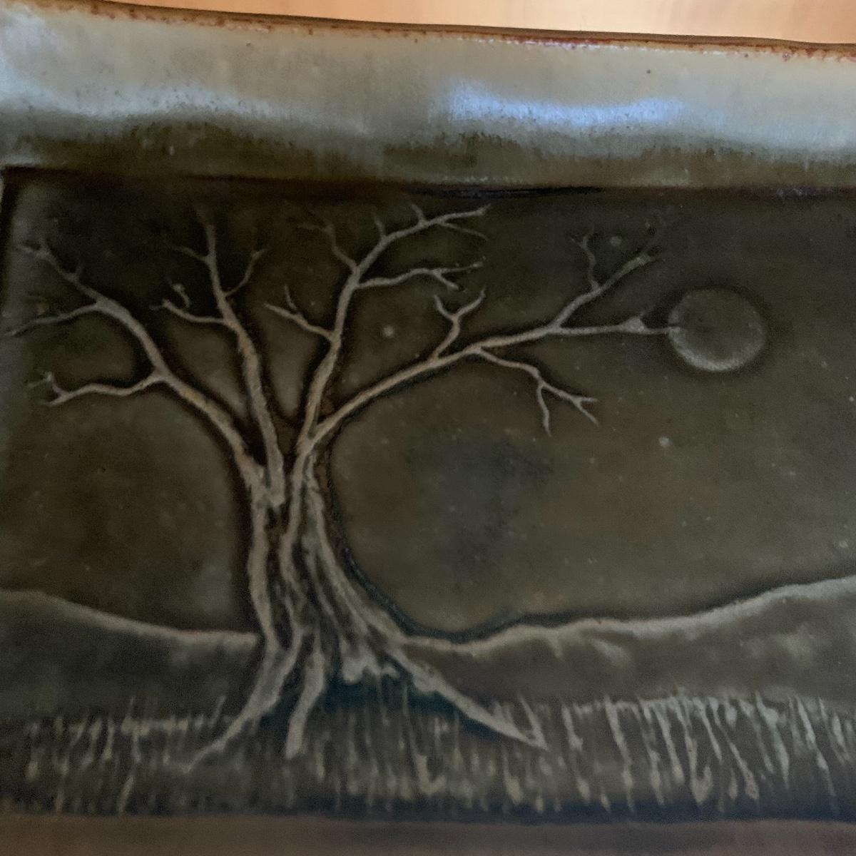 Offered is this handmade pottery tray that features a gorgeous image of a solitary tree in a field. The handles of the tray are detailed with a well executed fish scale like pattern. This piece measures 13” X 9” and is in great condition.