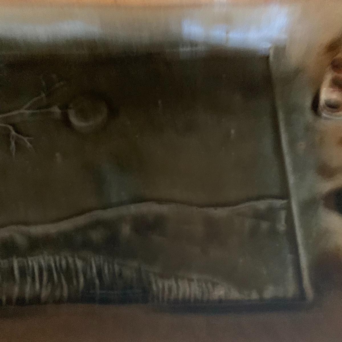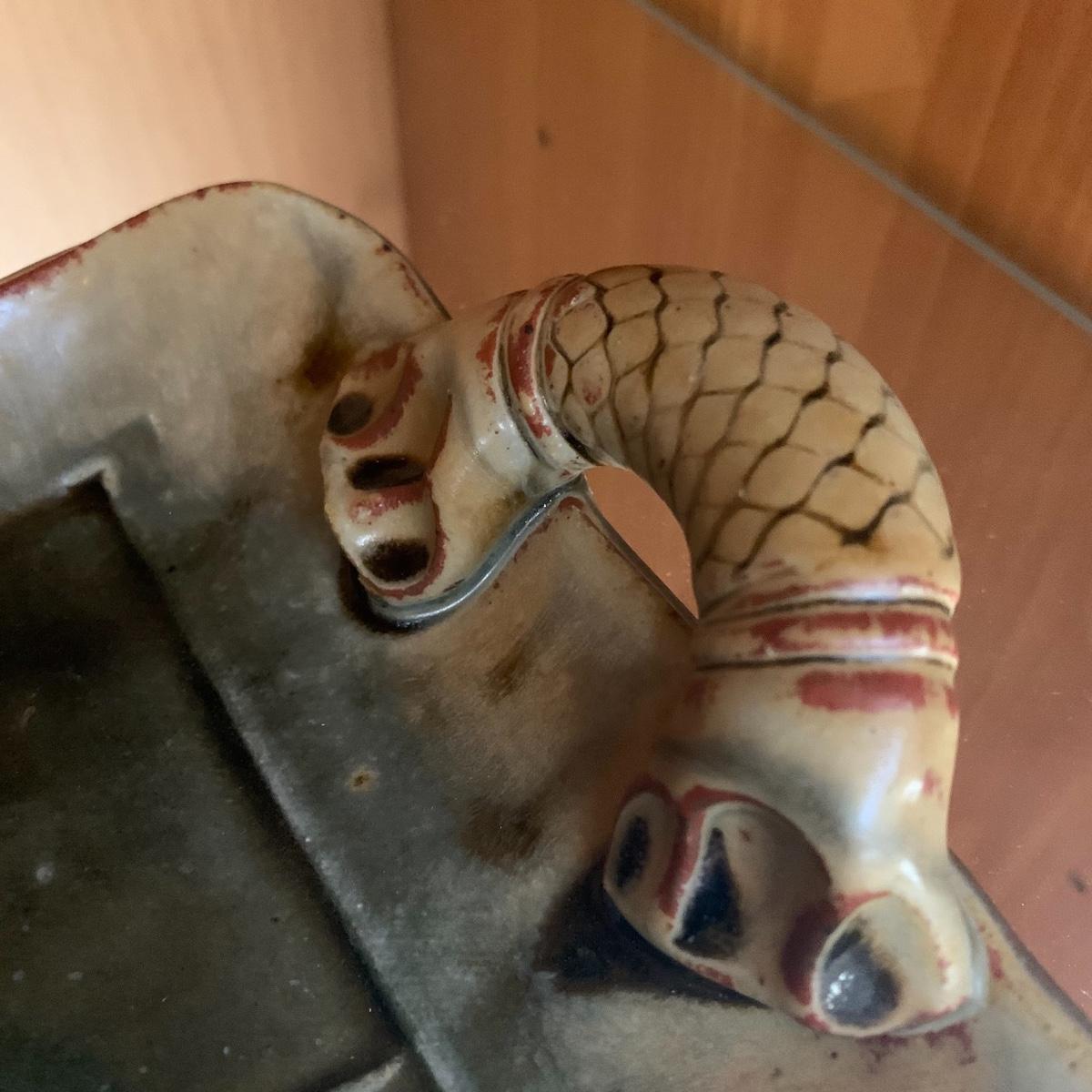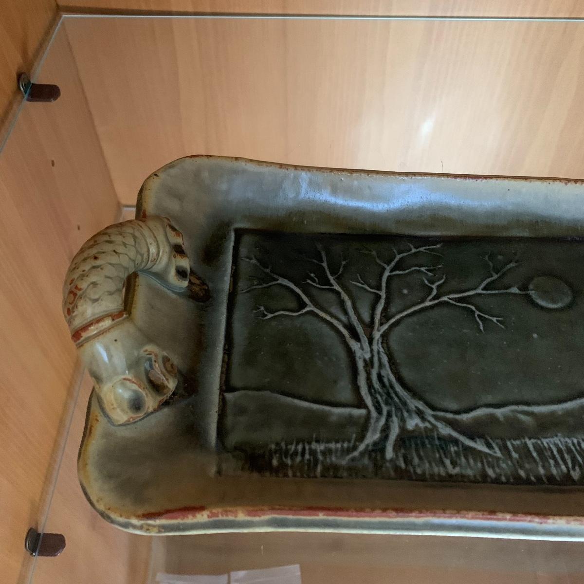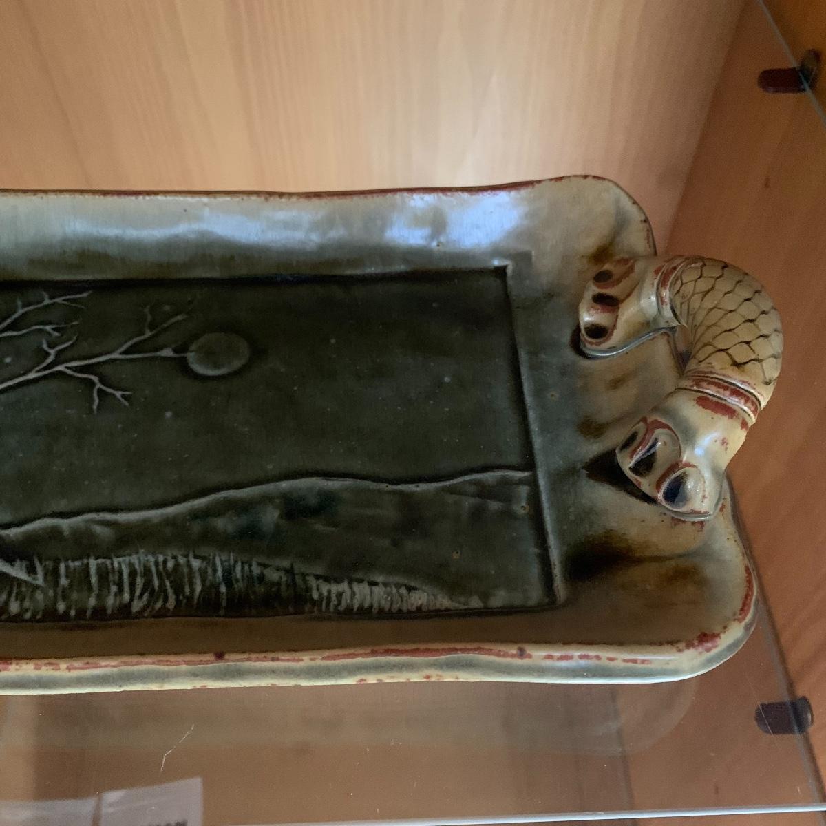 Offered is this handmade pottery tray that features a gorgeous image of a solitary tree in a field. The handles of the tray are detailed with a well executed fish scale like pattern. This piece measures 13” X 9” and is in great condition.