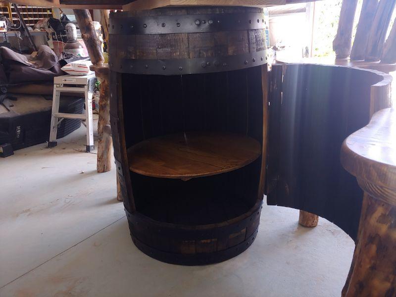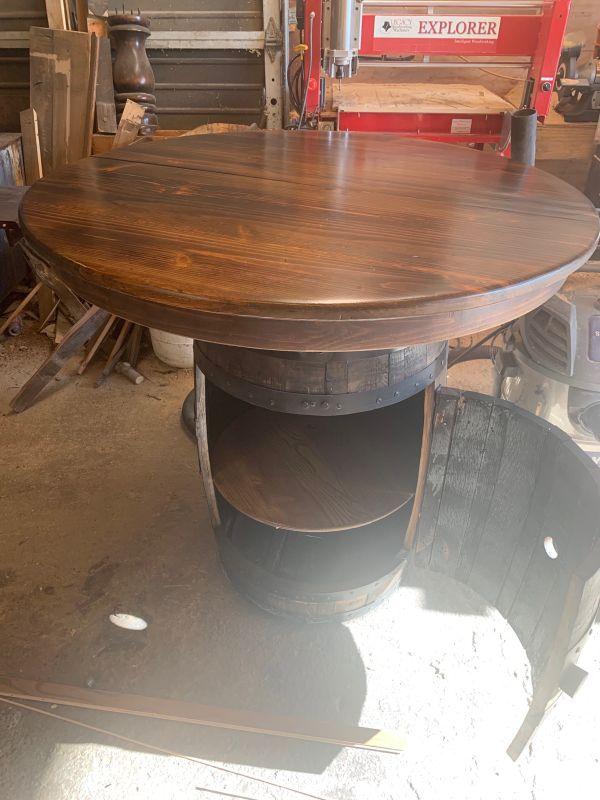Beautiful handmade round table with whiskey barrel center. Also includes two leaves! The table is about 40 tall x 48" across and each leaf adds 15" of width.