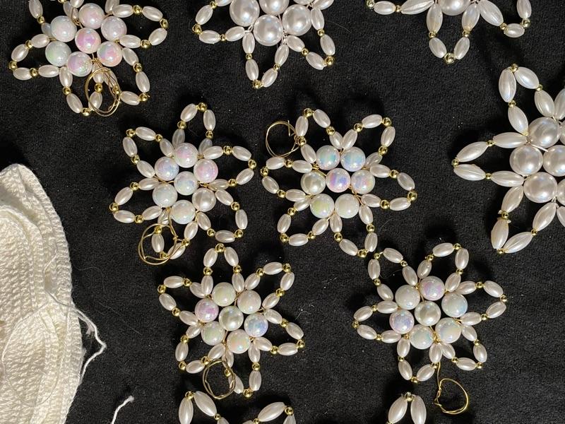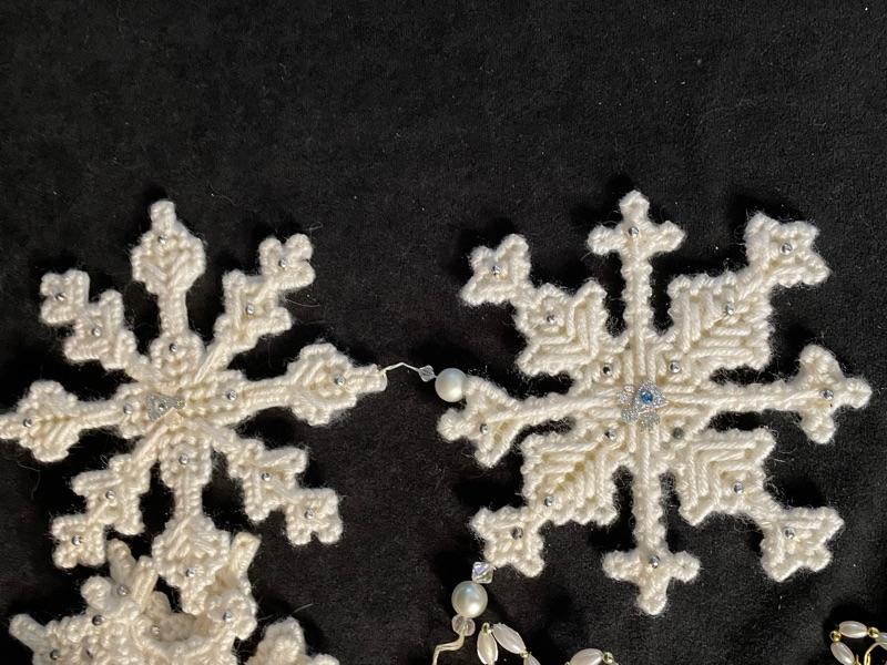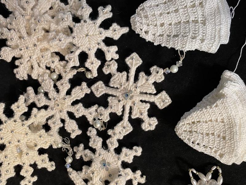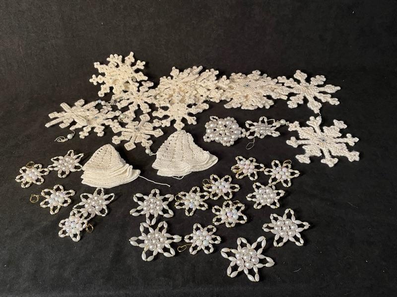 Large assortment of handmade snowflake ornaments made of beads and plastic canvas and hand crocheted bell ornaments