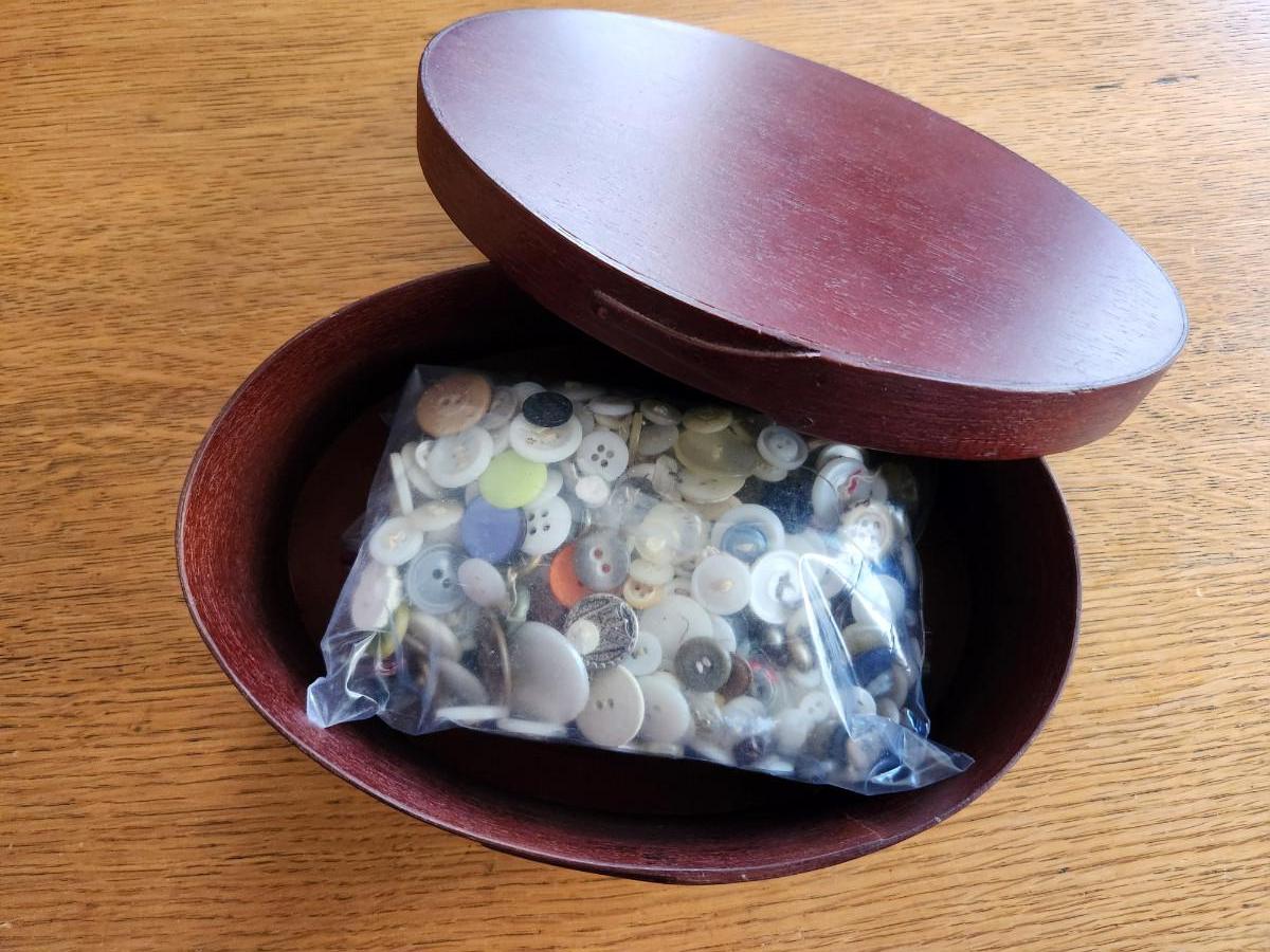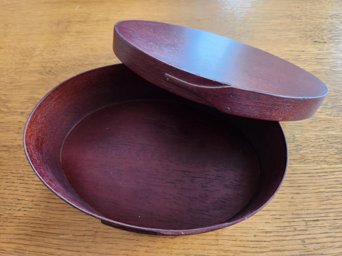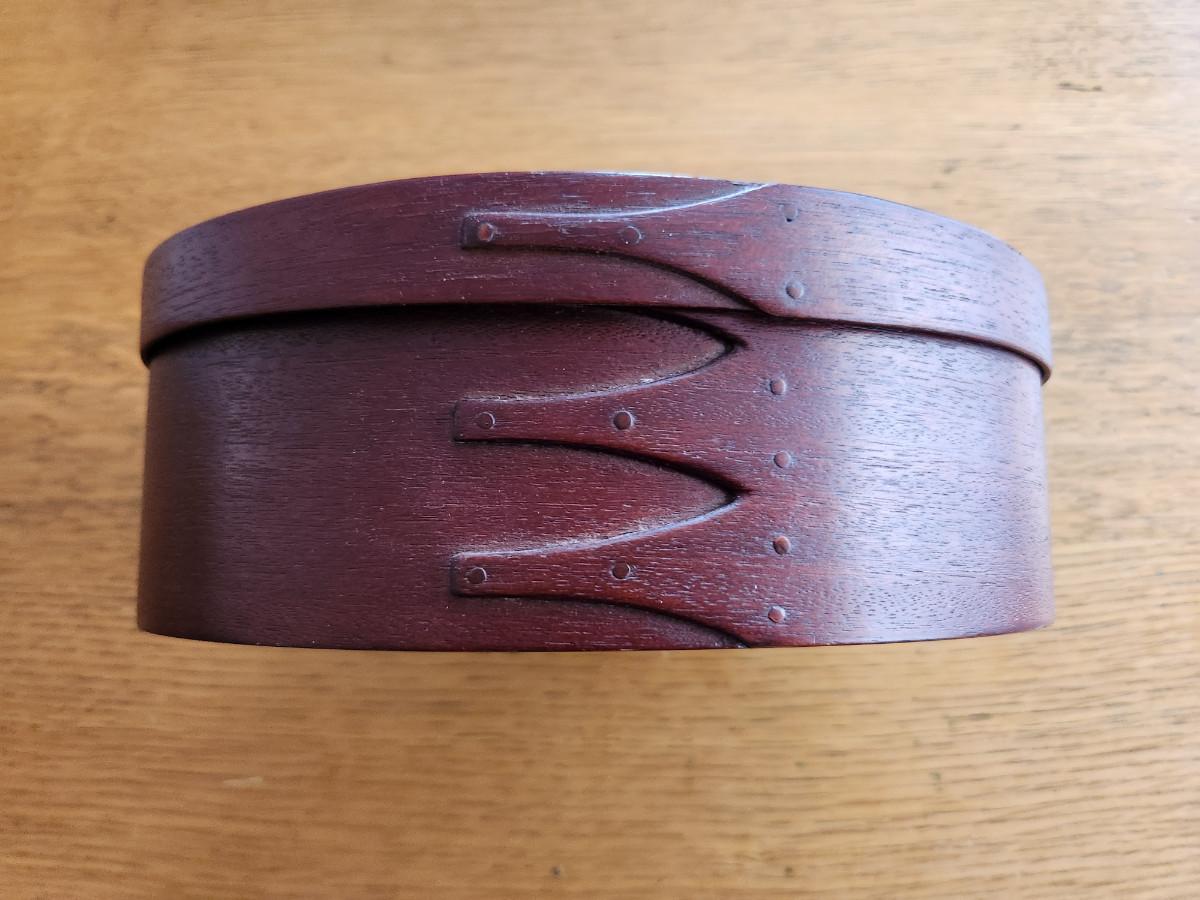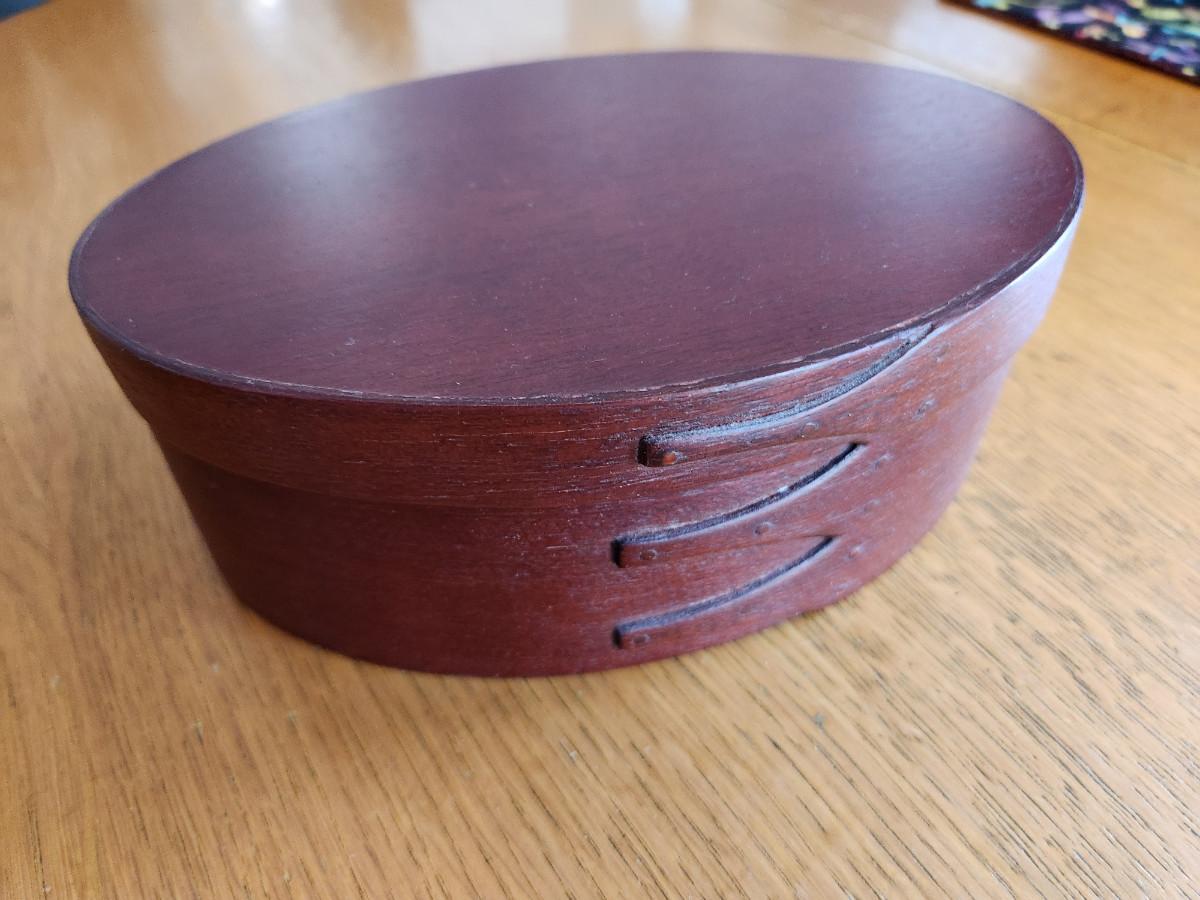 This auction lot is for a nice Handmade Wood Shaker Box. The box is nicely constructed with a good fitting lid. The oval box measures about 8.5-inches long by 6-inches wide and 3-inches deep. The box has a nice deep reddilsh-brown color. Note: buttons are for display to show sizing and possible uses and are not included in the offering.