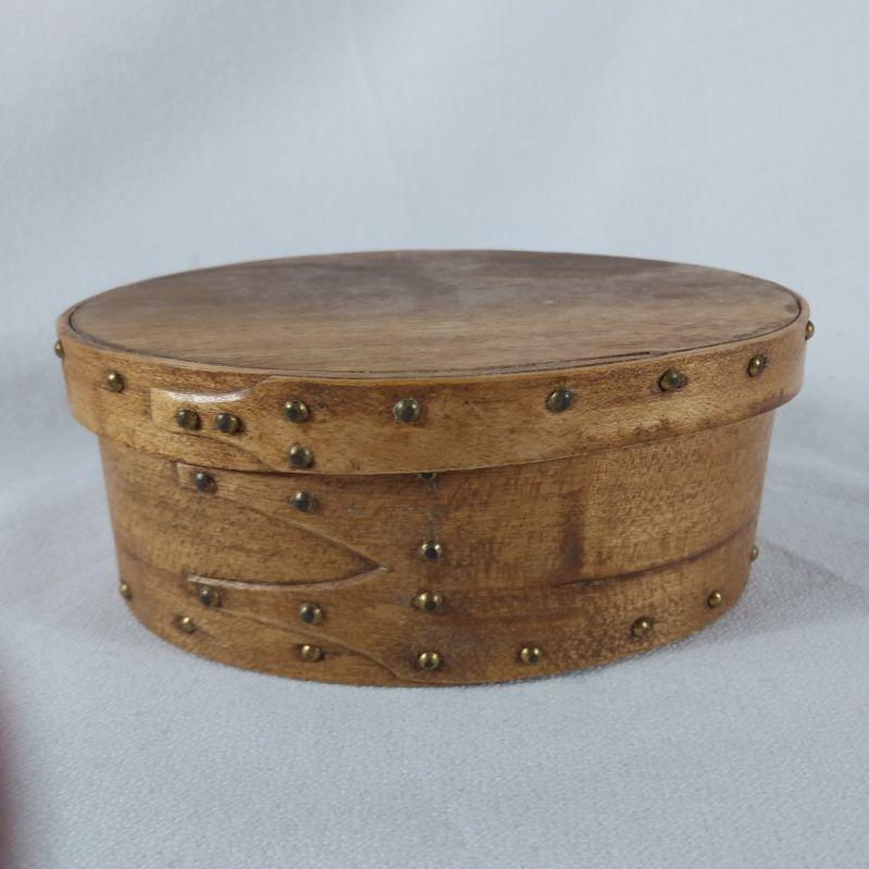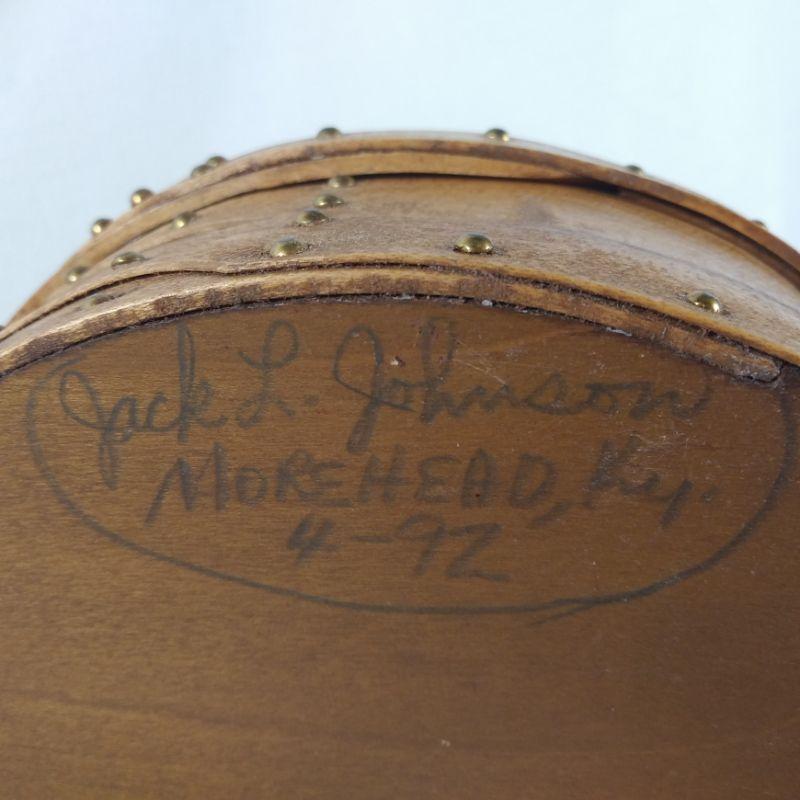 This is another good example of great Kentucky artistry. Handmade Wooden Shaker Box. Signed by the artist - Jack L. Johnson, Morehead, KY 4/92.. Box is 5-inches long X 4-inches wide X 2-inches tall. Box has a wonderful finish patina and is in very good condition. Excellent keepsake box for yourself or for giving.