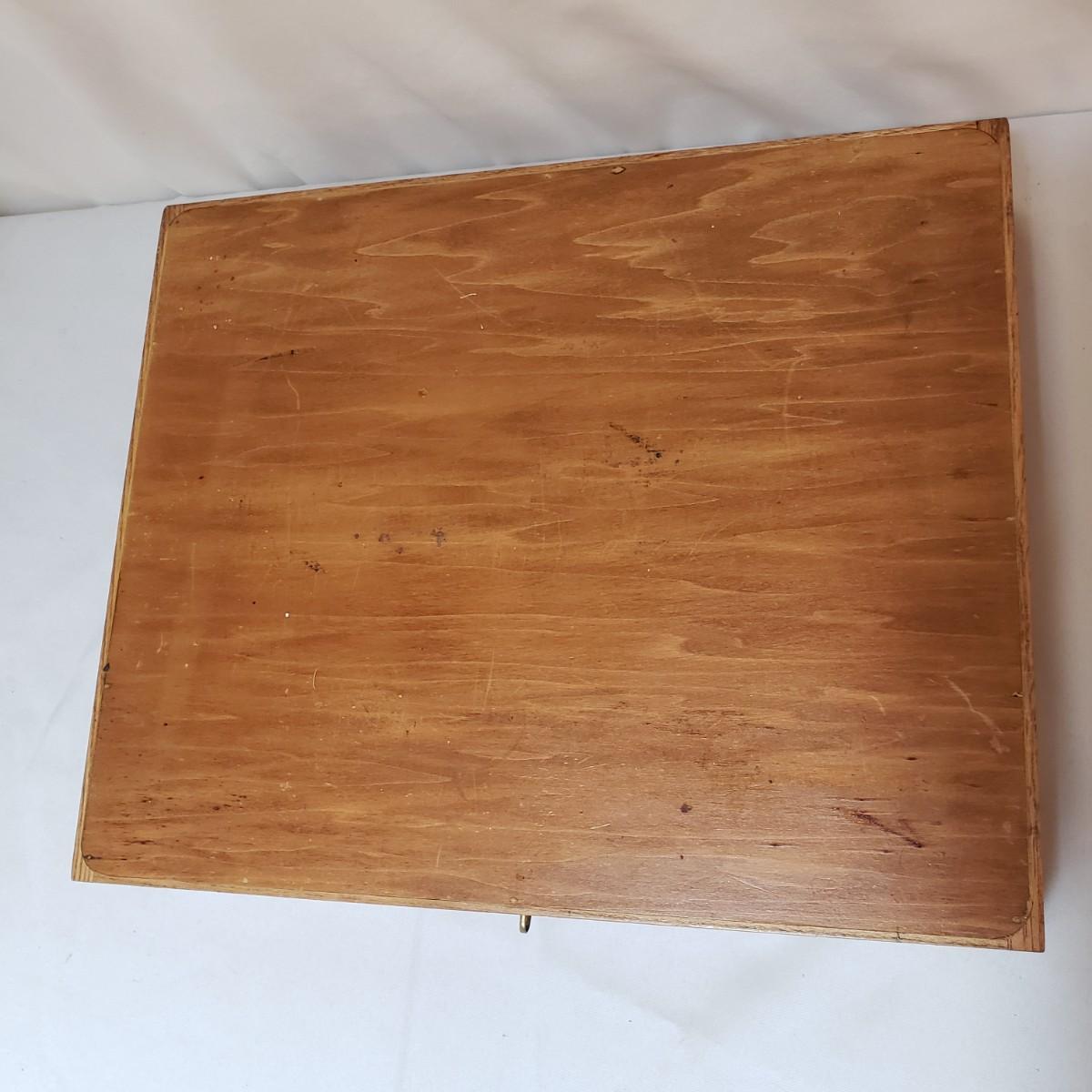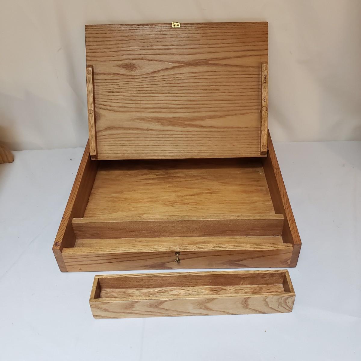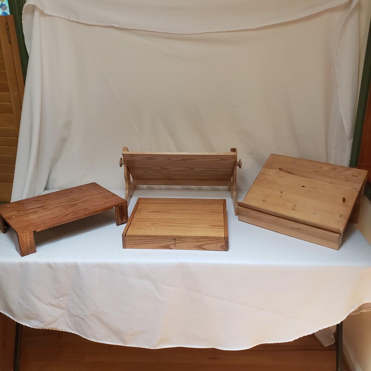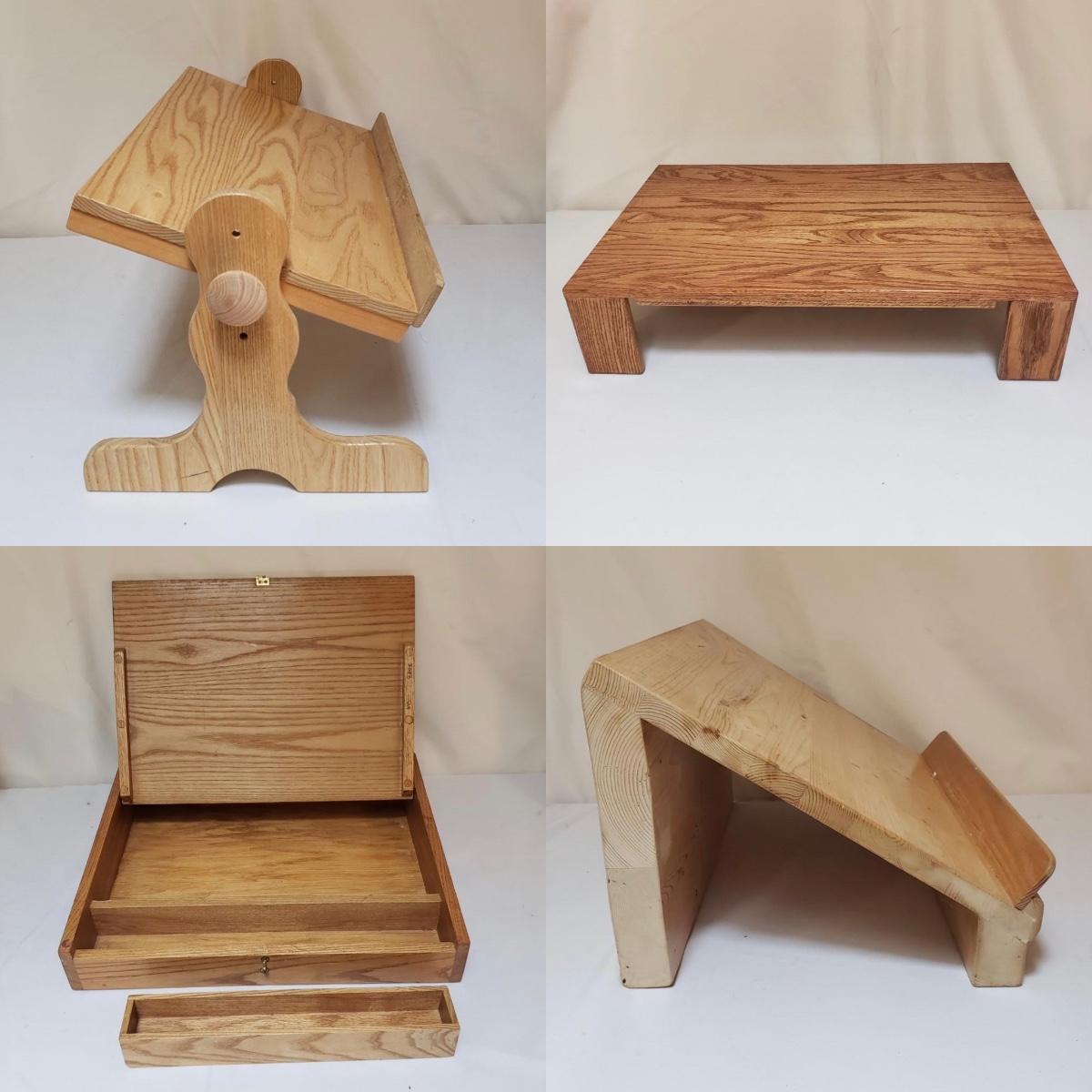 This lot features four unique wooden, handmade laptop trays. They are all made from solid wood. The heaviest one has a triangular shape and measures approximately 17" x 13" x 10"H. The tray with two knobs on either side is adjustable in height and to lock the tray in position. The tray that opens has a removable tray tucked inside. It appears that the brass like lock is missing the hook.