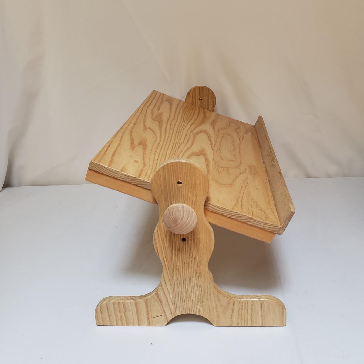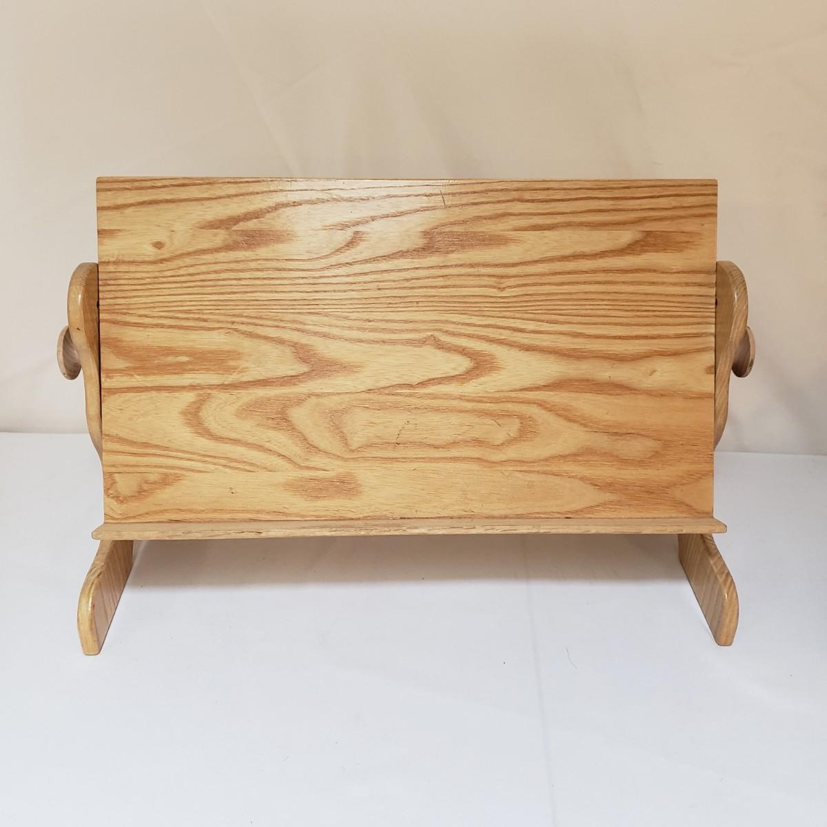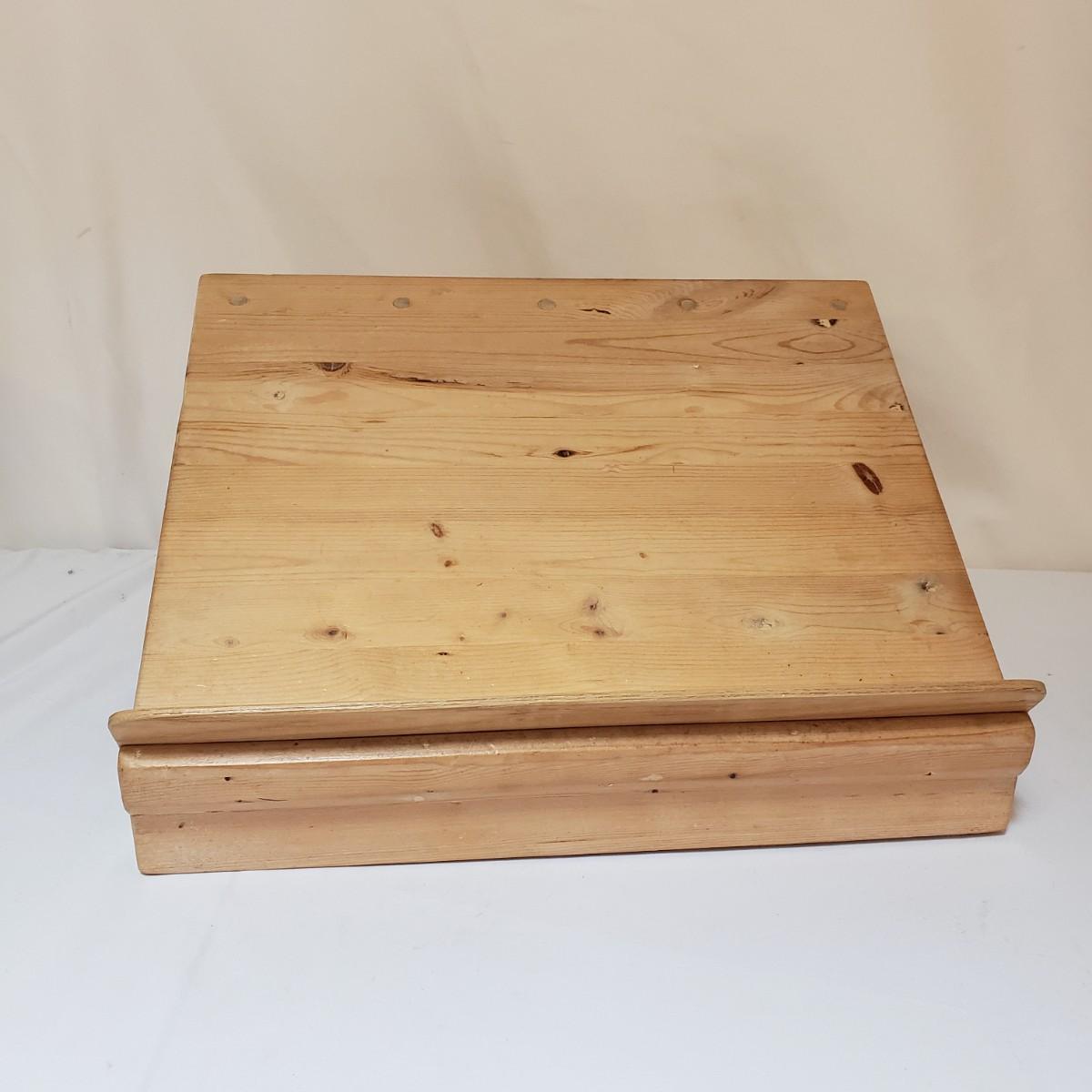 This lot features four unique wooden, handmade laptop trays. They are all made from solid wood. The heaviest one has a triangular shape and measures approximately 17" x 13" x 10"H. The tray with two knobs on either side is adjustable in height and to lock the tray in position. The tray that opens has a removable tray tucked inside. It appears that the brass like lock is missing the hook.
