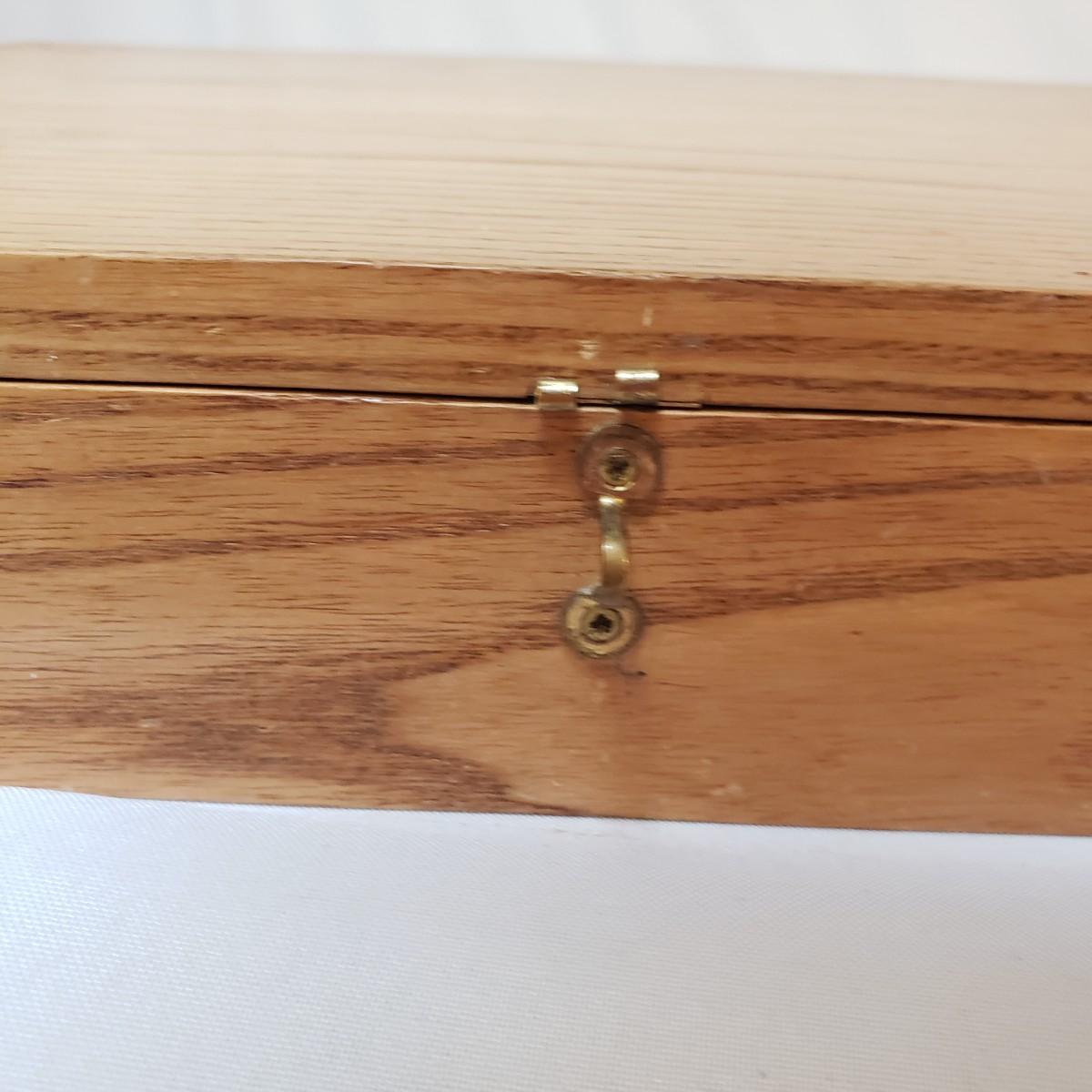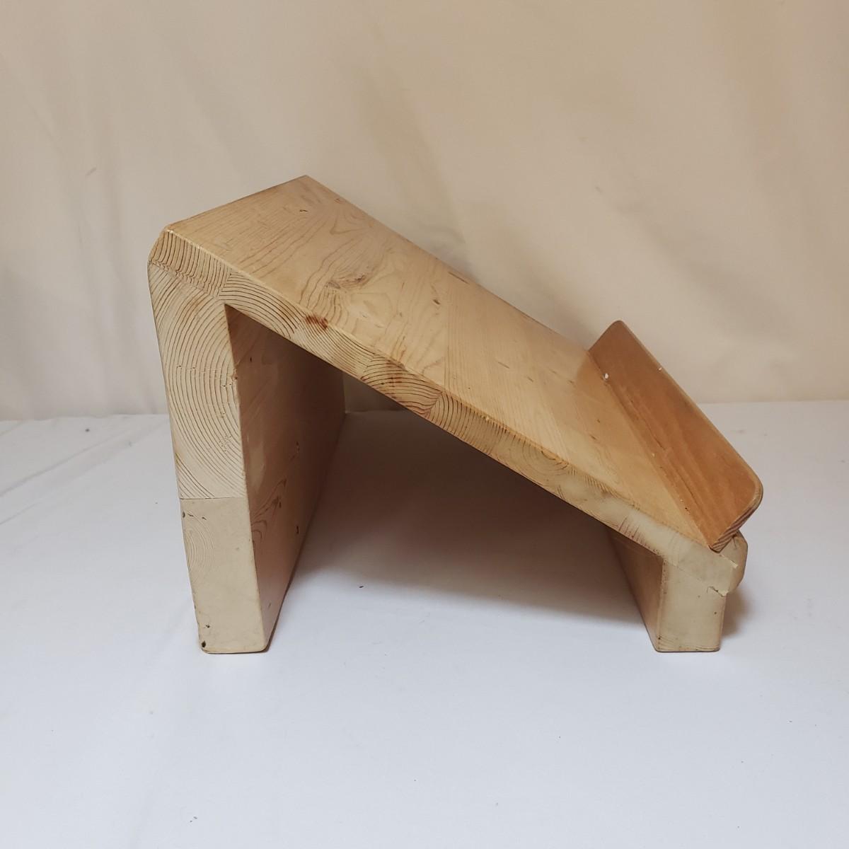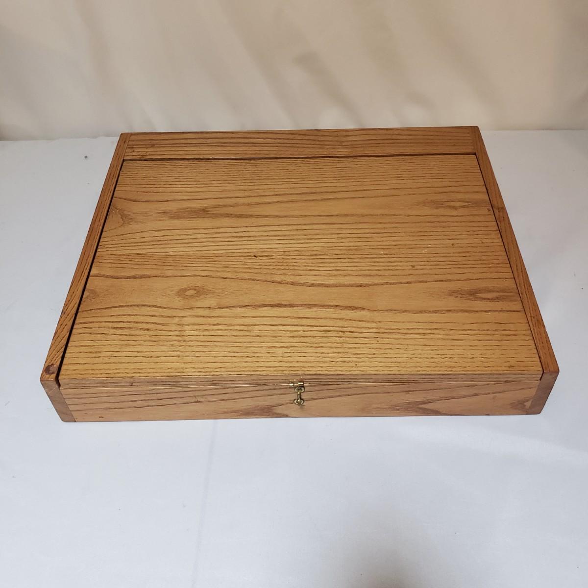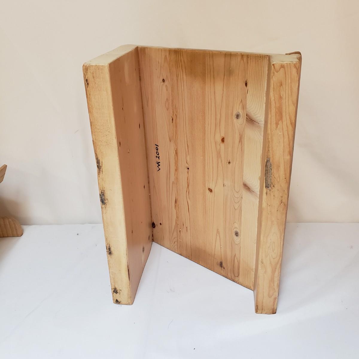This lot features four unique wooden, handmade laptop trays. They are all made from solid wood. The heaviest one has a triangular shape and measures approximately 17" x 13" x 10"H. The tray with two knobs on either side is adjustable in height and to lock the tray in position. The tray that opens has a removable tray tucked inside. It appears that the brass like lock is missing the hook.