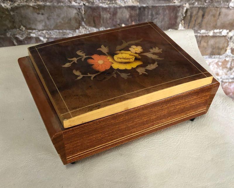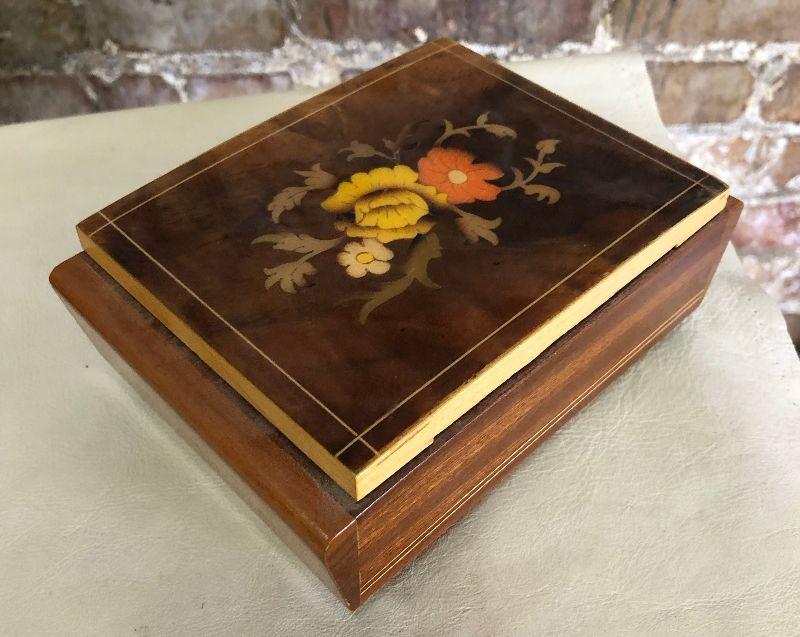 Made in Italy here is a vintage musical jewelry box with inlaid floral decorations...