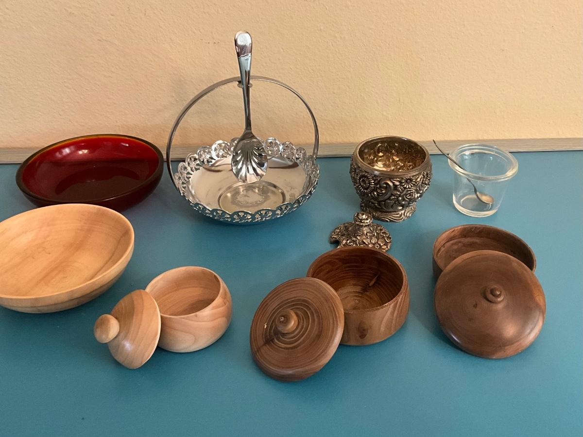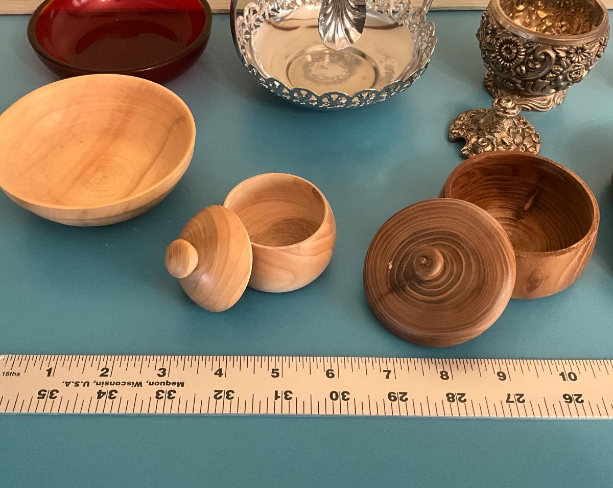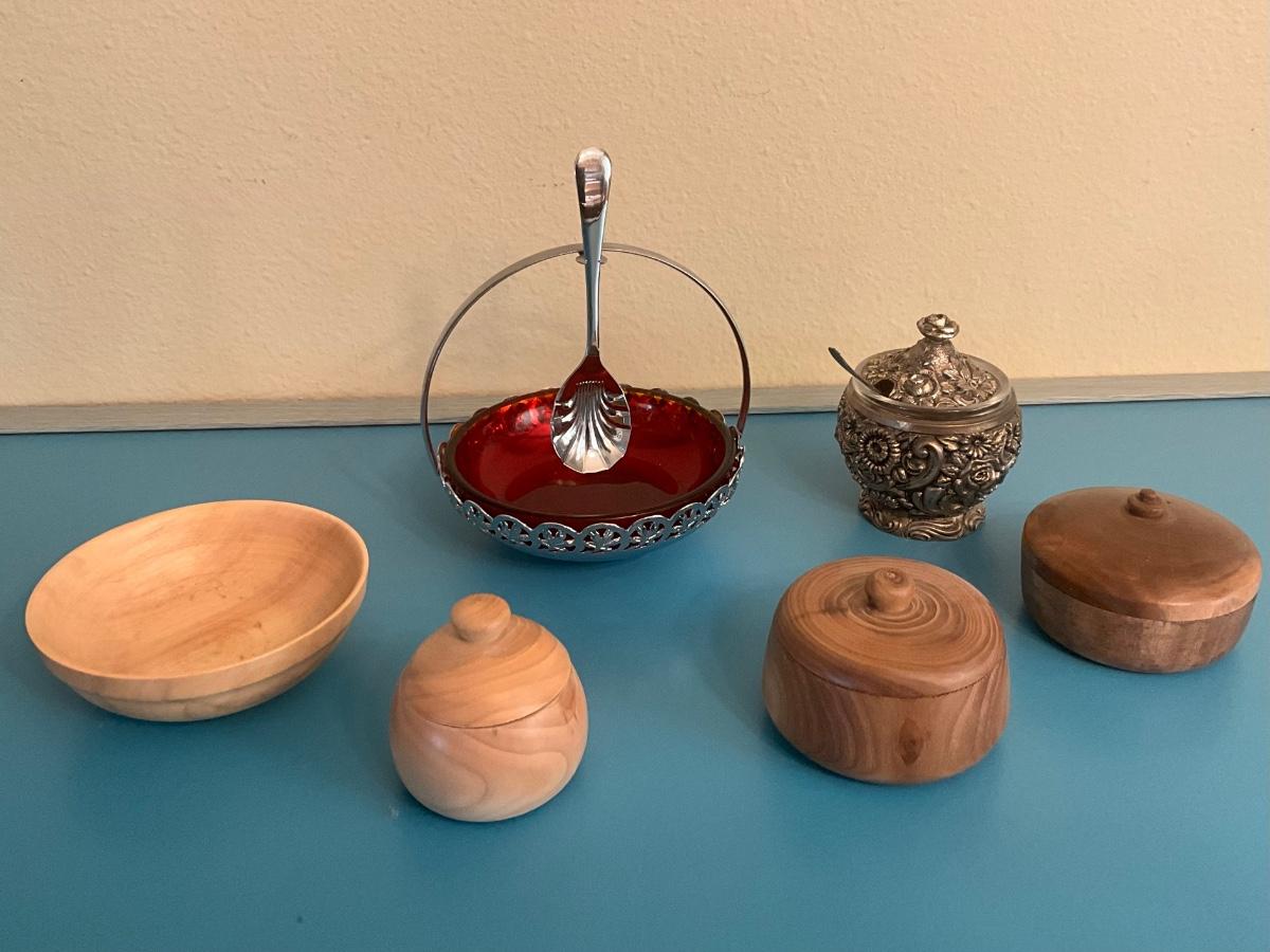 Handmade wooden trinkets, silver candy dish/red glass insert, silver sugar cube container