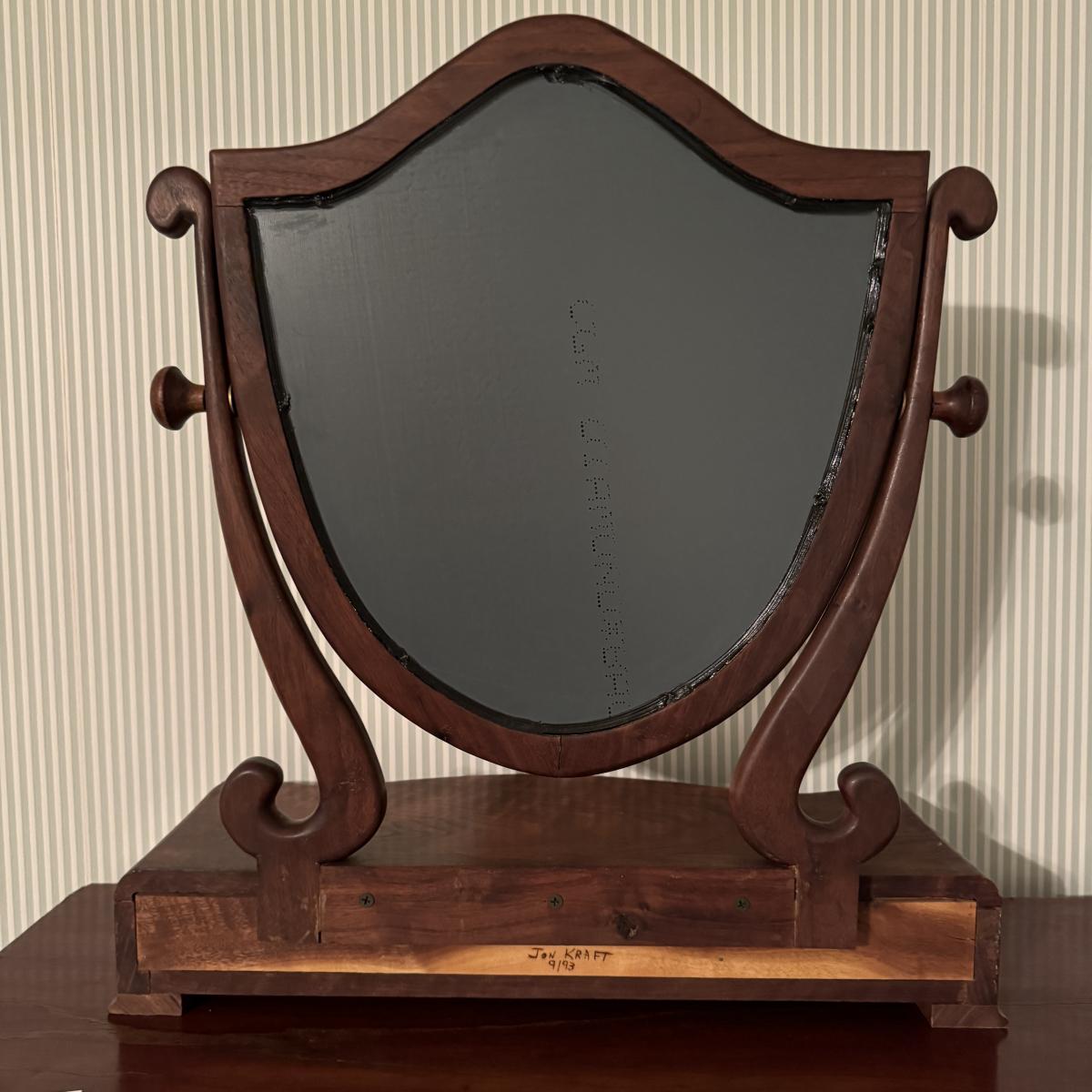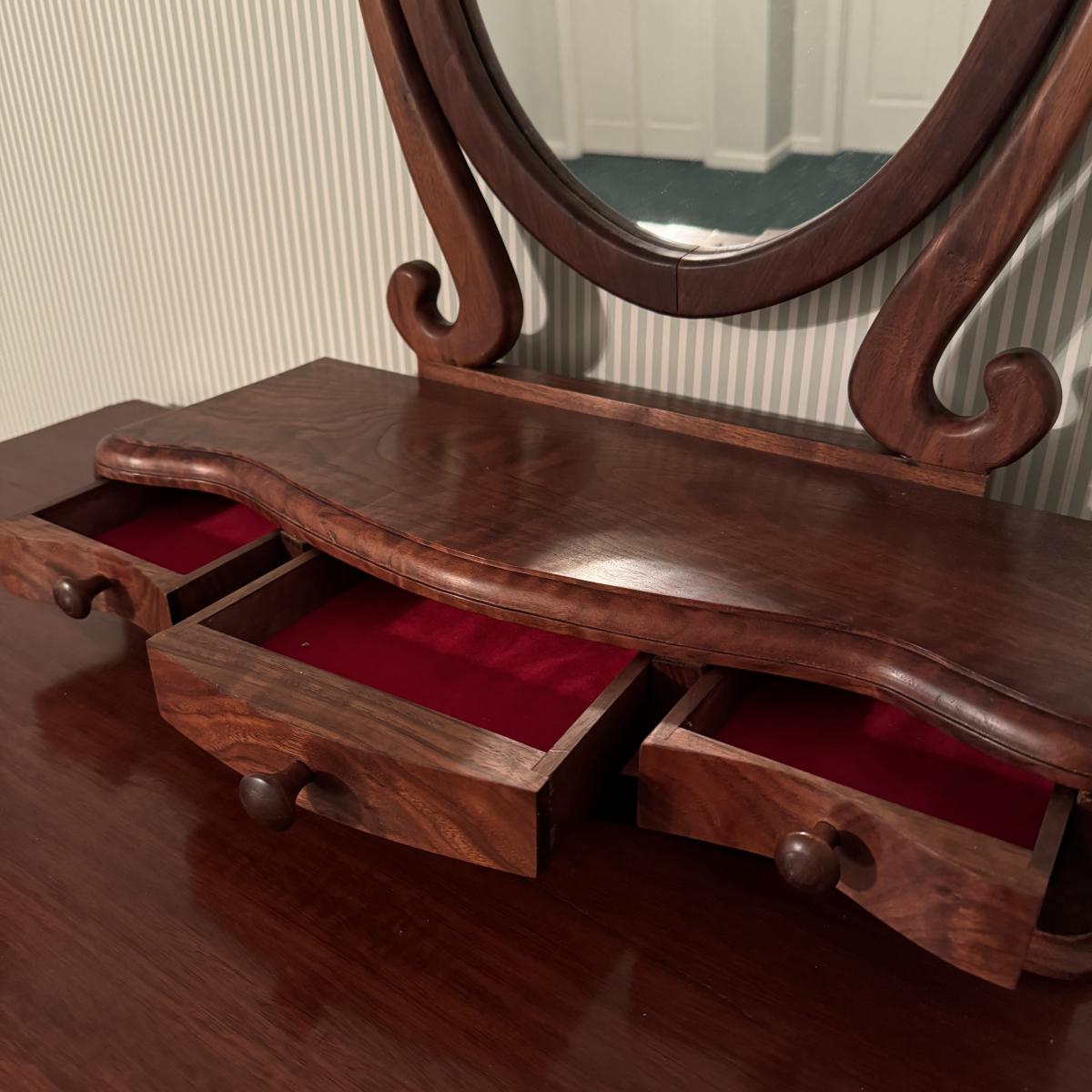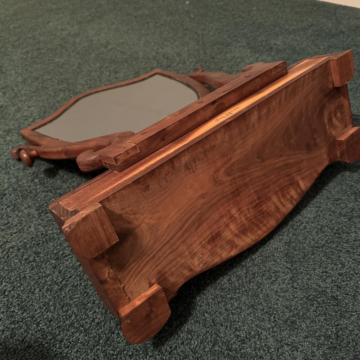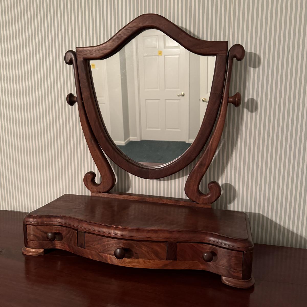 Portable wooden vanity mirror with drawers. Has signature on back Jon Kraft from maker. Red Velvet lined drawers. Mirror can tilt as needed. Measures 20” x 10” x 21.5”H Shipping available.