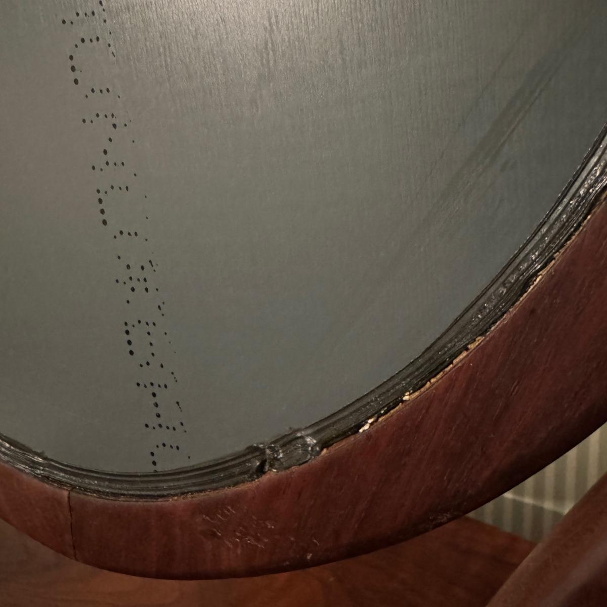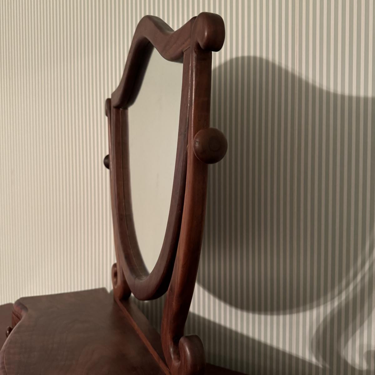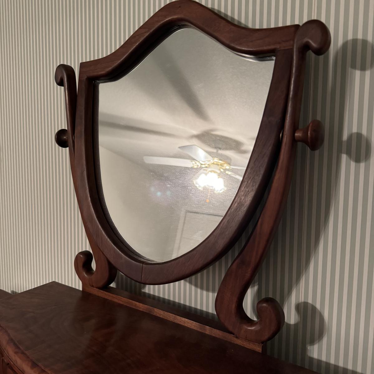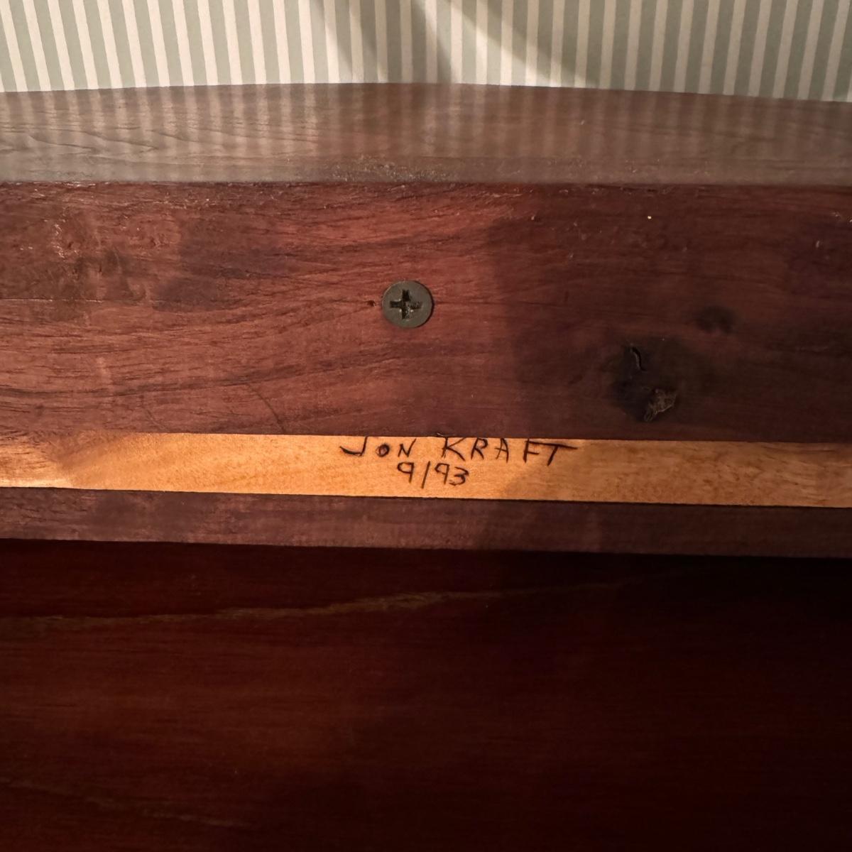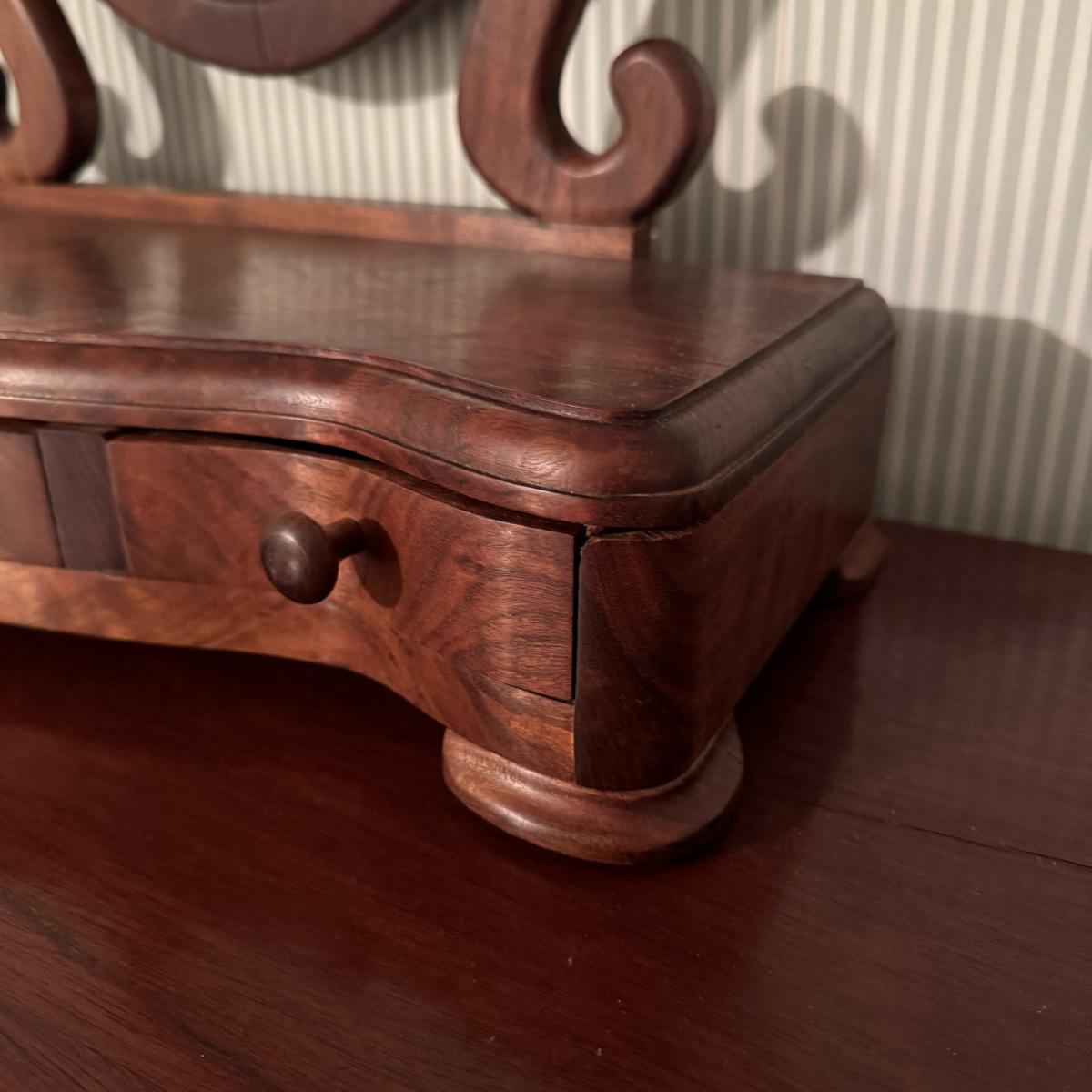 Portable wooden vanity mirror with drawers. Has signature on back Jon Kraft from maker. Red Velvet lined drawers. Mirror can tilt as needed. Measures 20” x 10” x 21.5”H Shipping available.