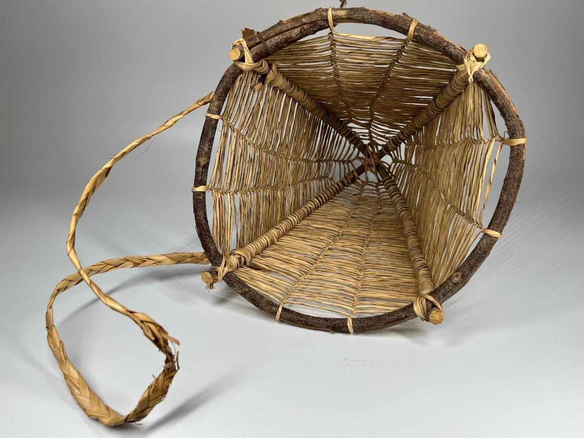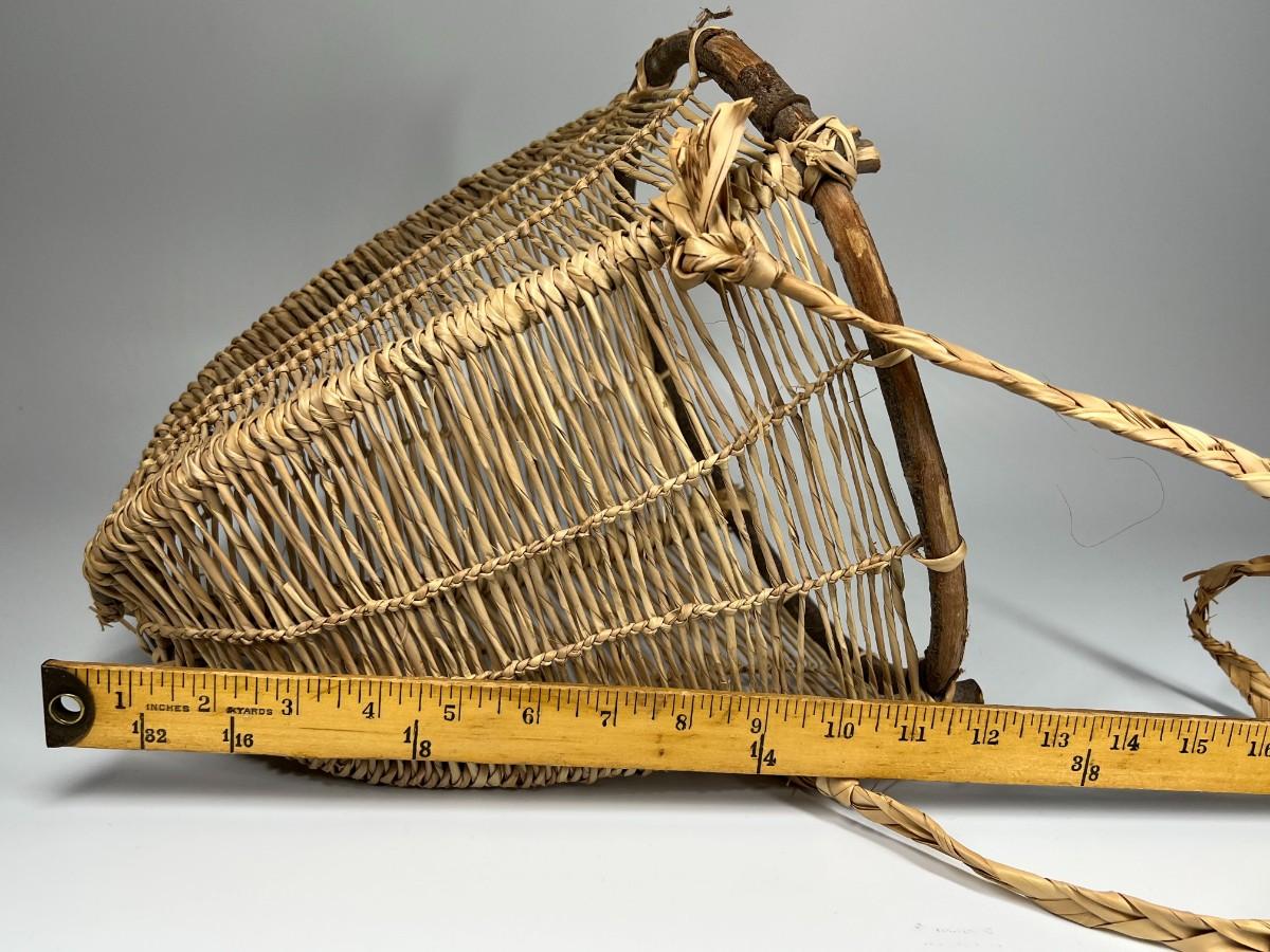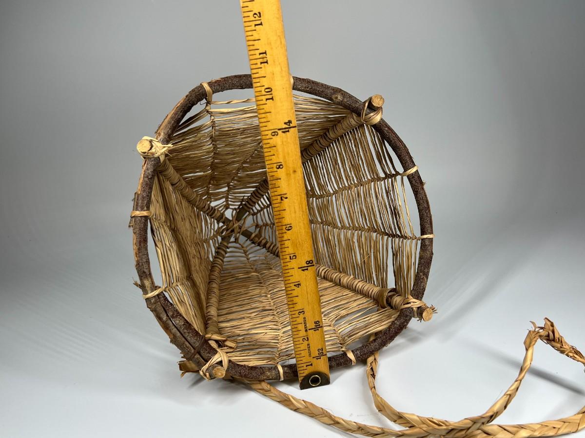 Handmade Wooden & Weaved Wicker Carrying Gatherer Basket, the strap has some tears and there is minor wear to the basket, but there is no signifncant damage and is in good displayable condition. Check pictures for more details and for sizing.