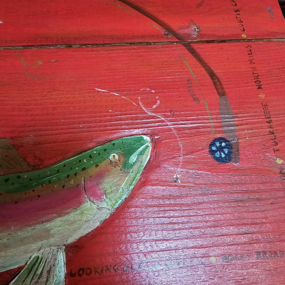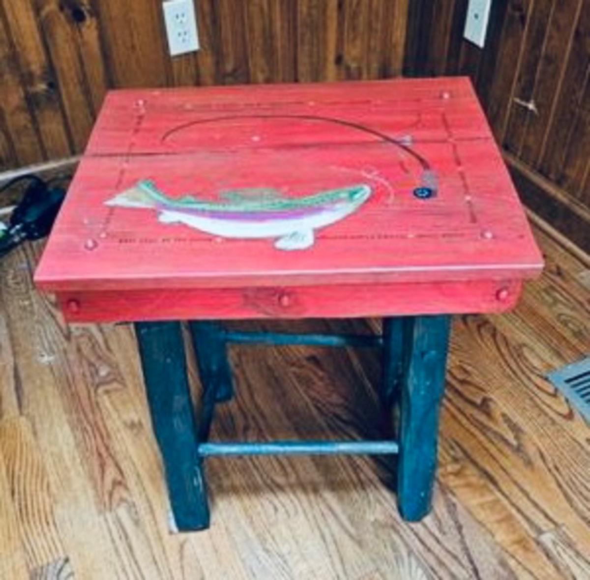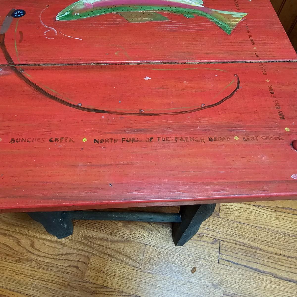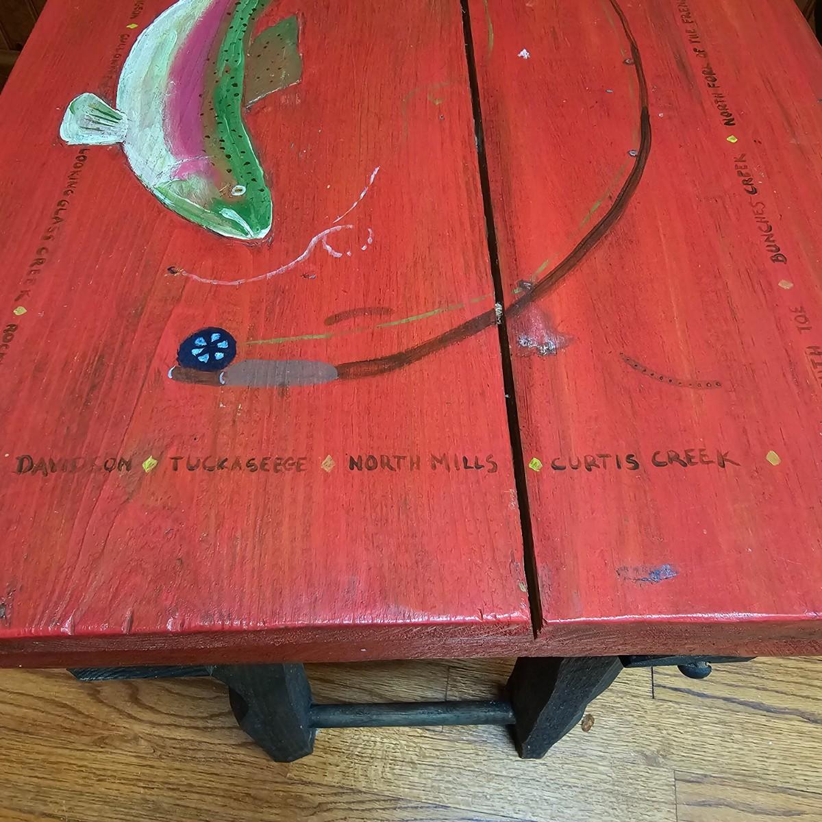 Rustic handmade wood table depicting a leaping trout and a fly rod. Various river names are placed around the edges of the table. Measures 19" x 16" x 21"H, signed by Don Harris and dated 2004. See photos for details. Local pickup only.