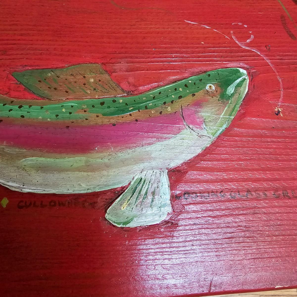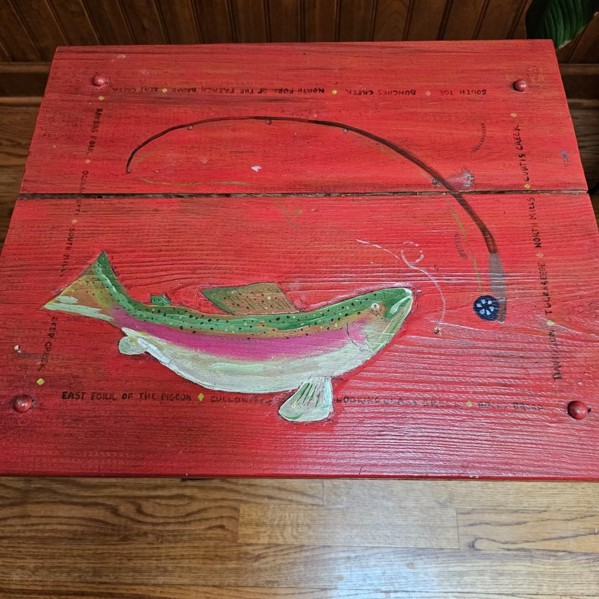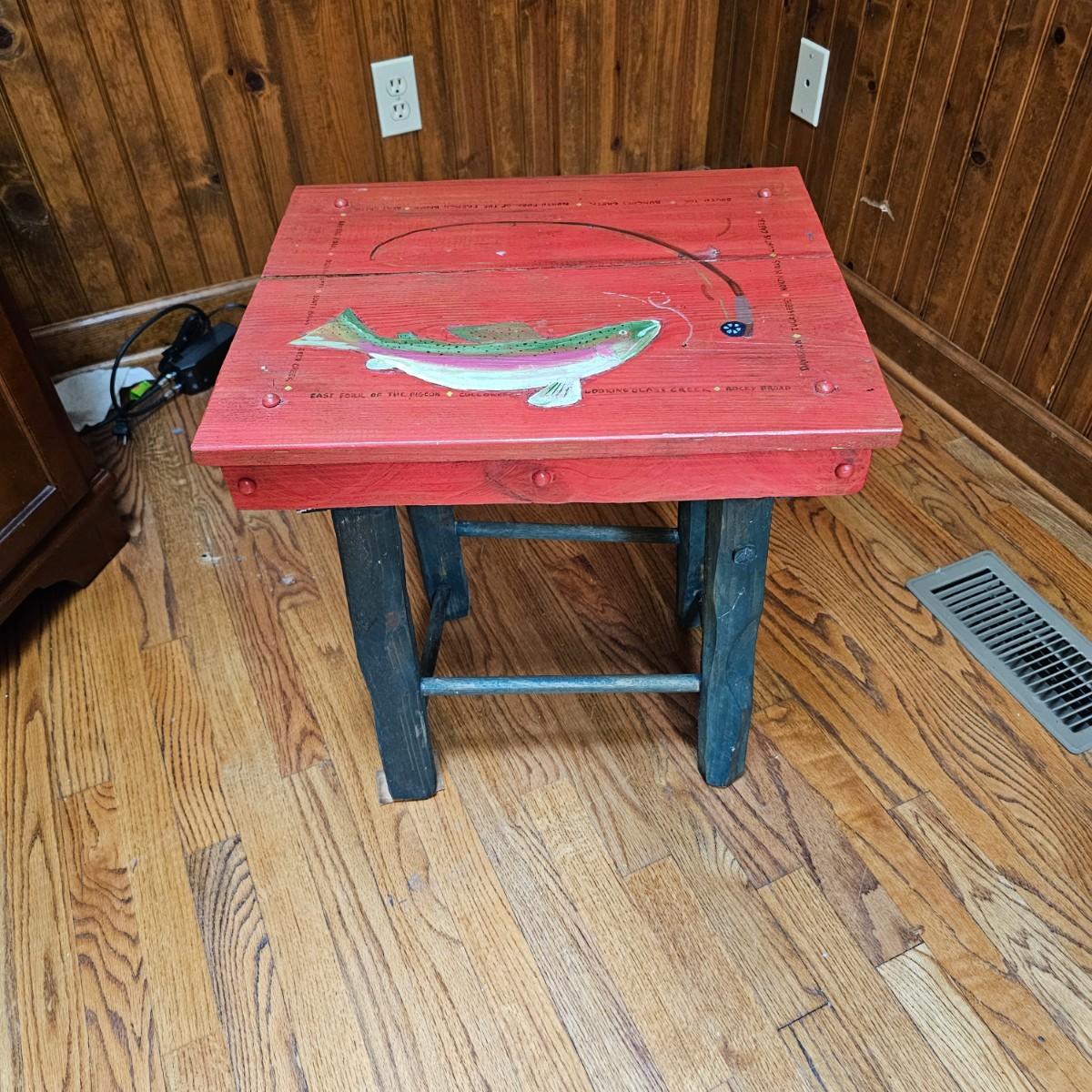 Rustic handmade wood table depicting a leaping trout and a fly rod. Various river names are placed around the edges of the table. Measures 19" x 16" x 21"H, signed by Don Harris and dated 2004. See photos for details. Local pickup only.