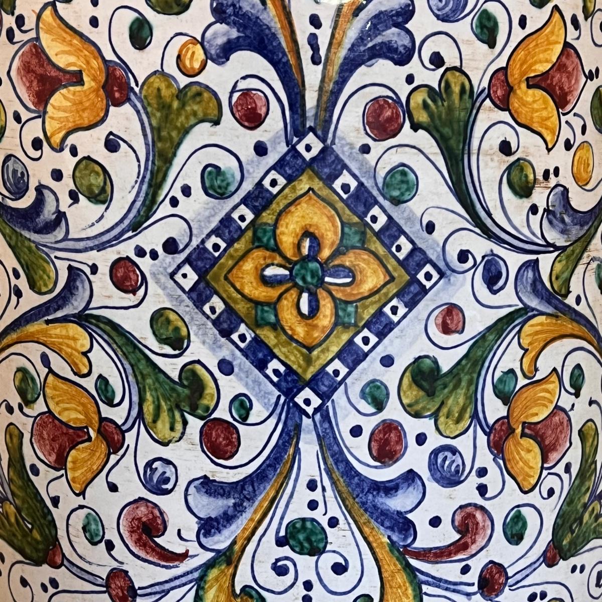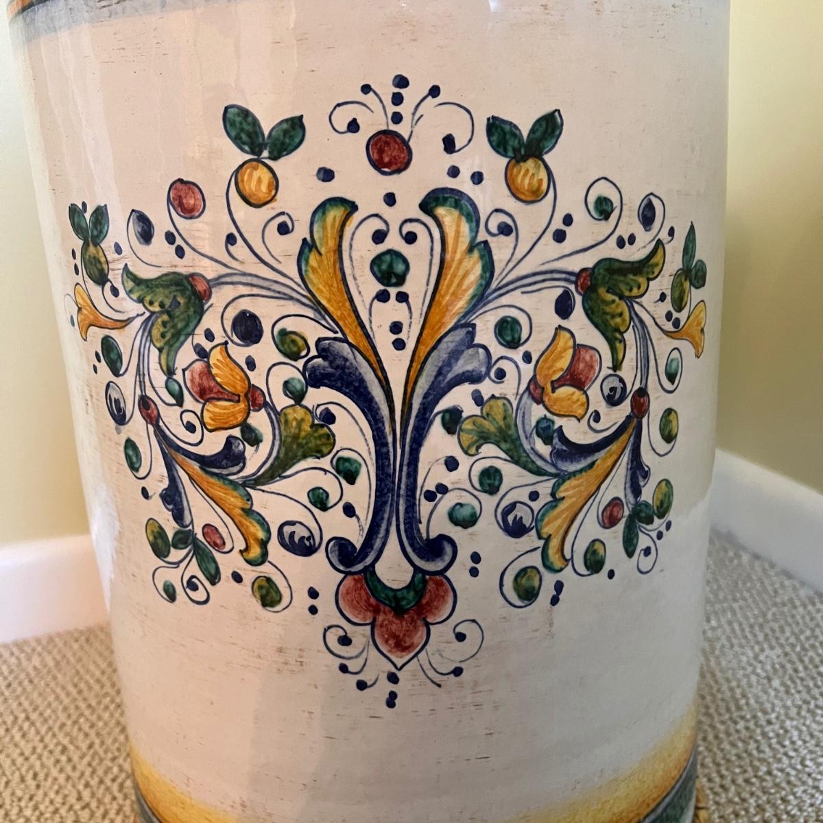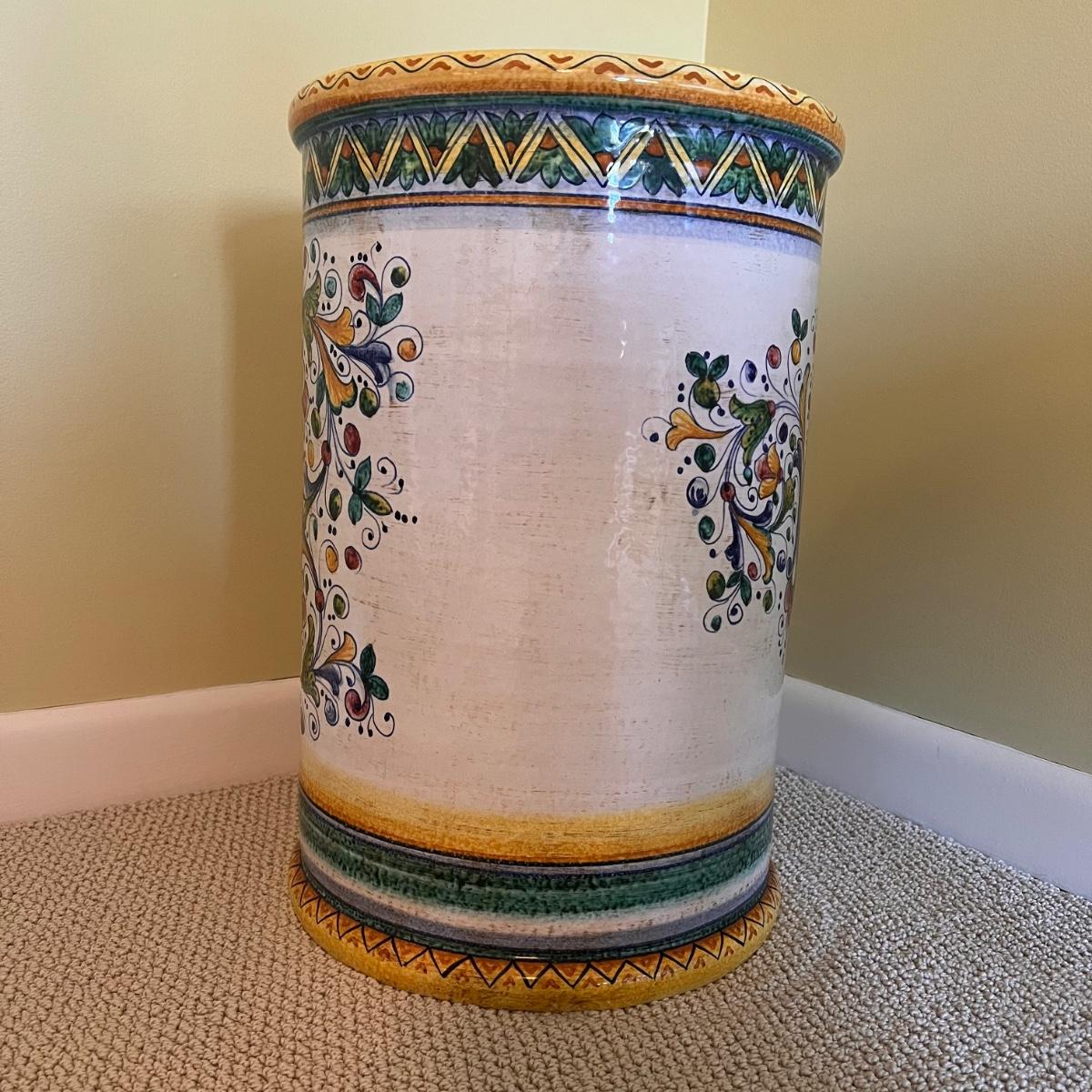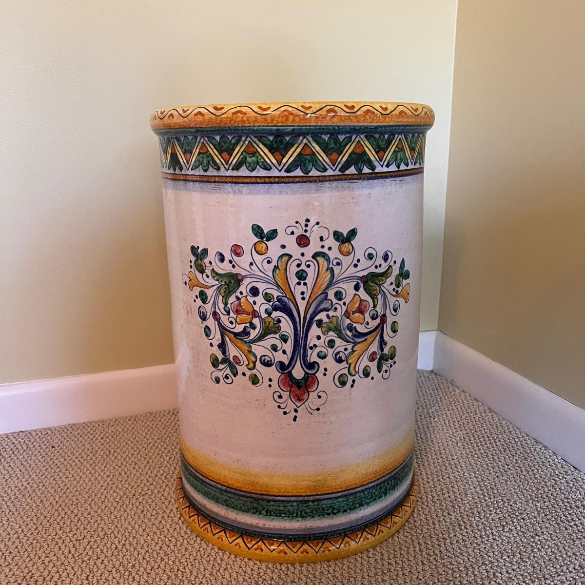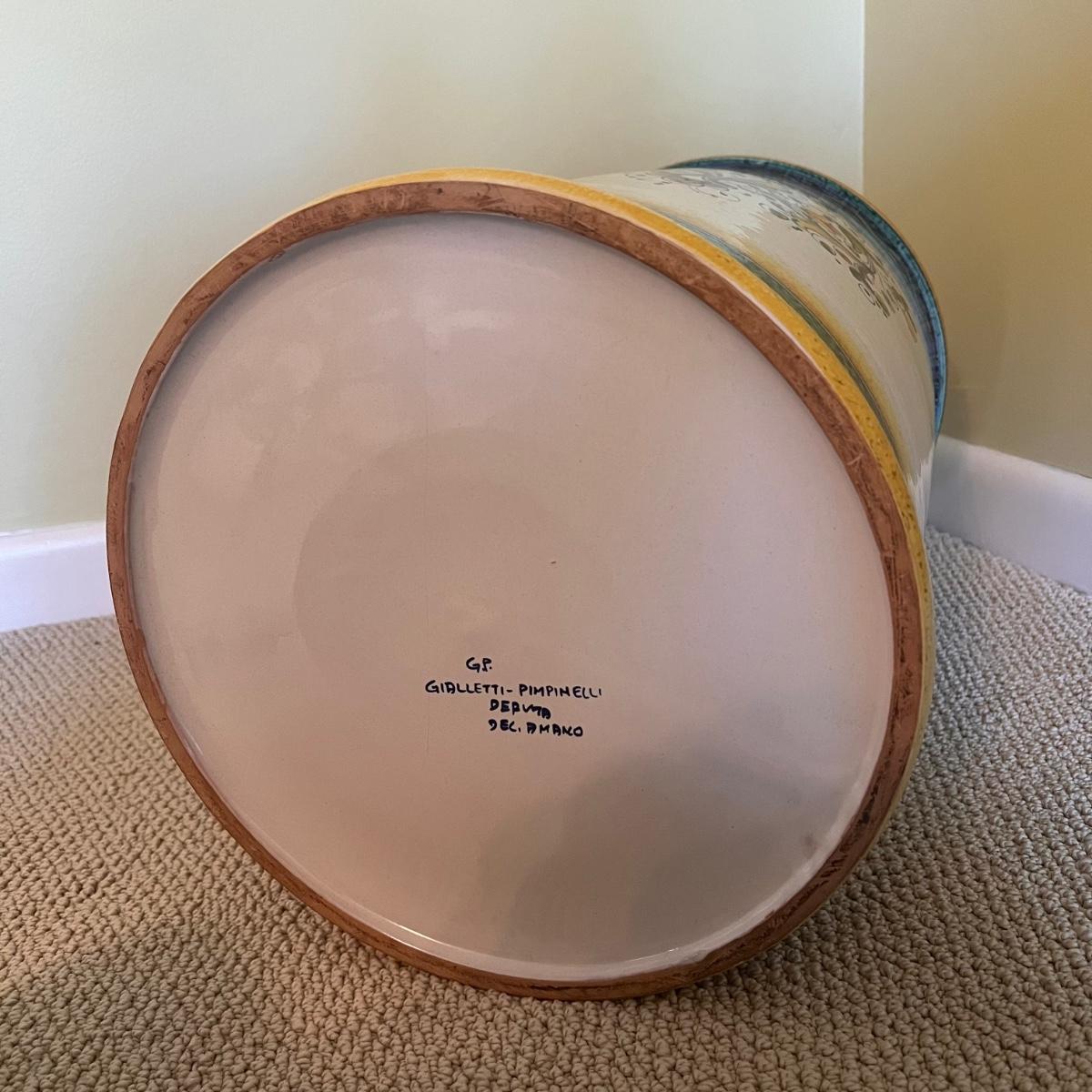 This ceramic planter measures 13"D x 19"H. It appears to be marked with "œGialetti-Pimpenelli" on the base of the planter. It has a crack on the base that is very faint "” see picture included. Shipping available. Shipping can be costly. We suggest contacting our preferred local shipping provider, Postage Express, with dimensions and getting an estimate before bidding: (828) 255-9250 or shipping@postageexpressnc.com.