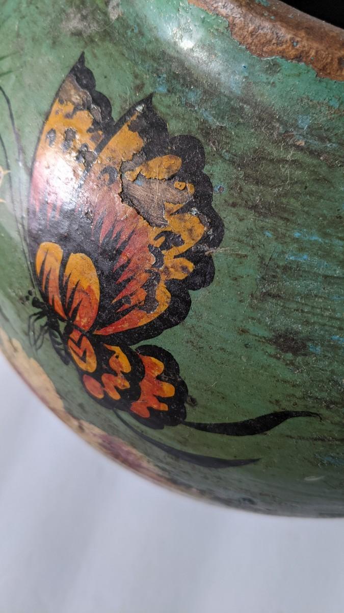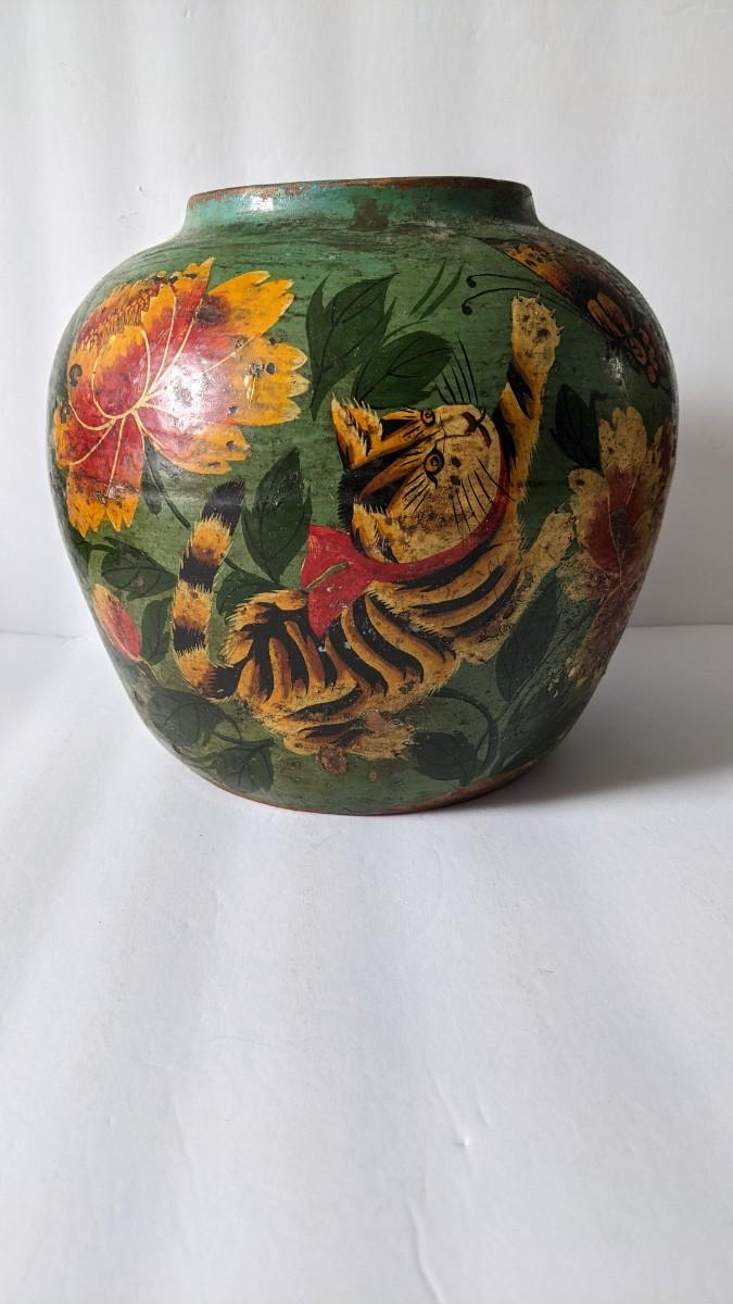 a stunning and with clear age handpainted clay pot with no markings on base. Features a beautiful asian themed playful cat and flower. Pot is in great condition for age with minimal wear for age and no chips or cracks noted. Approx. 8.5"x8" with 4.25" opening.