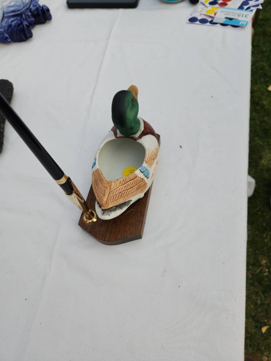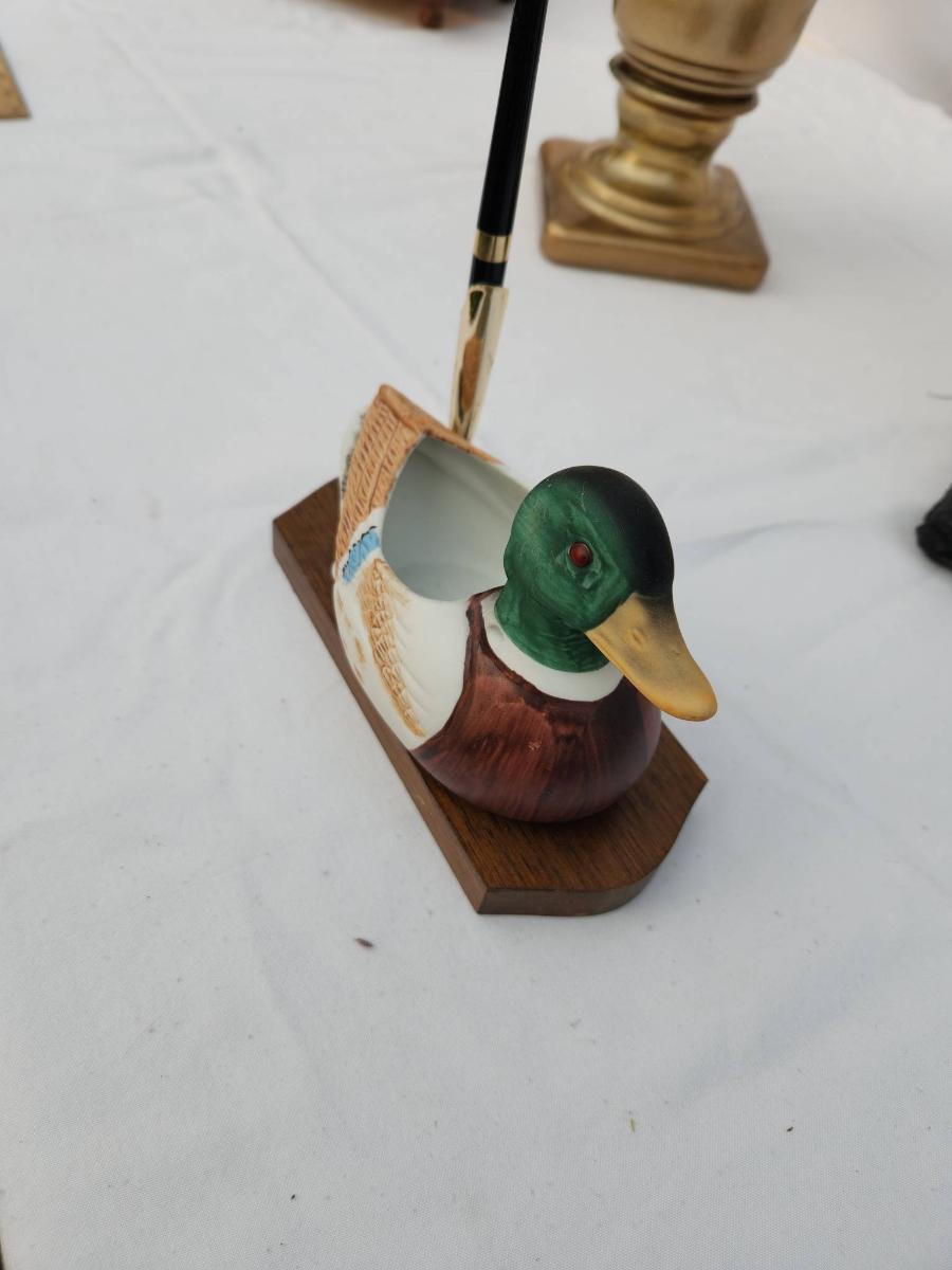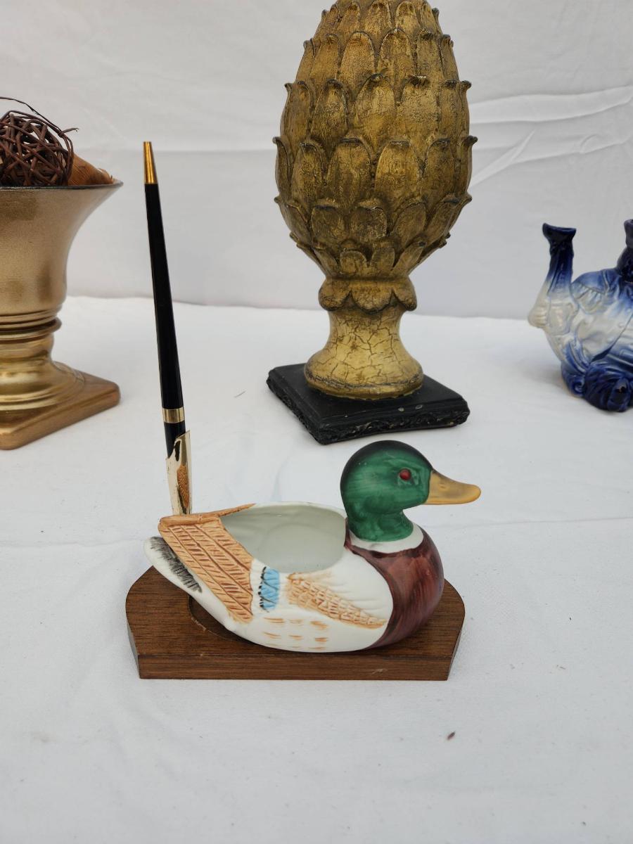 Hand-painted duck-shaped pen holder featuring a detailed mallard design. Made of wood and possibly composite material, it rests on a rectangular wooden base with a pen slot. Includes a black and gold-tone pen. Suitable for decorative or functional desk use. Measures unknown as dimensions are unspecified.