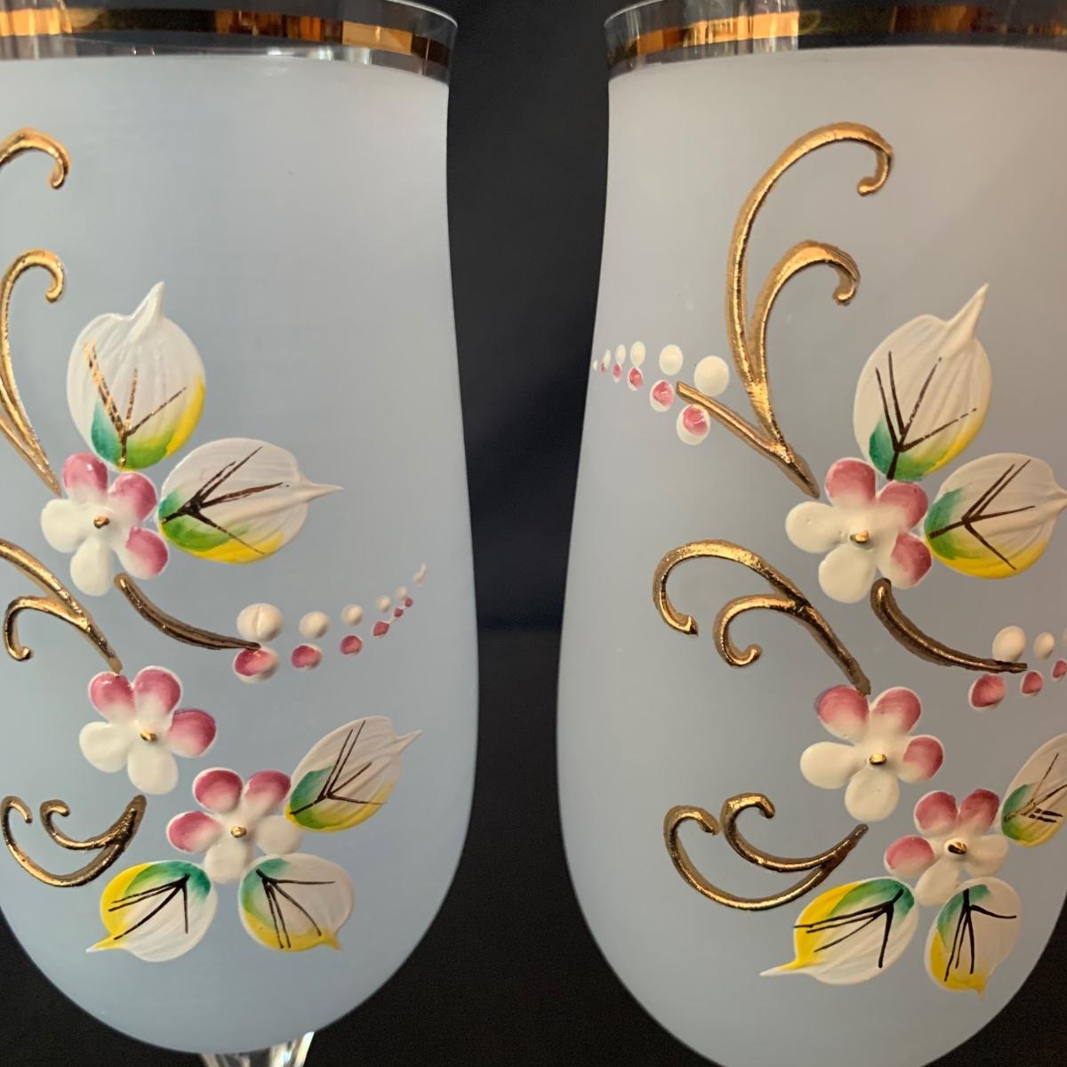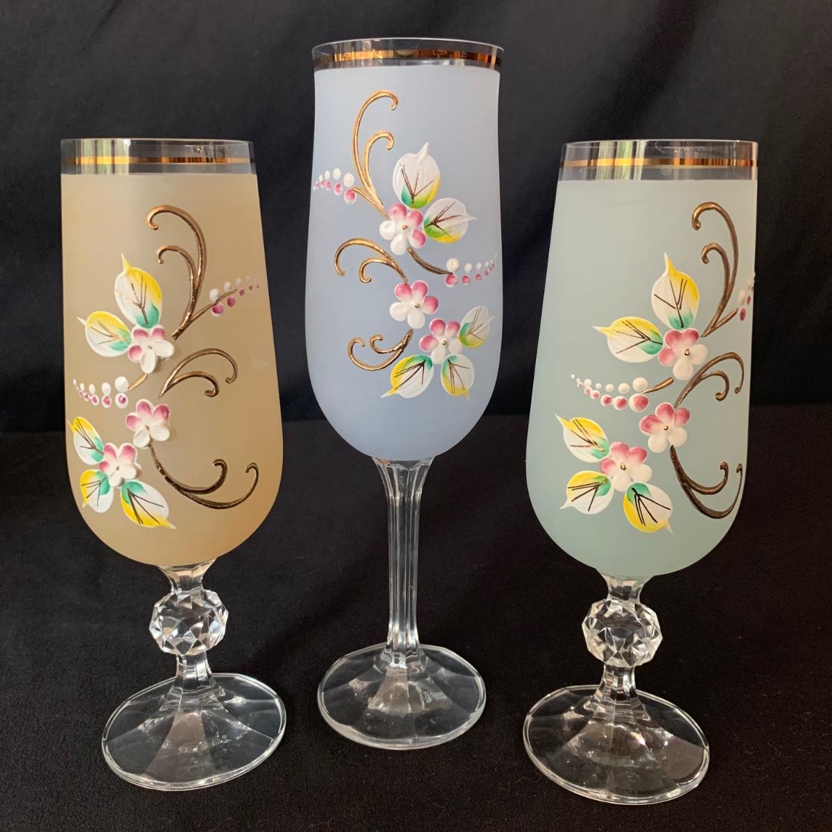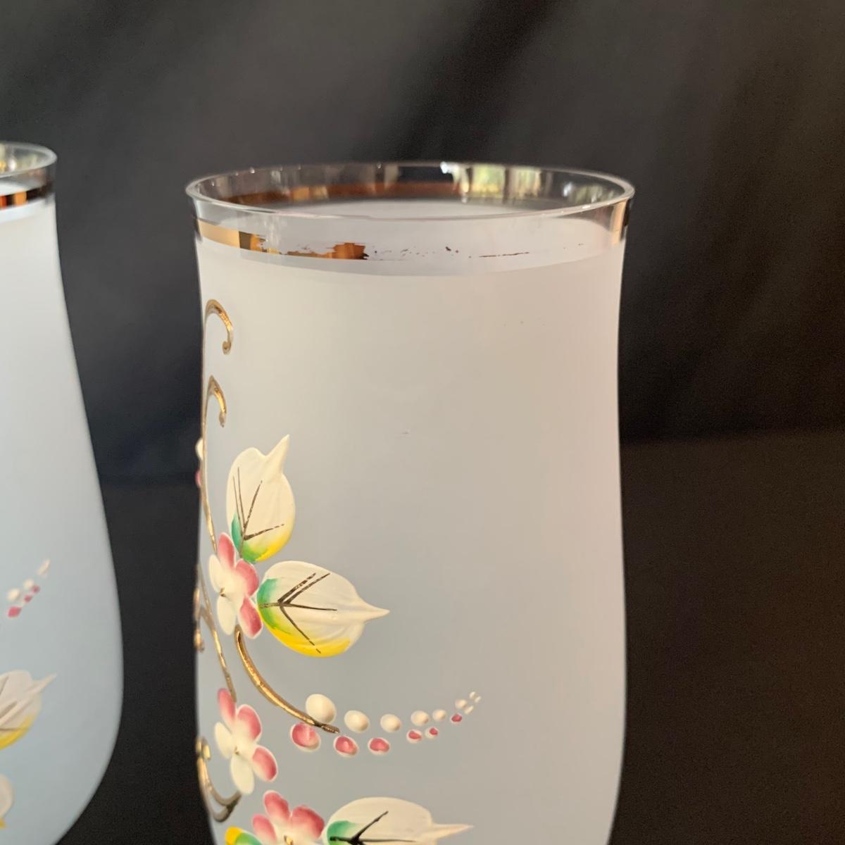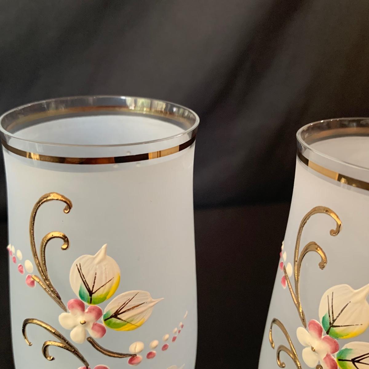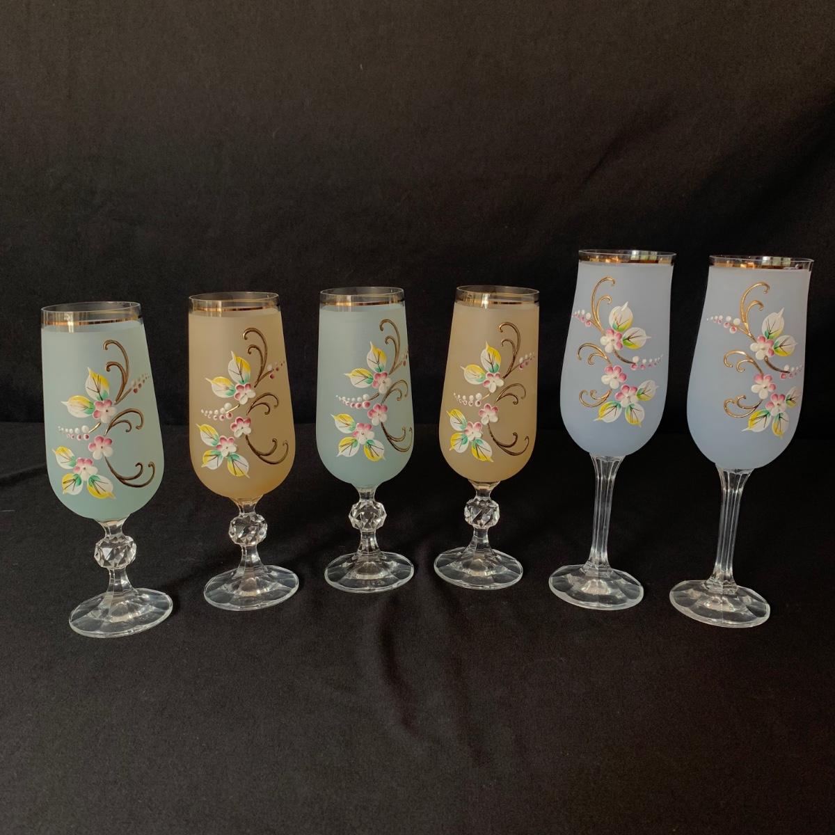 Set of six lovely hand-painted stemmed glasses featuring flowers and metallic gold accents over pastel shades of frosted glass. Two have baby blue frosted glass and are 7.75”H. The other four feature a ball on the stem and are 6.75”H. Two of these have a light creamy yellow background and the other two are a light blue that is just a slightly different shade than the other blue glasses. The golden ring around the rim of one of the taller glasses is worn; see photos.