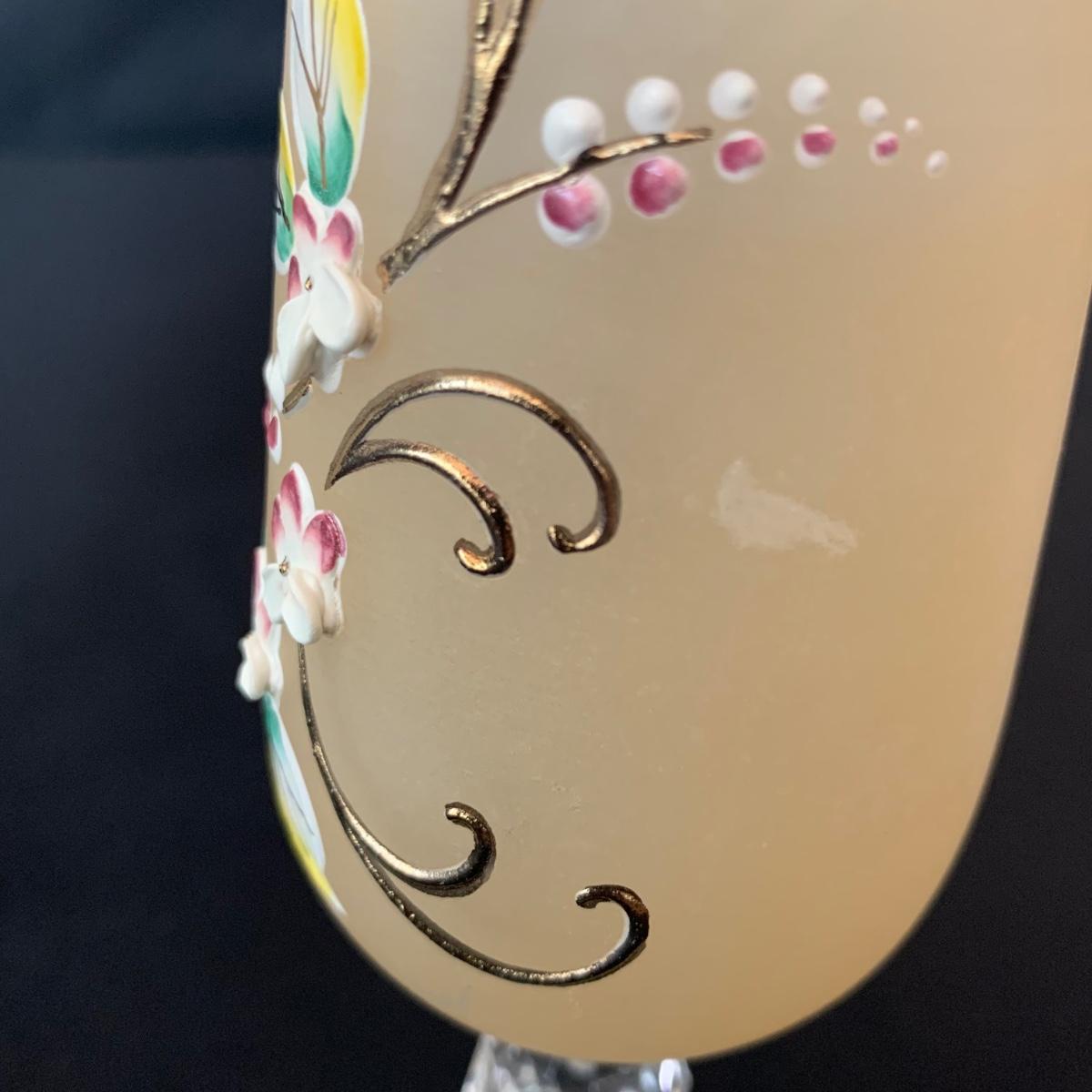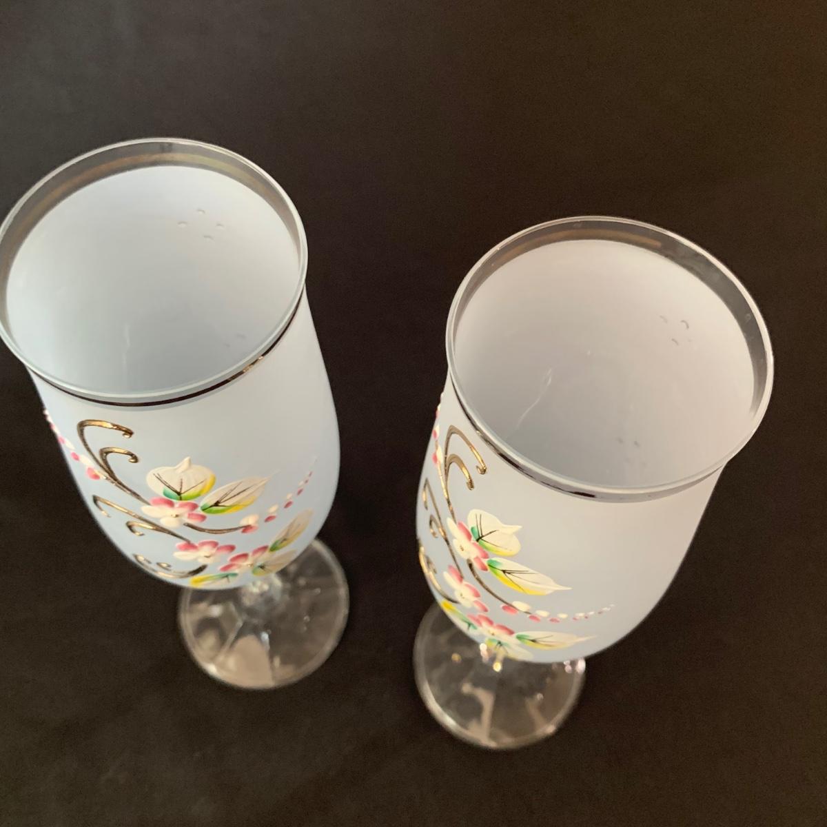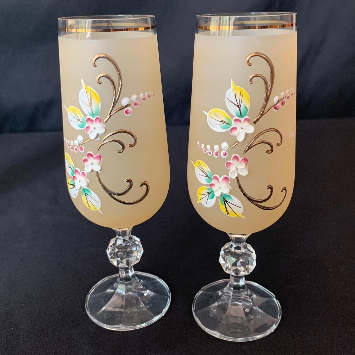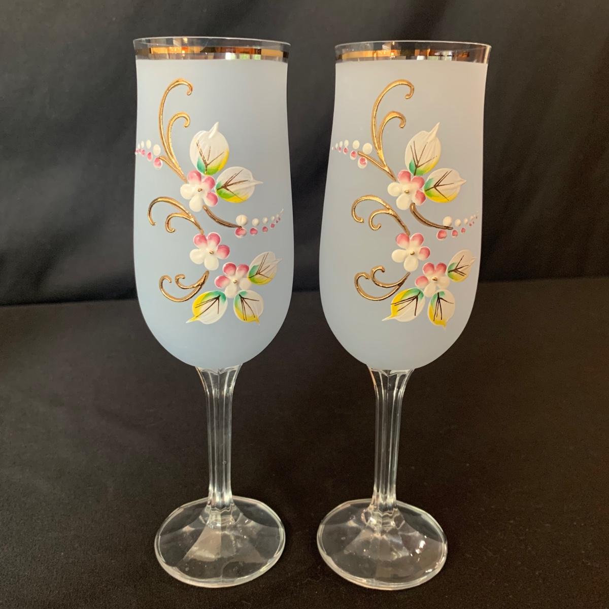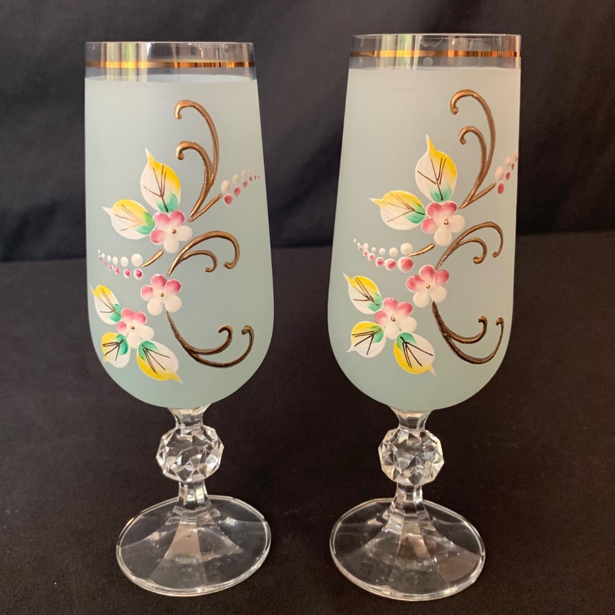 Set of six lovely hand-painted stemmed glasses featuring flowers and metallic gold accents over pastel shades of frosted glass. Two have baby blue frosted glass and are 7.75”H. The other four feature a ball on the stem and are 6.75”H. Two of these have a light creamy yellow background and the other two are a light blue that is just a slightly different shade than the other blue glasses. The golden ring around the rim of one of the taller glasses is worn; see photos.