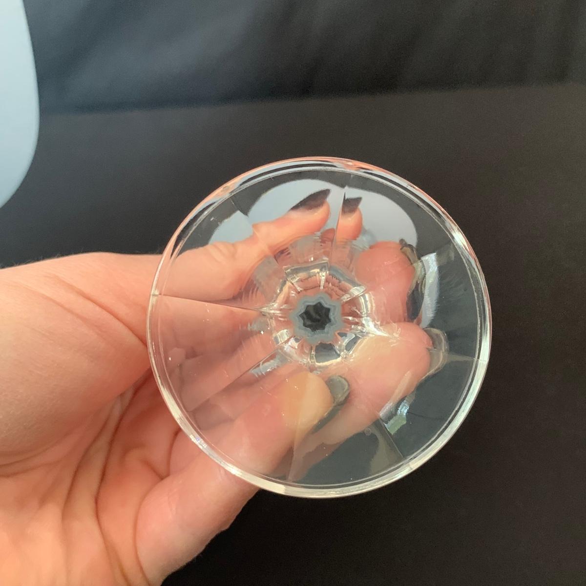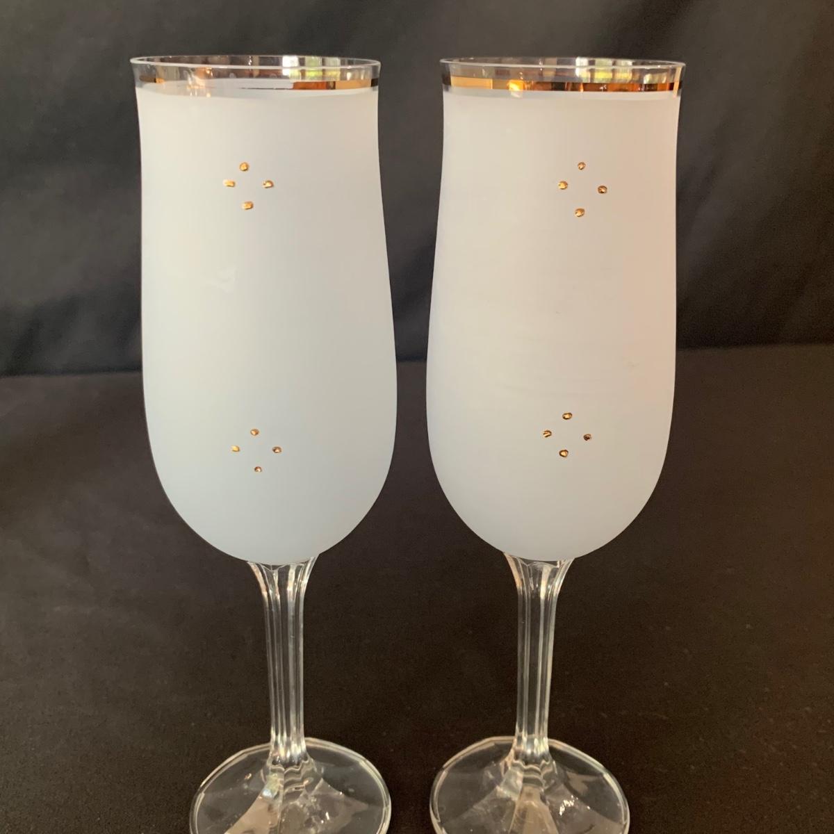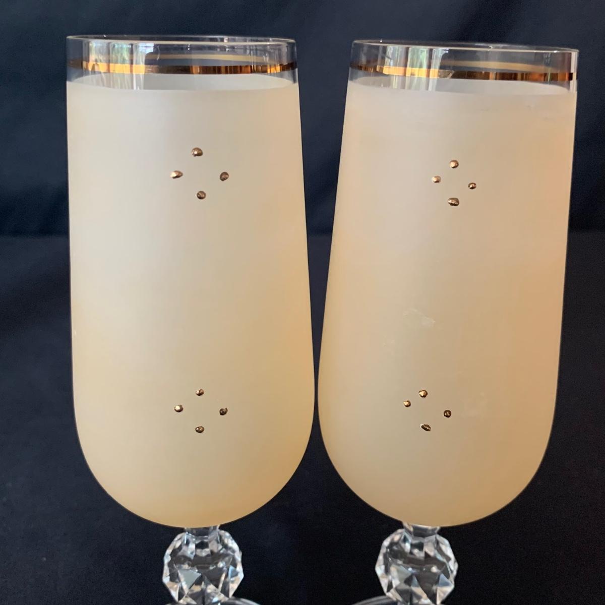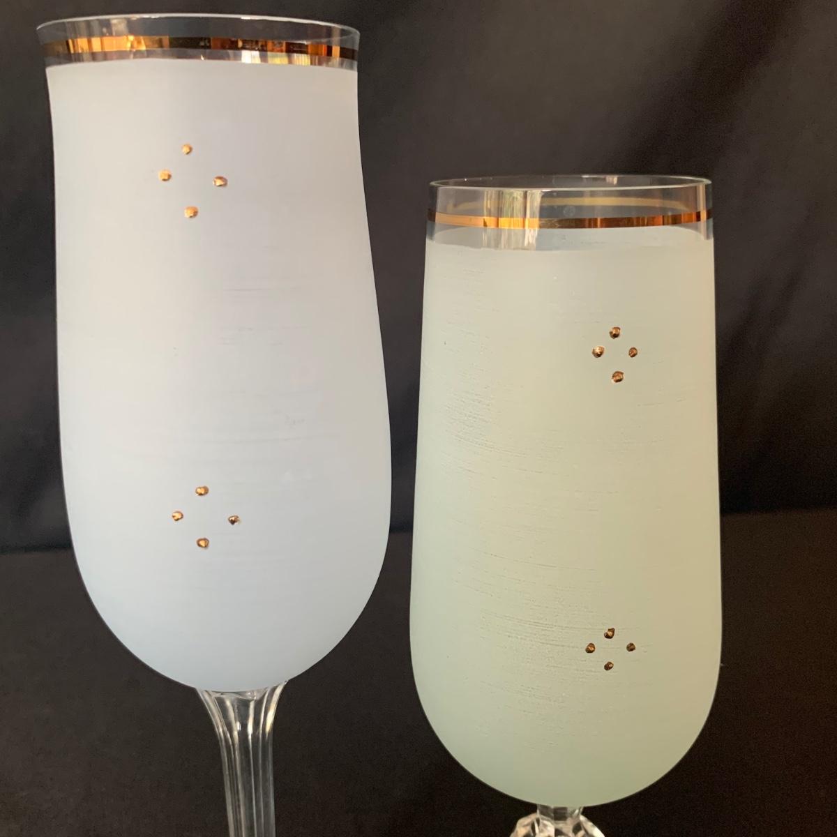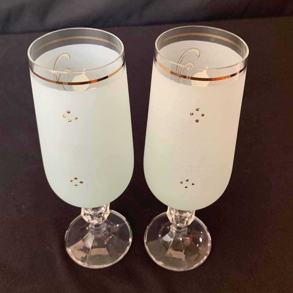 Set of six lovely hand-painted stemmed glasses featuring flowers and metallic gold accents over pastel shades of frosted glass. Two have baby blue frosted glass and are 7.75”H. The other four feature a ball on the stem and are 6.75”H. Two of these have a light creamy yellow background and the other two are a light blue that is just a slightly different shade than the other blue glasses. The golden ring around the rim of one of the taller glasses is worn; see photos.