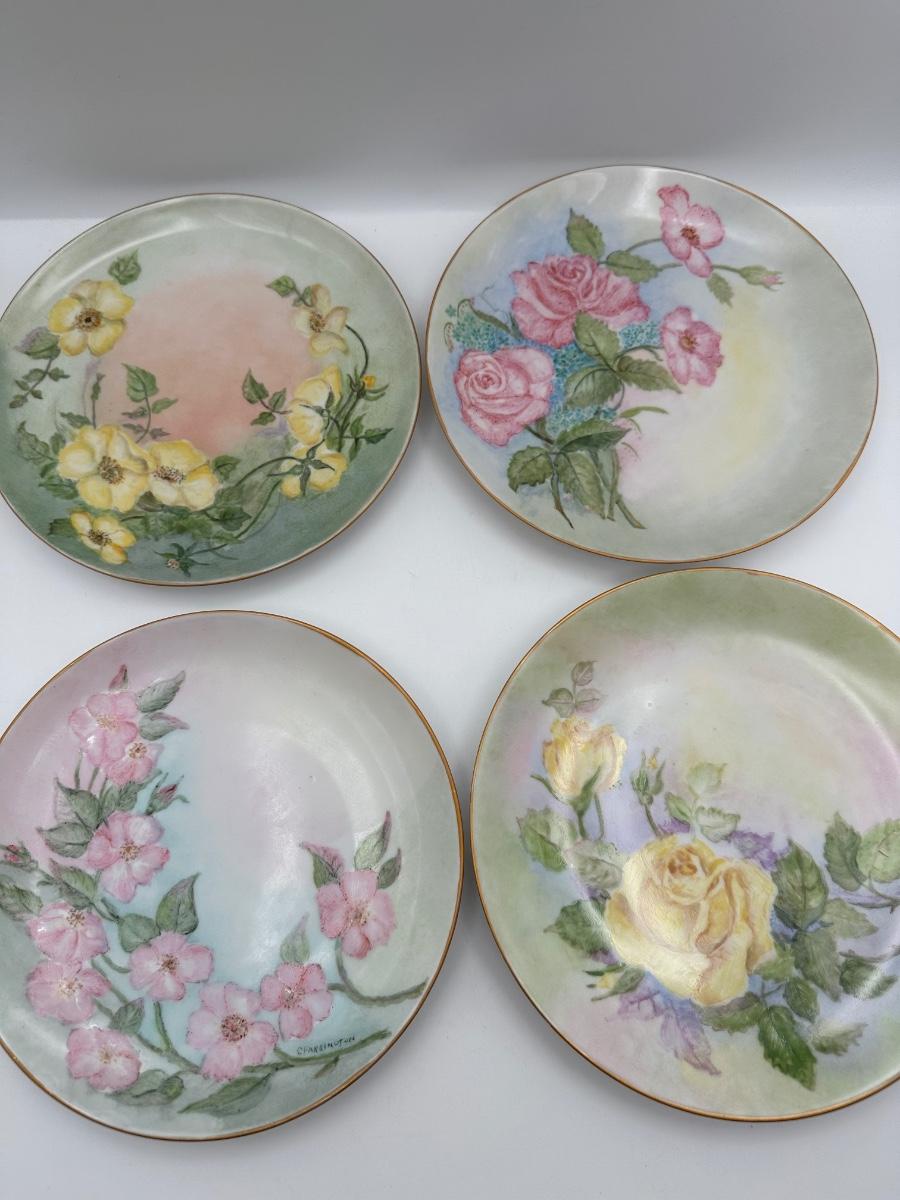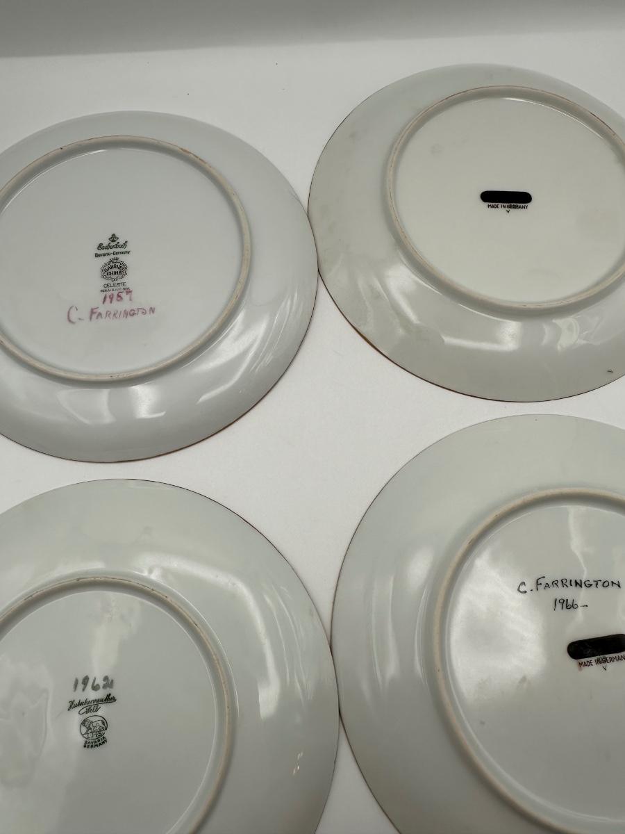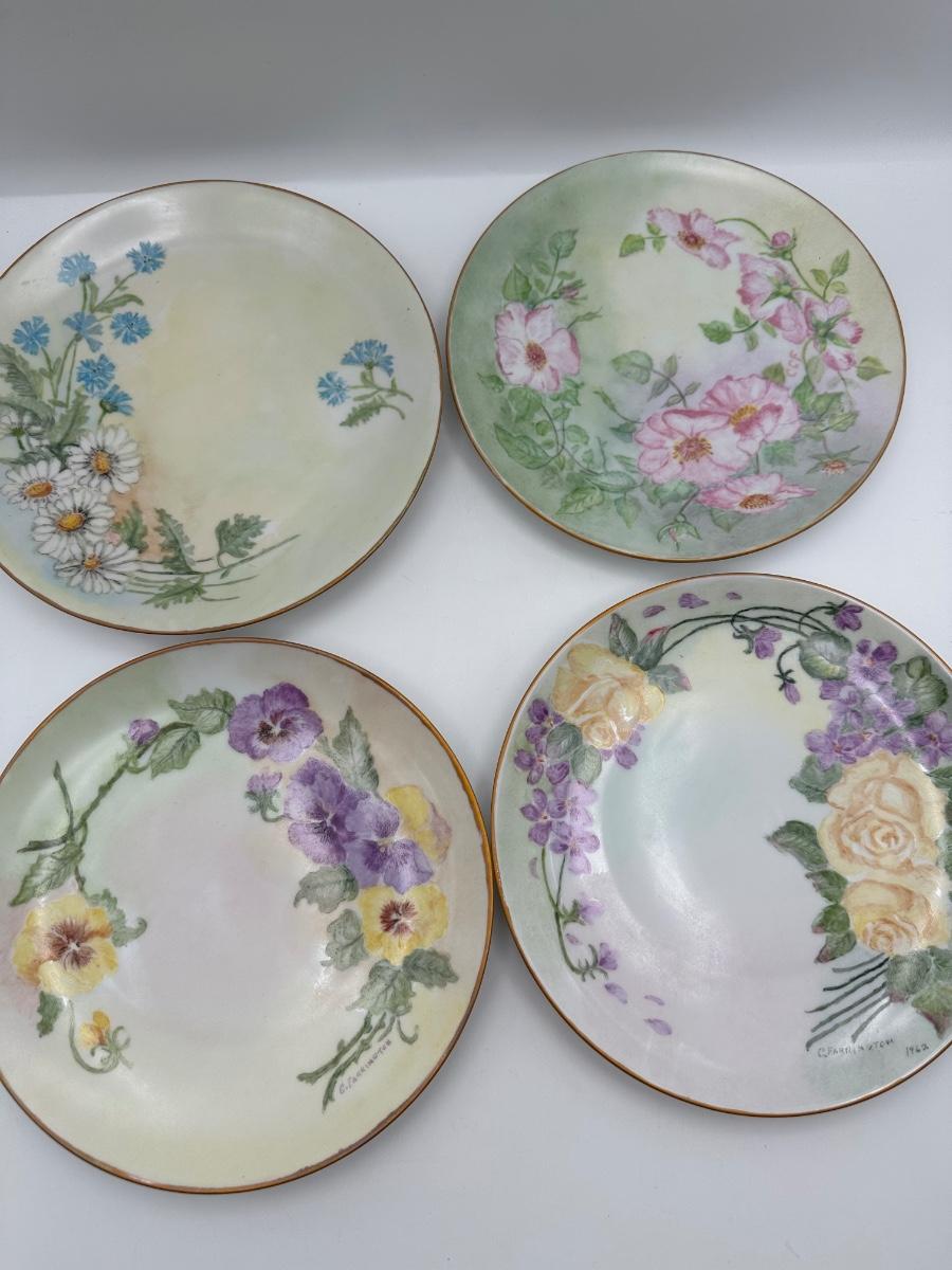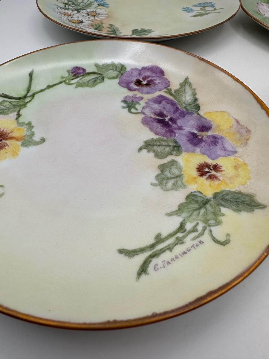 Set of 15. Collection of decorative porcelain plates, each hand-painted with floral designs. The plates are signed and dated by C. Farrington, a relative of the estate, with dates ranging from 1952 to 1966.
