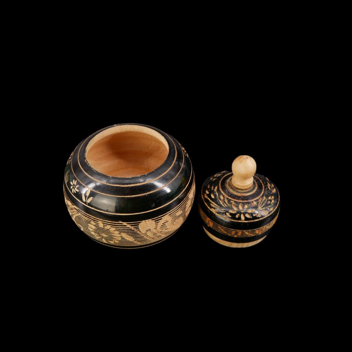 Handmade and hand-painted clay plates from Greece. Largest measures with a diameter of 5.5" and smallest measures with a diameter of 4". All great condition, small scuffing and chipping paint due to age. Each have a hole in the back to be hung by string. Etched wooden pot with lid floral designed art piece is unmarked and unsigned and measures L 3.5" x H 4.5". Weight of lot is 1 lb. Stands not included. (D17)