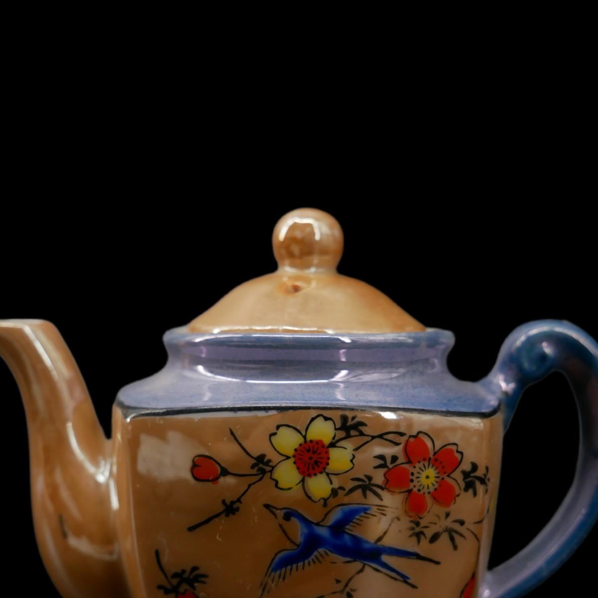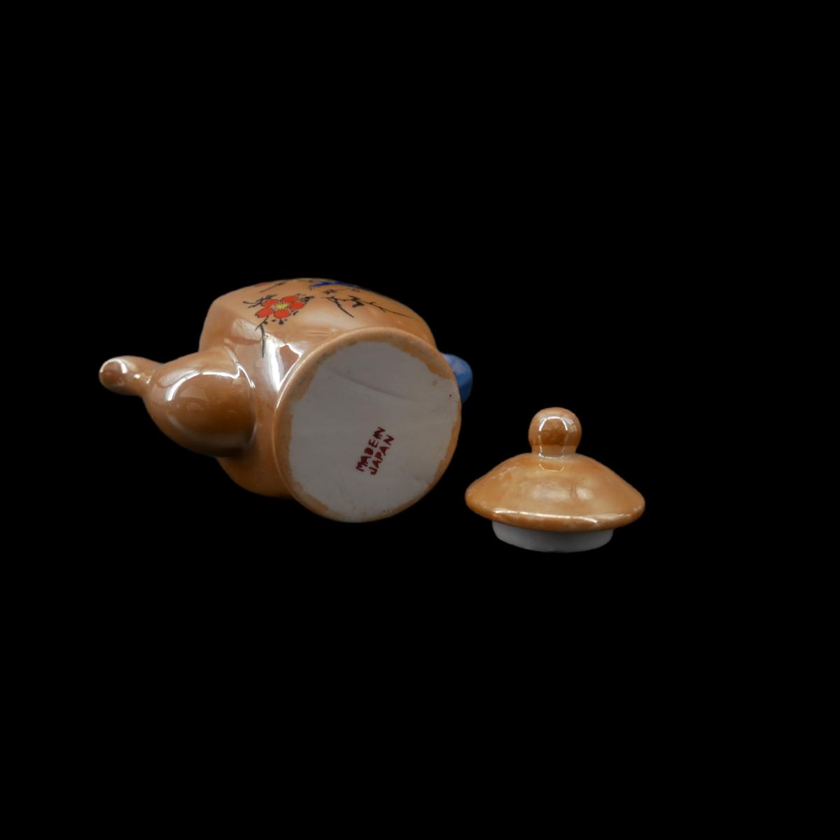 Hand-painted peach and blue luster miniature teapot, made in Japan. Gorgeous depiction of birds and flowers. Overall quality is good, some wear to paint from age. Measures L 4.5" x H 4" X W 2.5". Weighs 4.3 oz. (G15)
